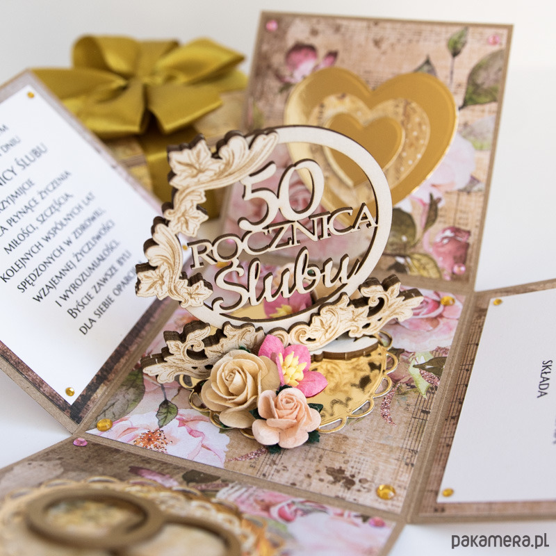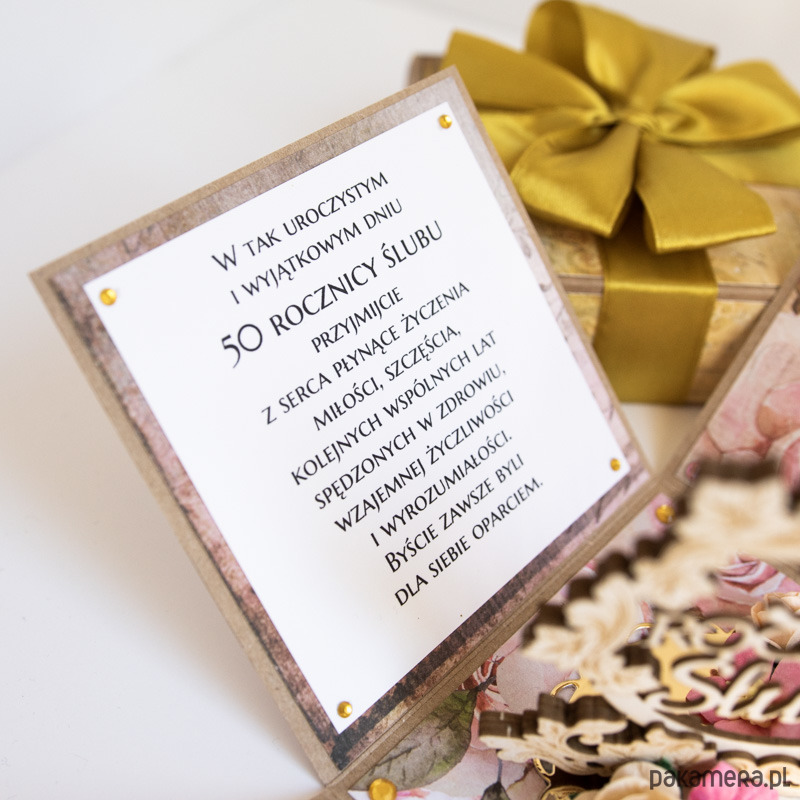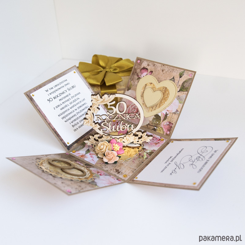 Ręcznie robiona kartka z okazji 50 rocznicy ślubu w formie rozkładanego pudełeczka.