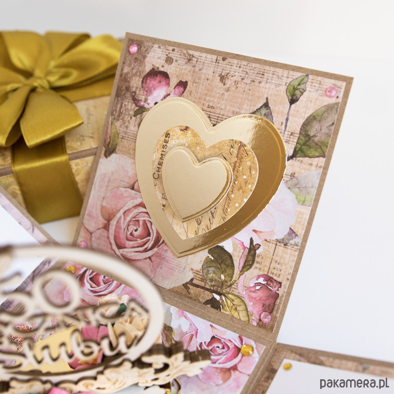 Na środku pudełeczka znajduje się dekoracja z papierowymi kwiatuszkami, na ściankach motyw serca, życzenia dla solenizantów, miejsce na podpis oraz motyw splecionych obrączek.