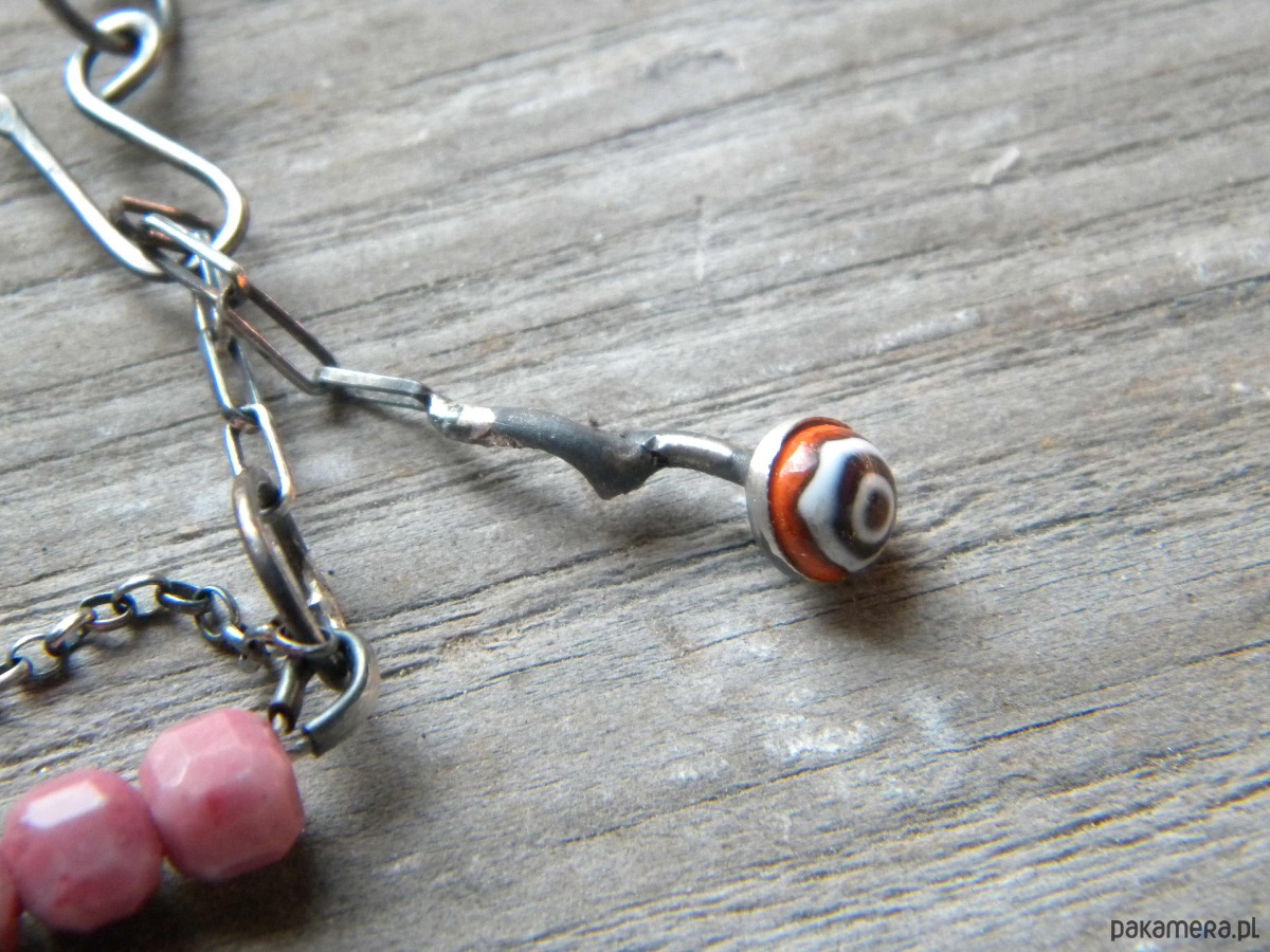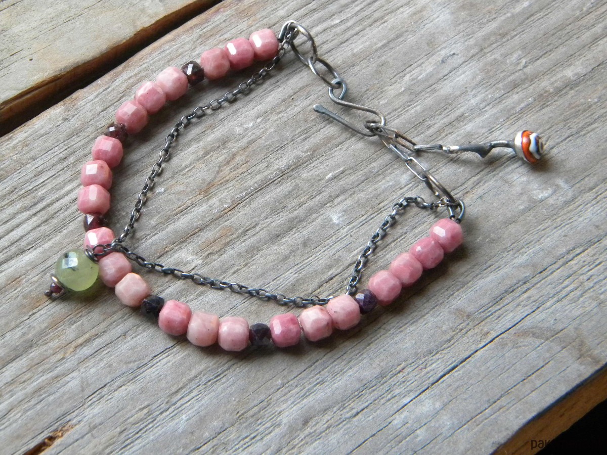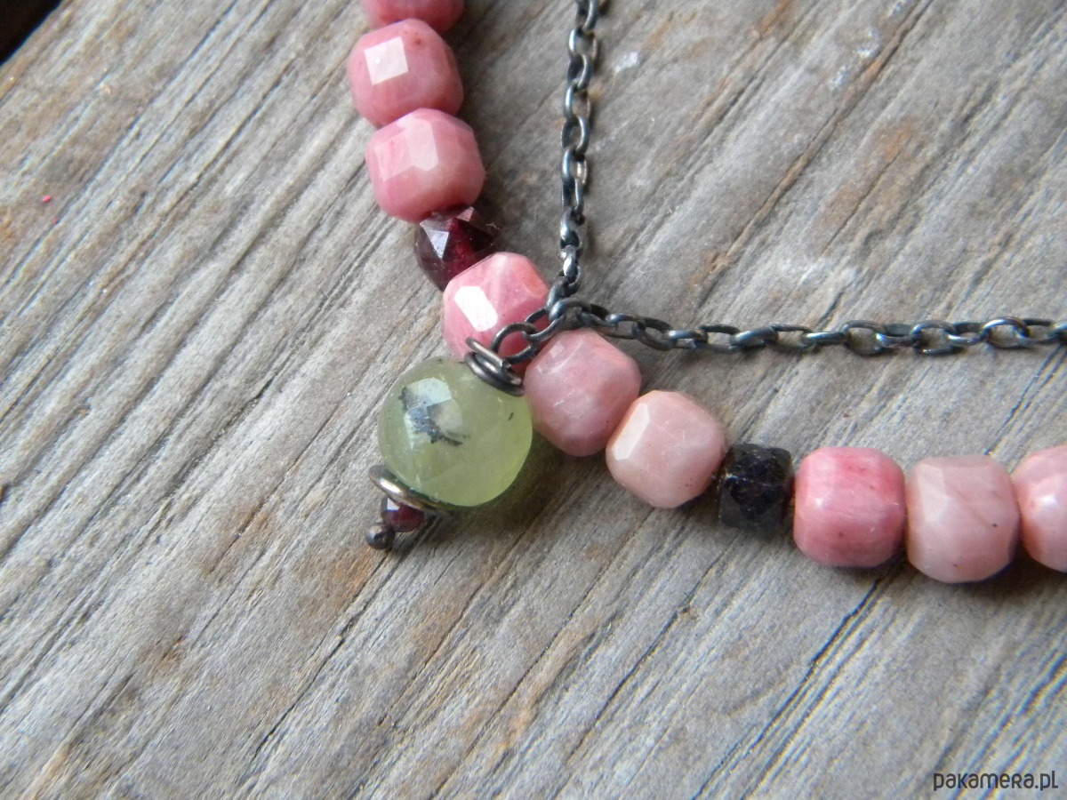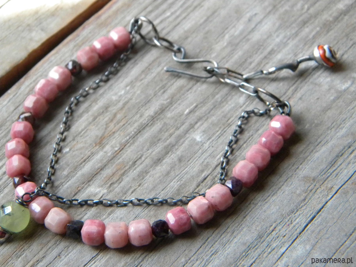 bransoletka z oksydowanego srebra 925 , rodonitów (6mm) granatów , prehnitu i szkła.
