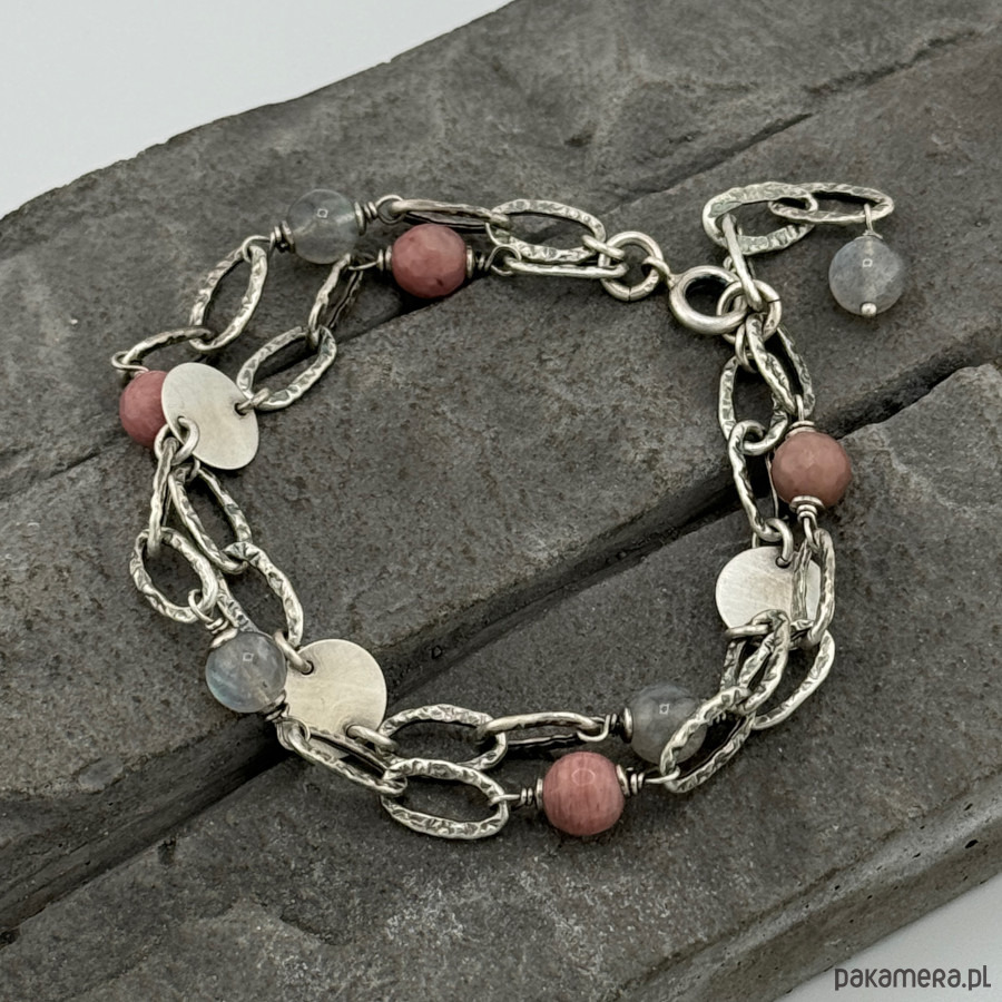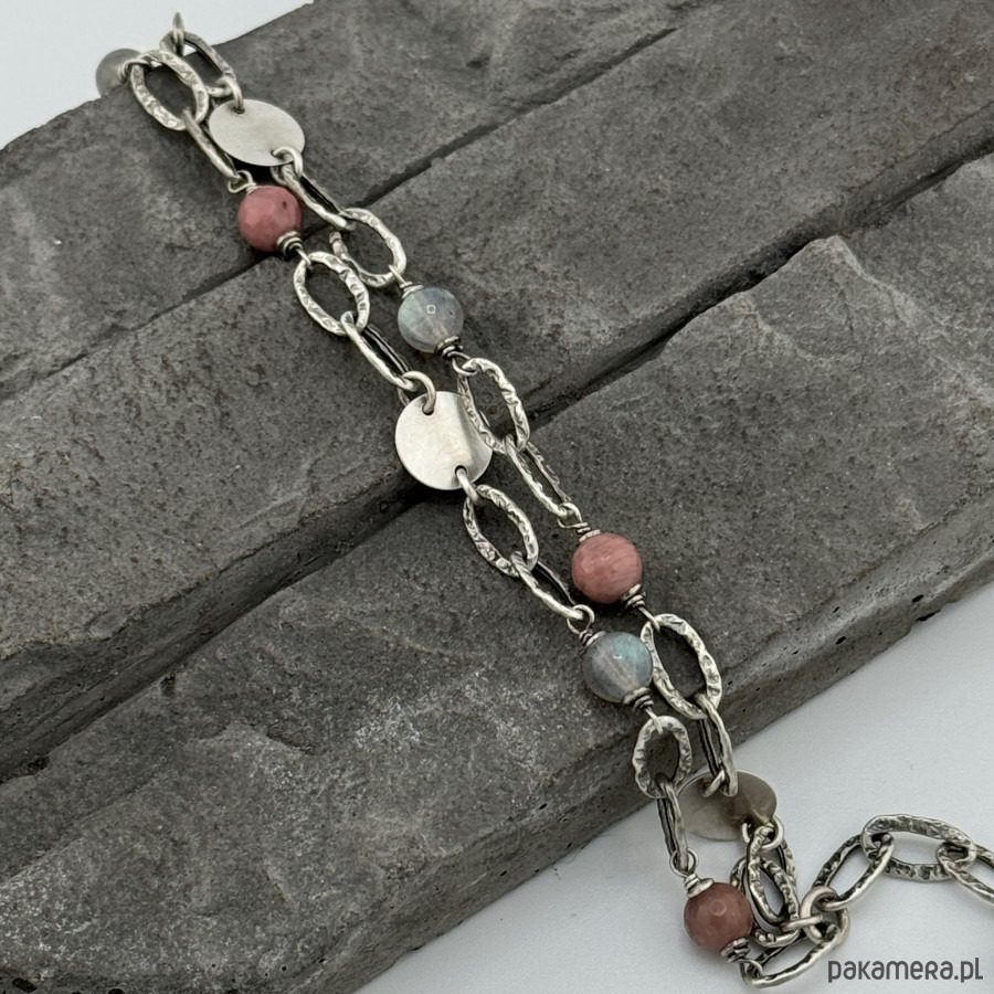Modna i kobieca bransoletka na co dzień i nie tylko. Wykonana w całości z oksydowanego srebra próby 925 oraz 6 mm kulek rodonitu i labradorytu. Wielkość ogniw łańcuszka to 11x5,5 mm, wielkość wplecionych srebrnych blaszek to 1 cm. W mojej galerii kolczyki do kompletu. Całkowita długość bransoletki to 18 cm plus regulacja 2 cm. Ozdobnie zapakowana.