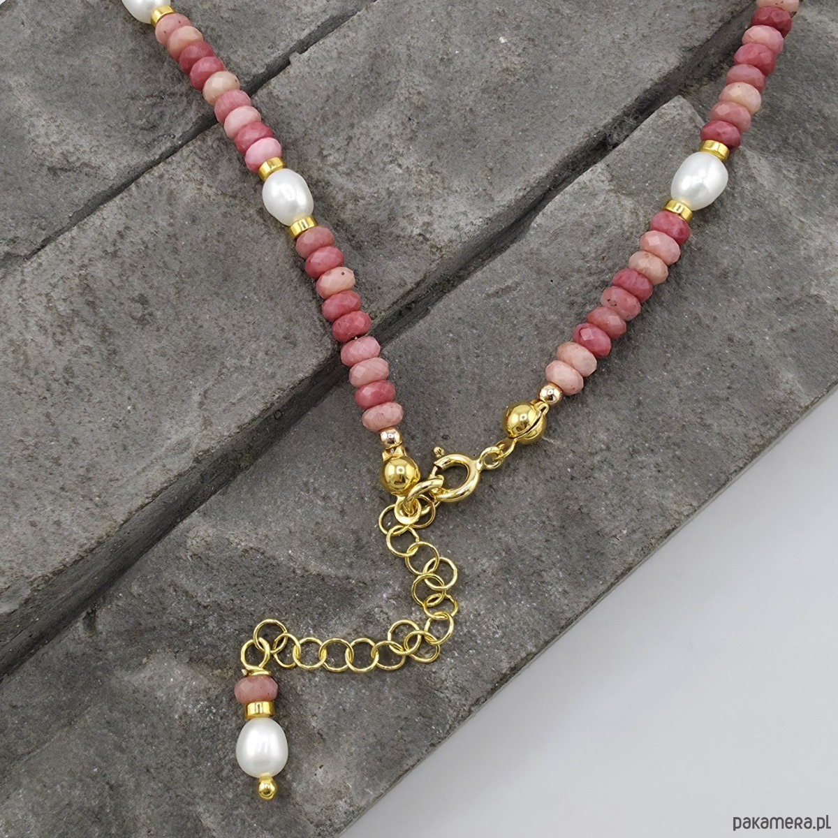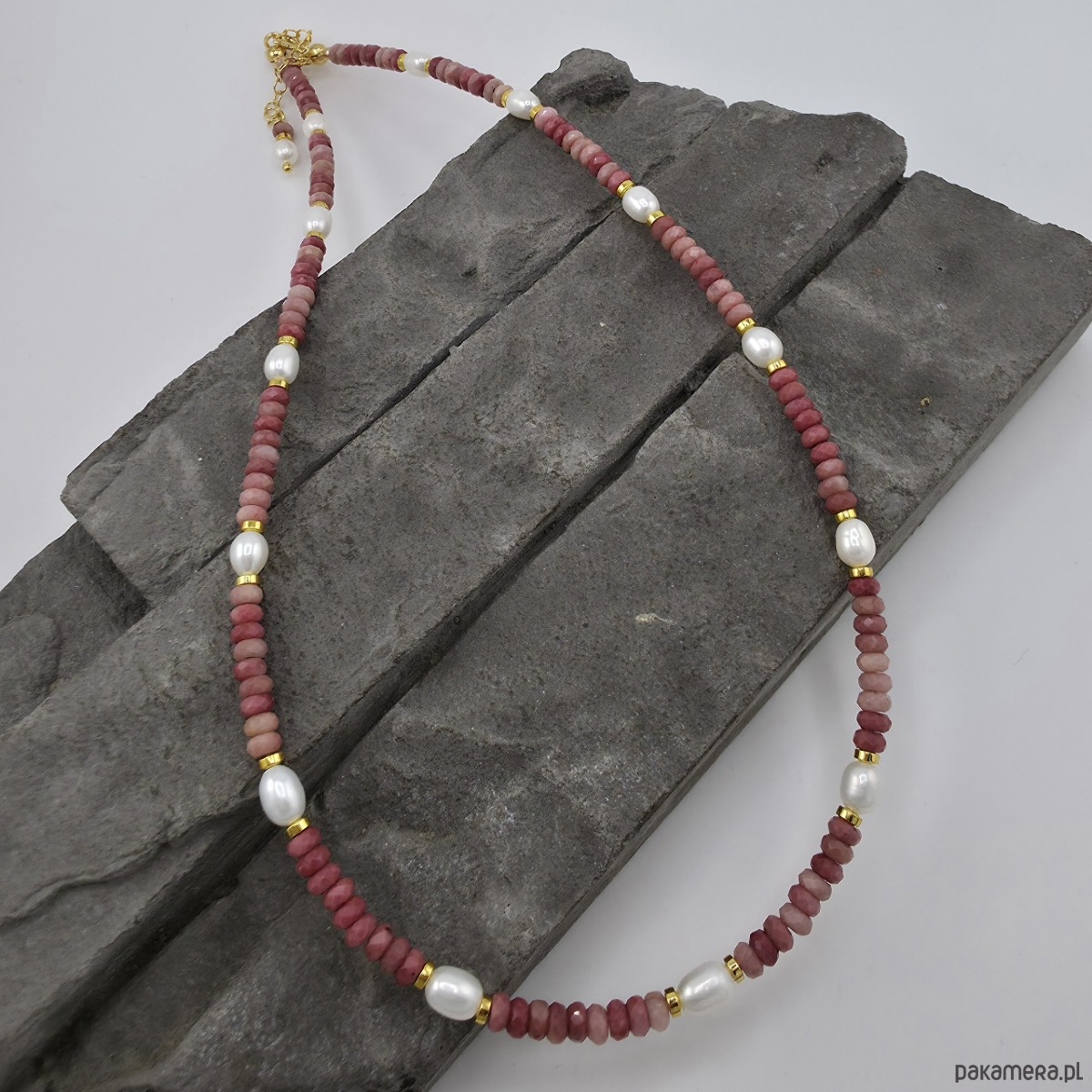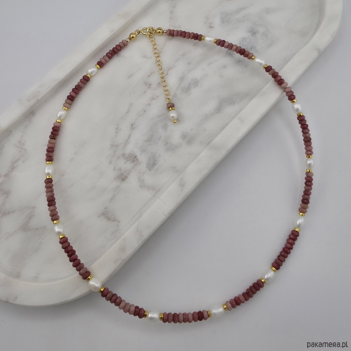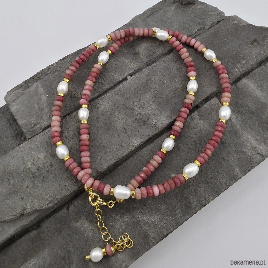 Rodonit i perły w złocie - naszyjnik