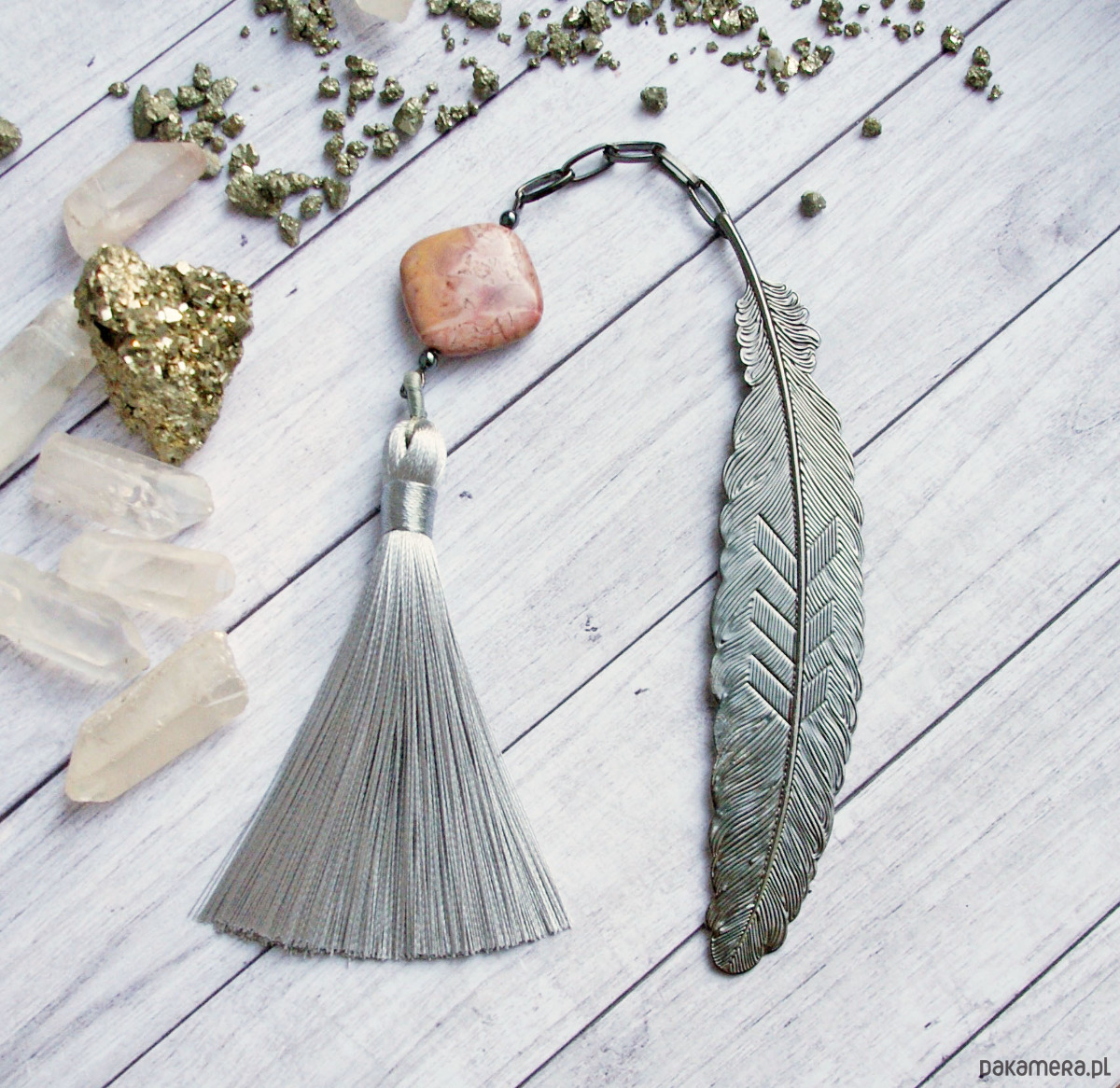 RODONIT ok. 22mm) , (HEMATYT, okazały chwost w kolorze czarnym, metal w kolorze szarym. wszystkie poszczególne elementy są ruchome, więc zakładka będzie się ładnie układała. długość samej zakładki (bazy): ok.12cm. .. dł. całego elementu wiszącego: ok.17cm.