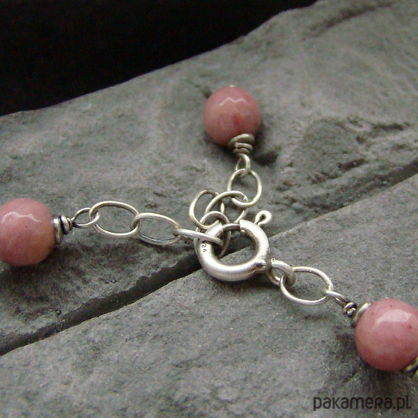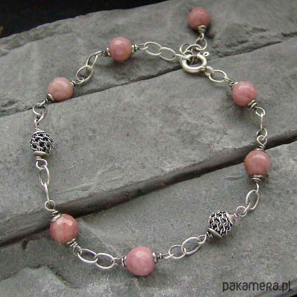 Subtelna i kobieca bransoletka na co dzień. Wykonana w całości z oksydowanego srebra próby 925 oraz fasetowanych kulek rodonitu wielkości 6 mm. Całkowita długość bransoletki regulowana, od. 18 cm do 20 cm. w mojej galerii naszyjnik do kompletu. Ozdobnie zapakowana.