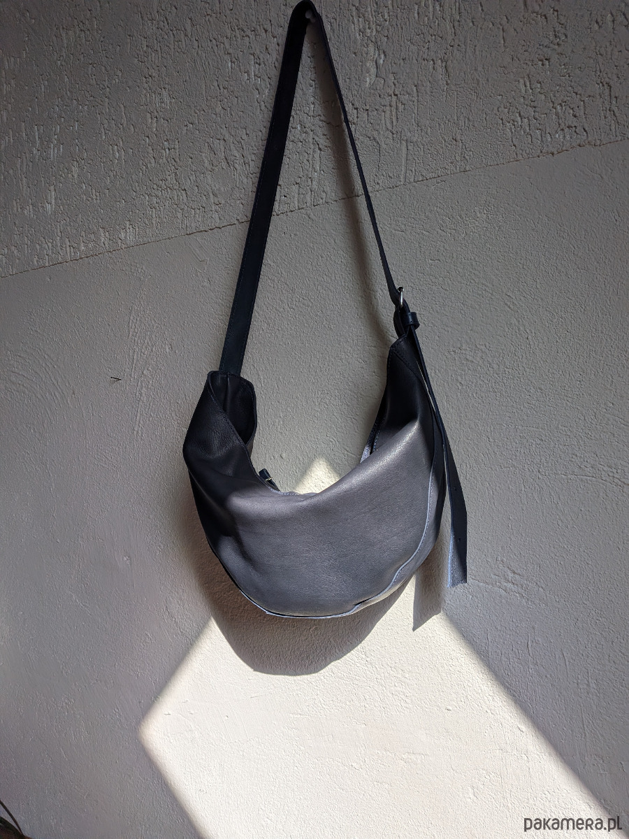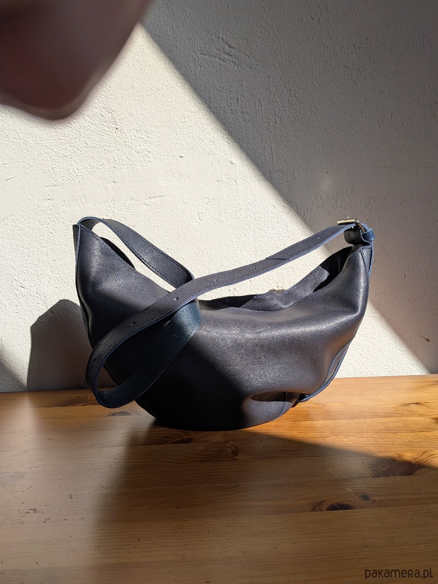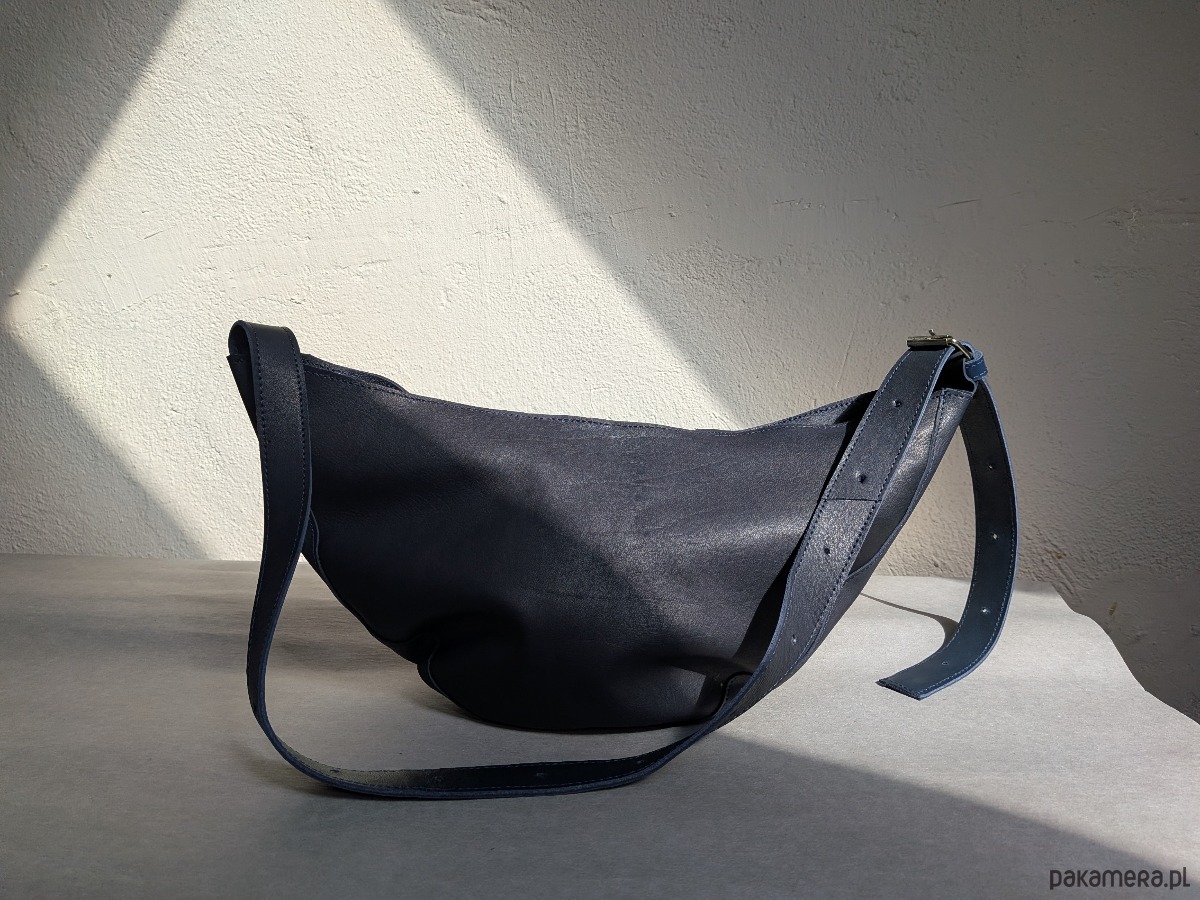 Średniej wielkości torebka typu rogalik. Uszyta z miękkiej mięsistej skóry naturalnej. Granatowa