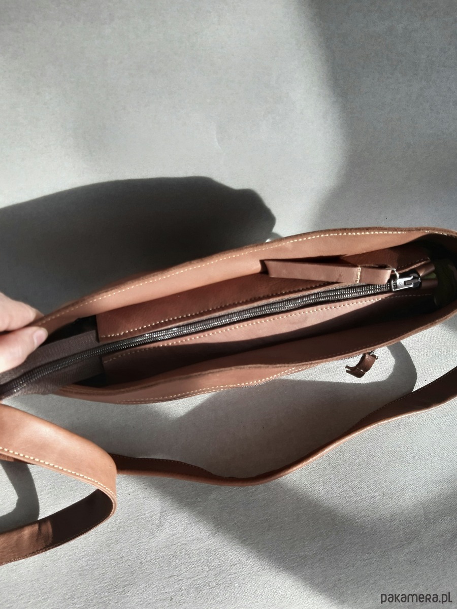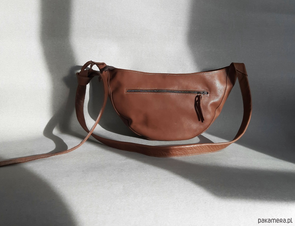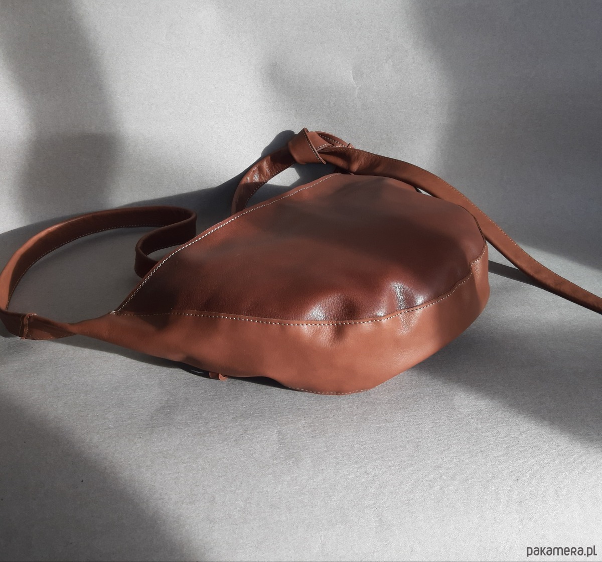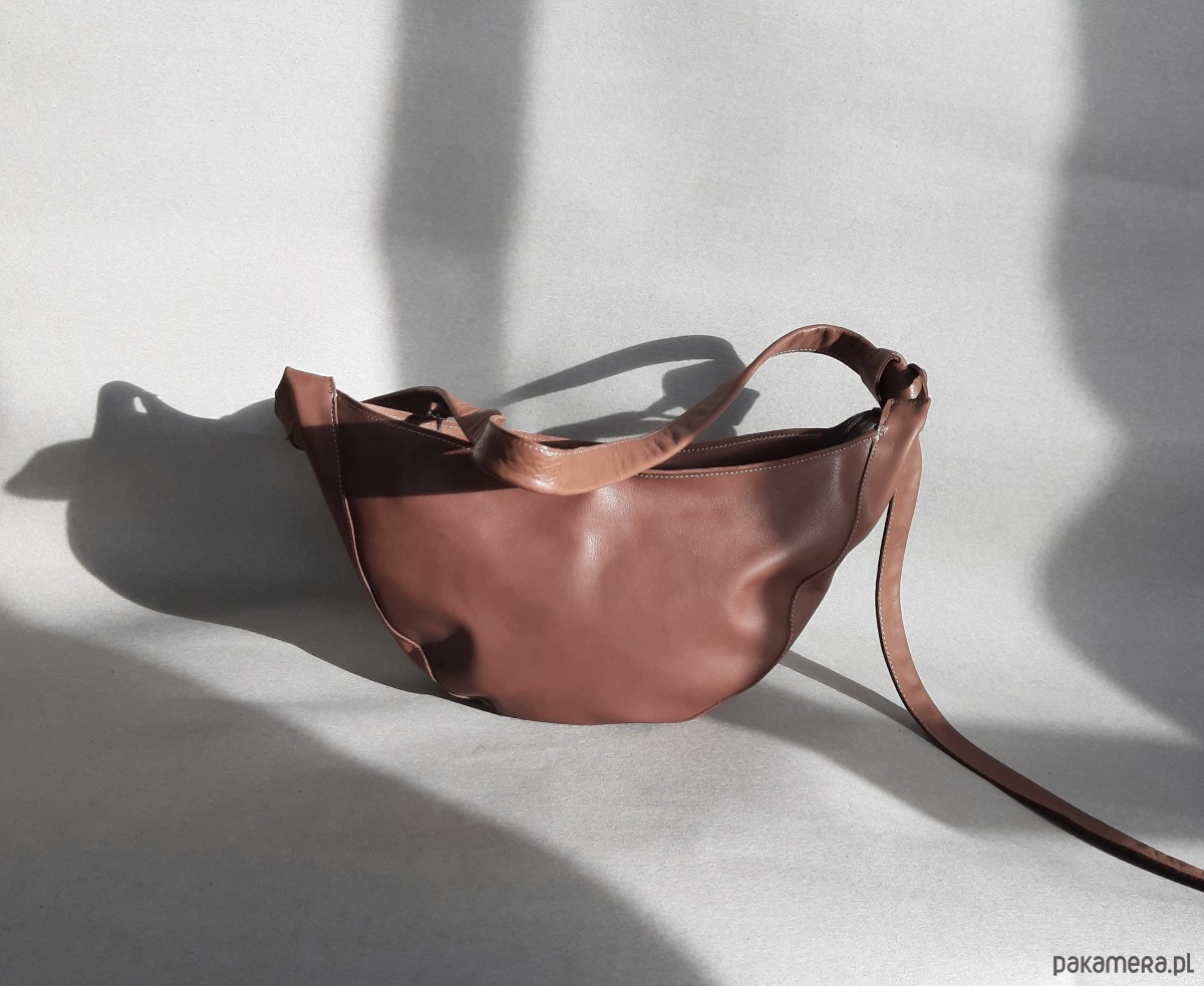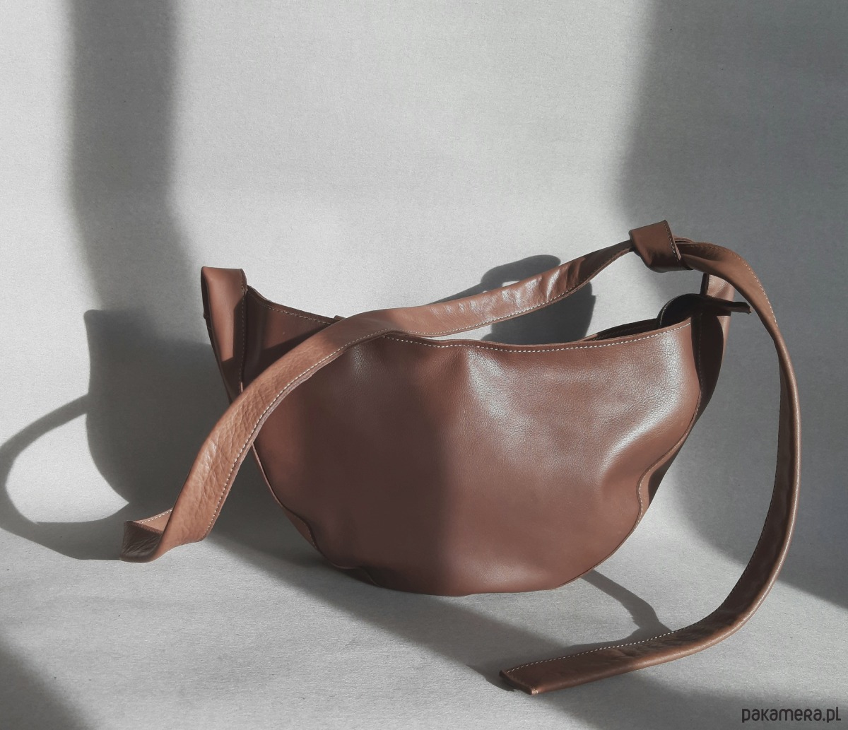 Średniej wielkości torebka typu rogalik. Uszyta z miękkiej mięsistej skóry naturalnej. Brązowa, kolor orzechów laskowych.