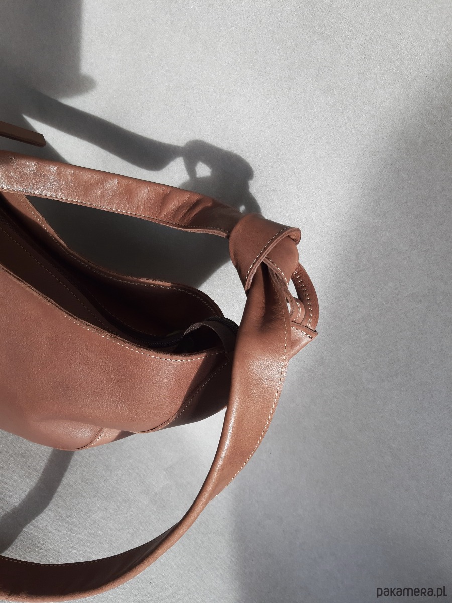 Rogalik średniej wielkości skórzana torebka wiązana na supeł Brązowa