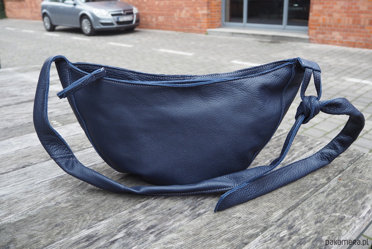 Średniej wielkości torebka typu rogalik. Uszyta z miękkiej mięsistej skóry naturalnej. Granatowa