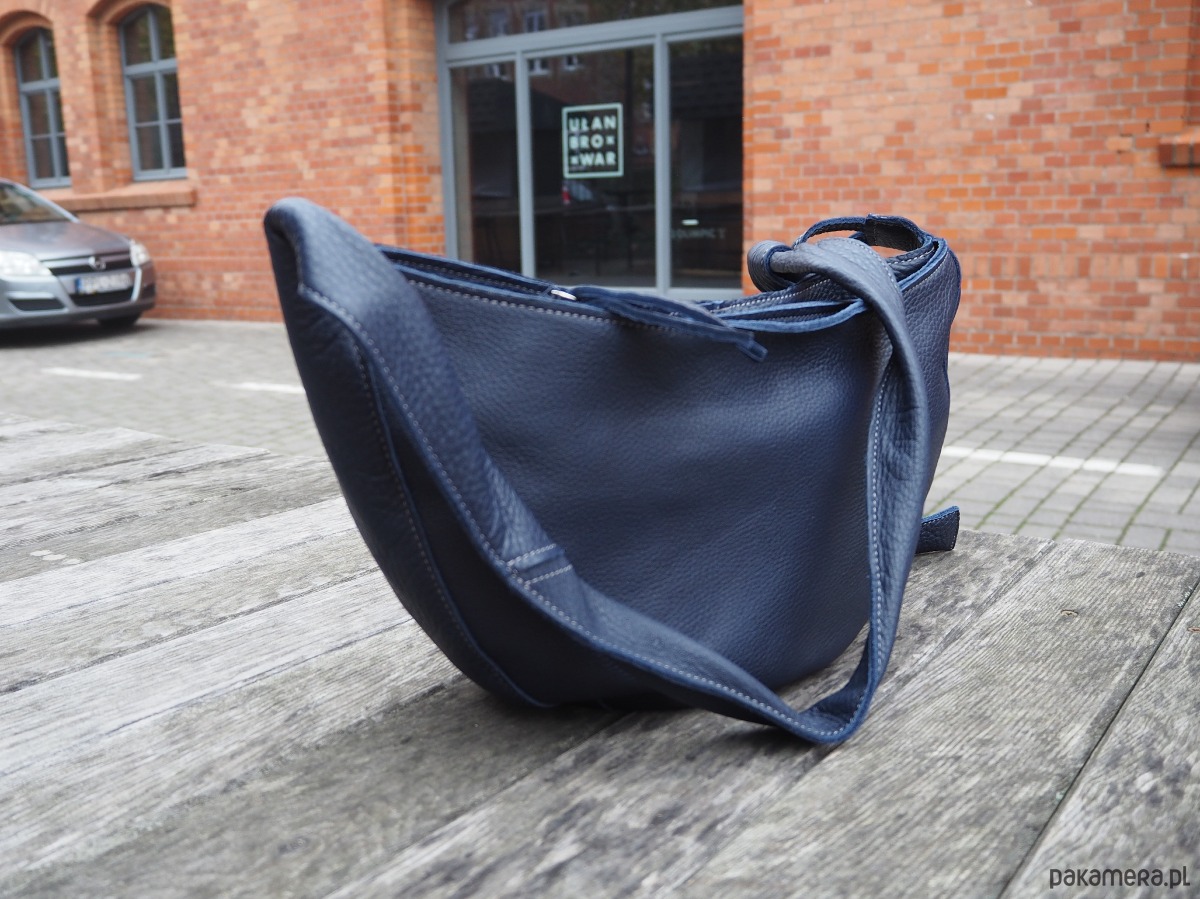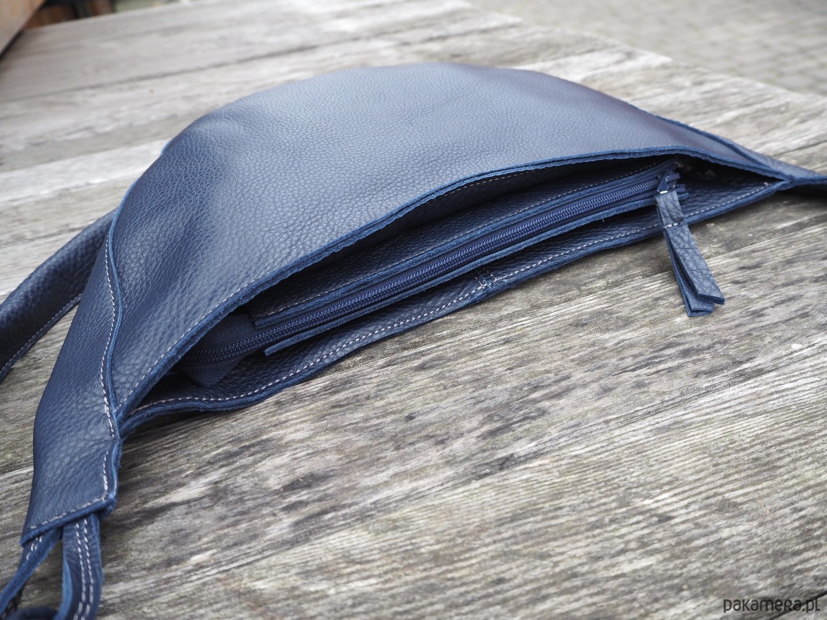 Średniej wielkości torebka typu rogalik. Uszyta z miękkiej mięsistej skóry naturalnej. Granatowa