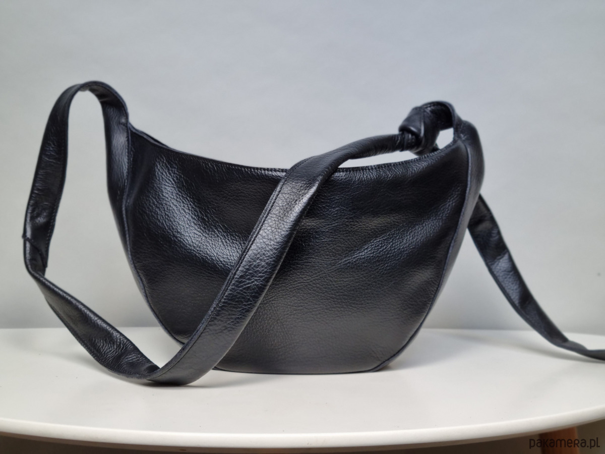 Średniej wielkości torebka typu rogalik. Uszyta z miękkiej mięsistej skóry naturalnej. Czarna.
