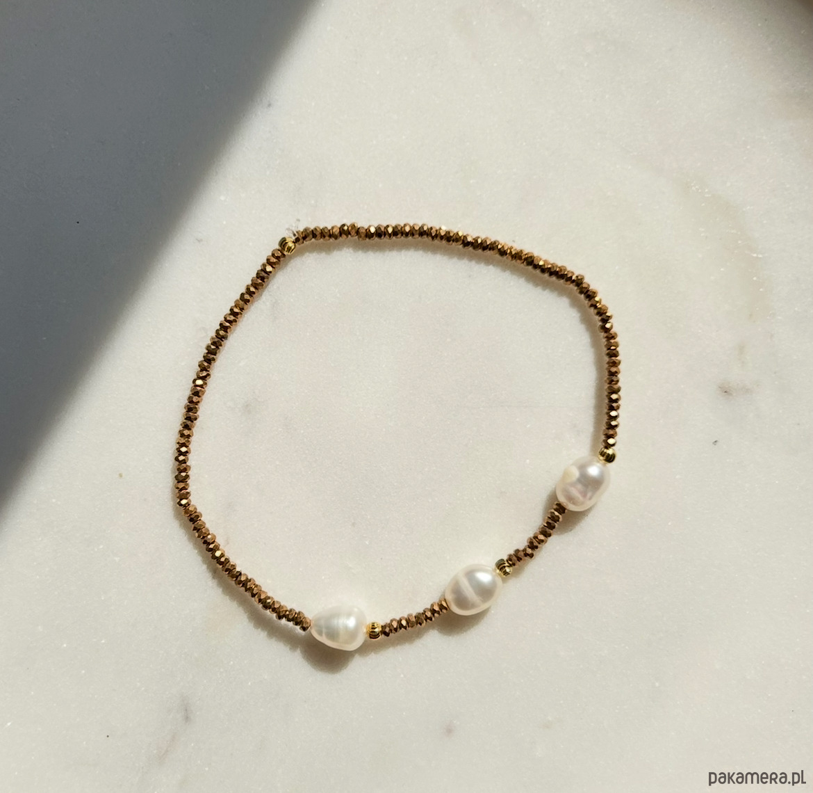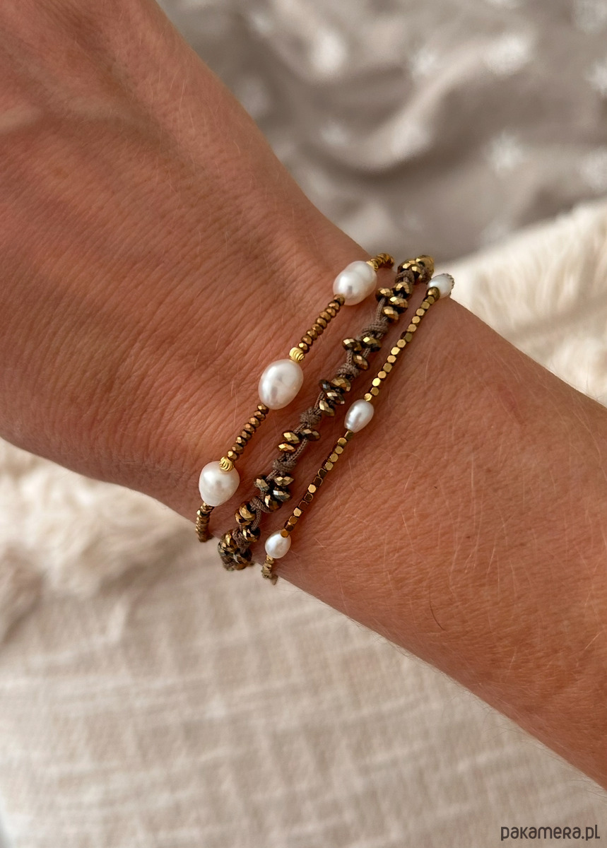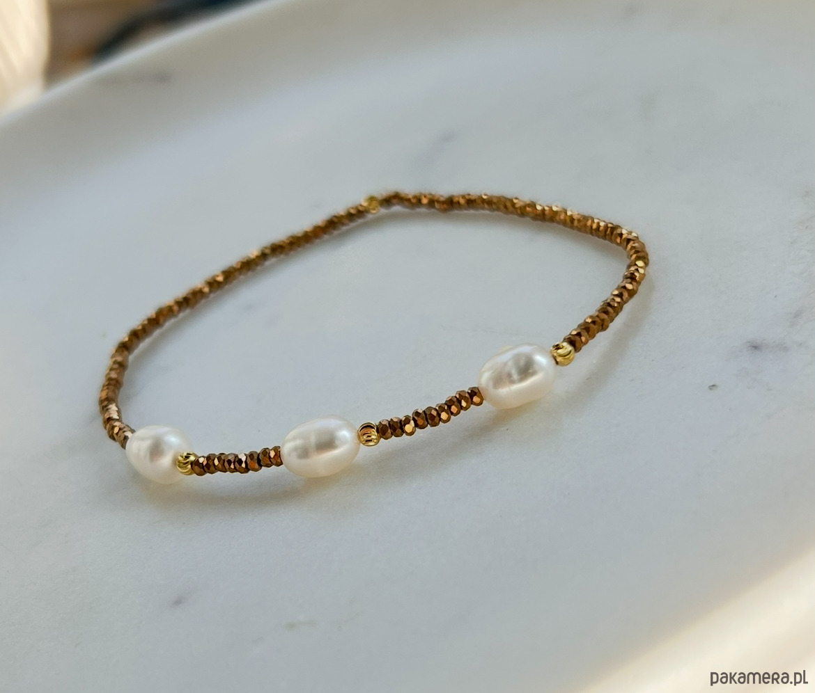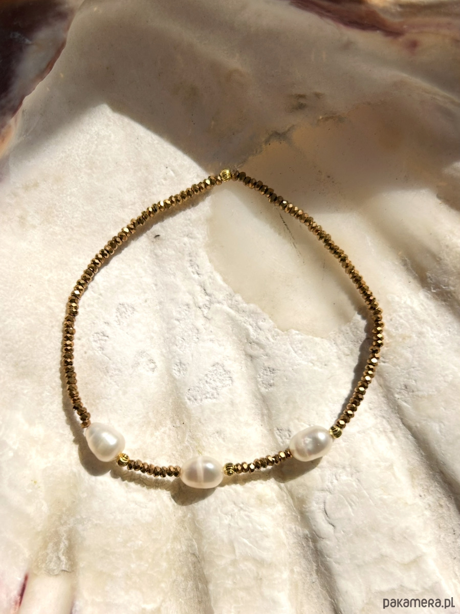 Złocony hematyt to symbol siły, pozytywnych wibracji, wsparcia w życiowych trudnościach. Perła to symbol kobiecości, łączy w sobie energię miłości i zmysłowości. Prezentuje się niezwykle sensualnie. Pozłacane kuleczki.