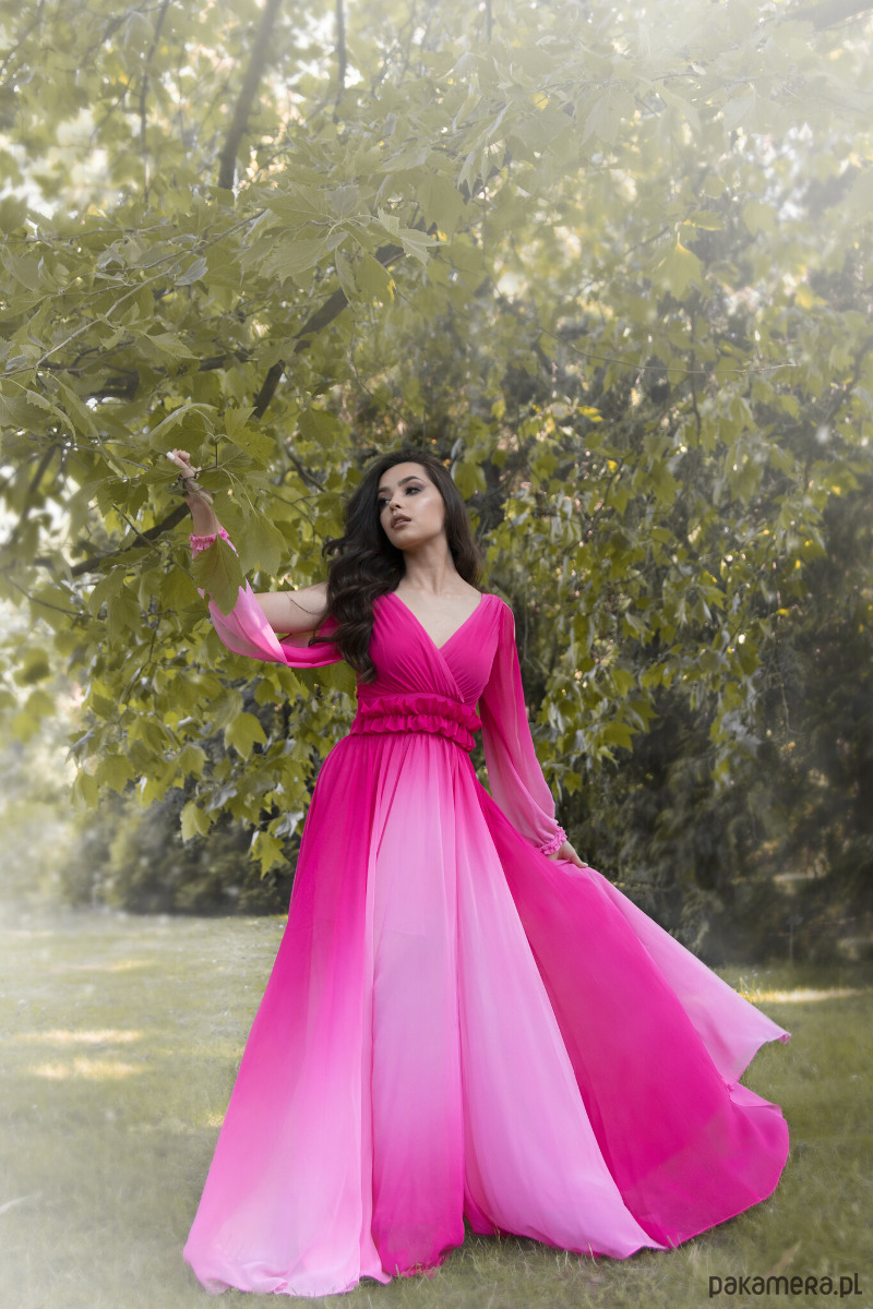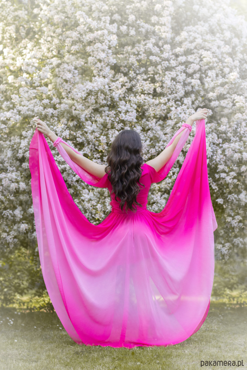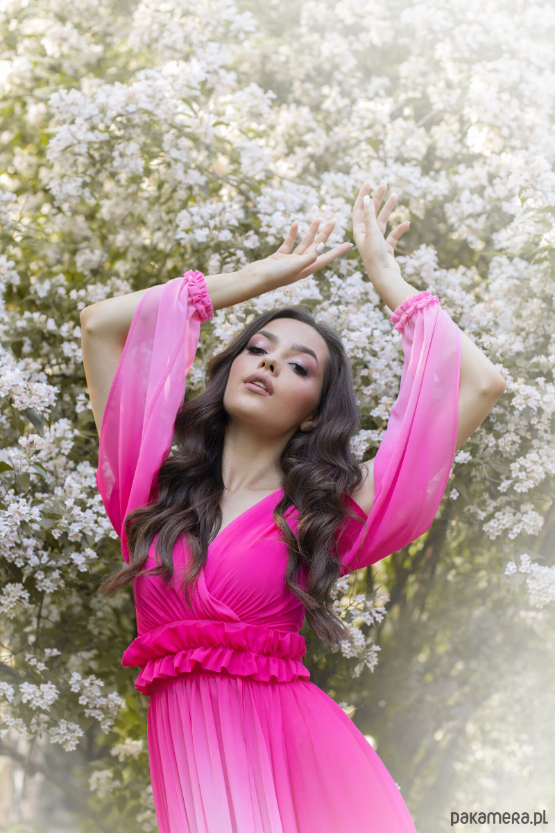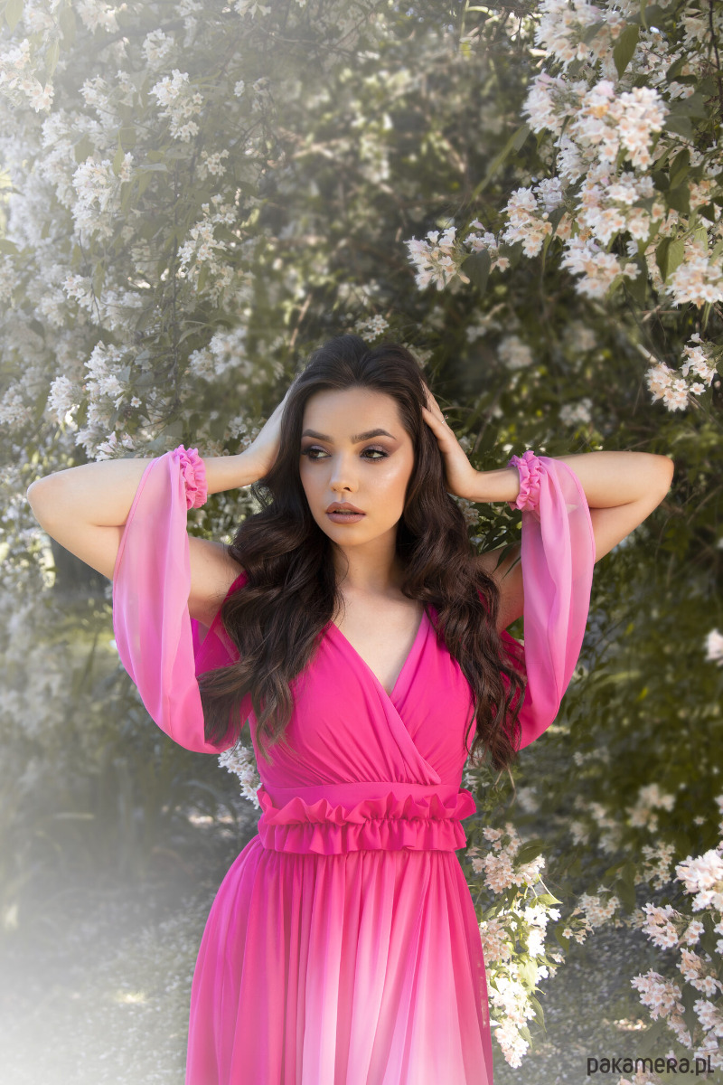 Rozcinane rękawy zakończone wąskimi falbankami.