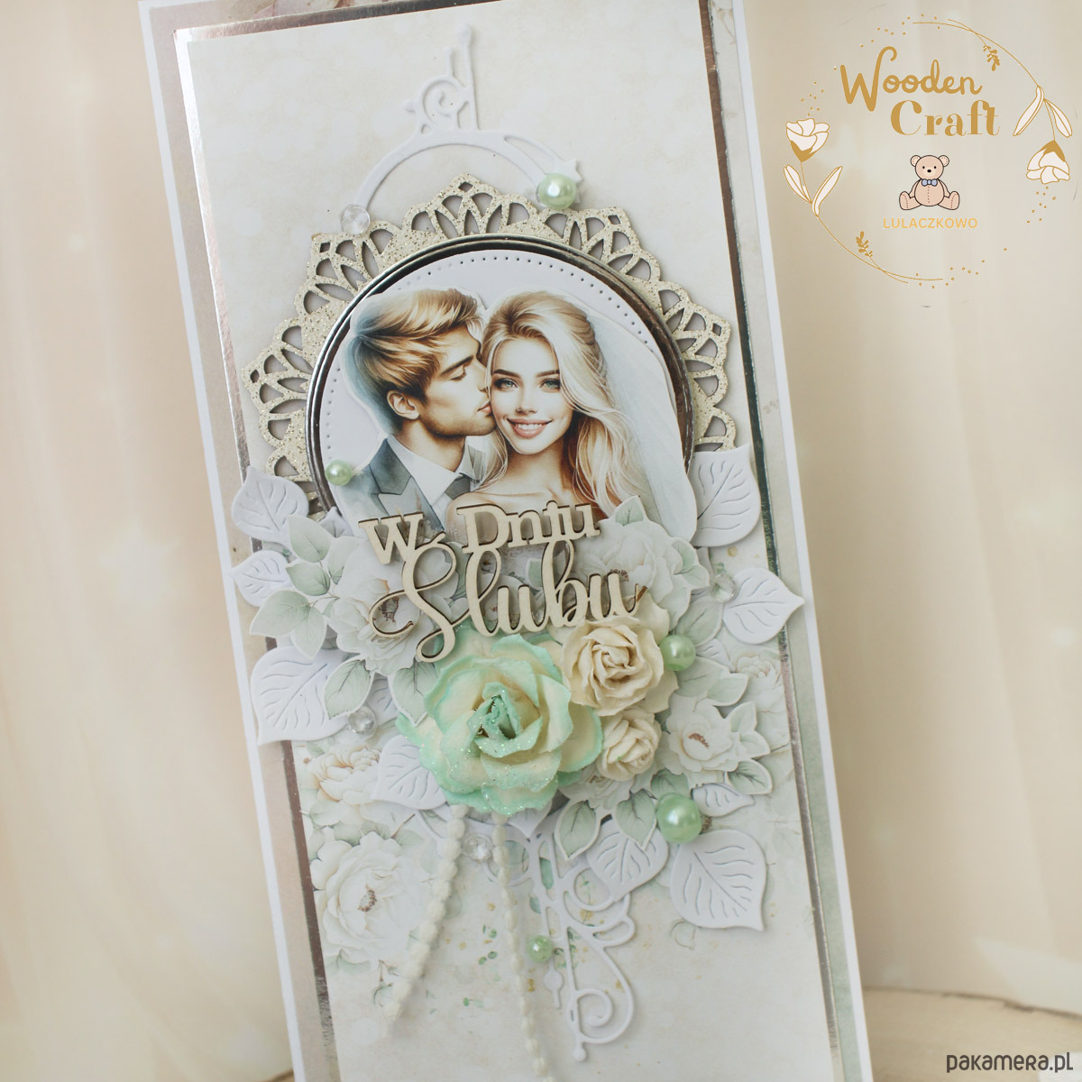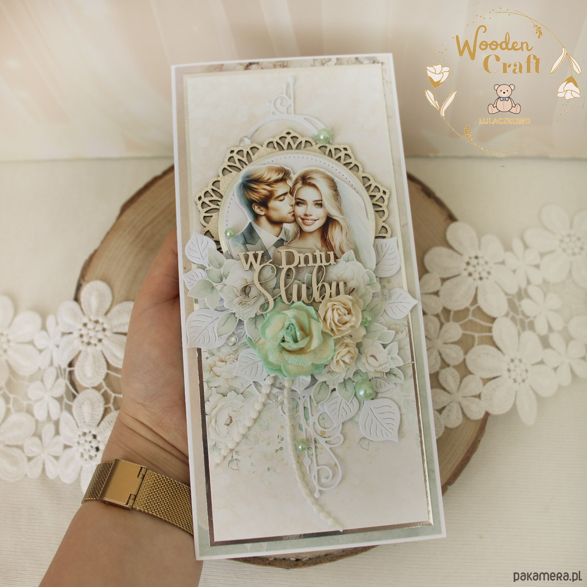 Kartka będzie pięknym i niepowtarzalnym dodatkiem do prezentu dla Państwa Młodych.