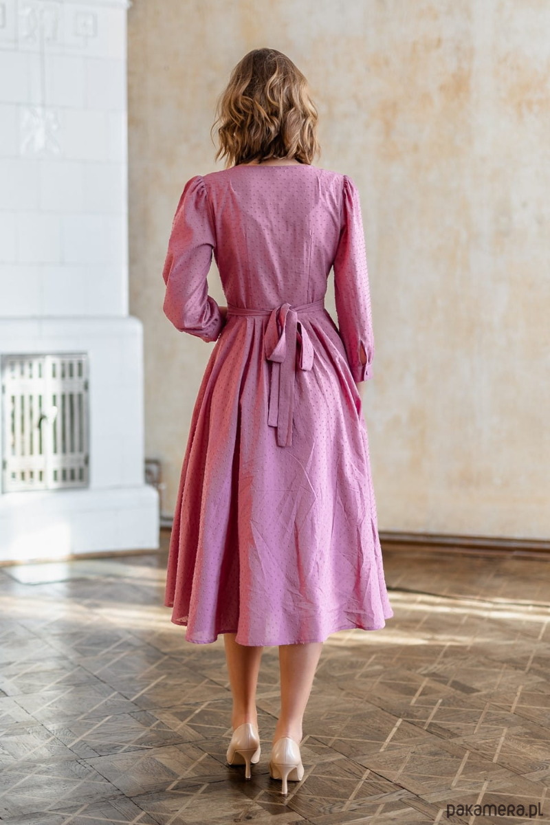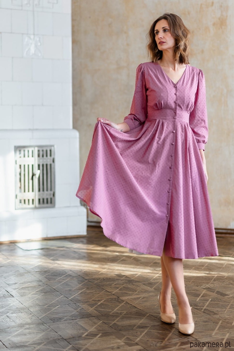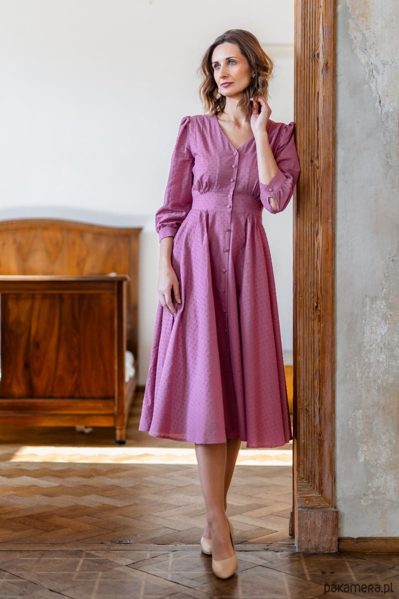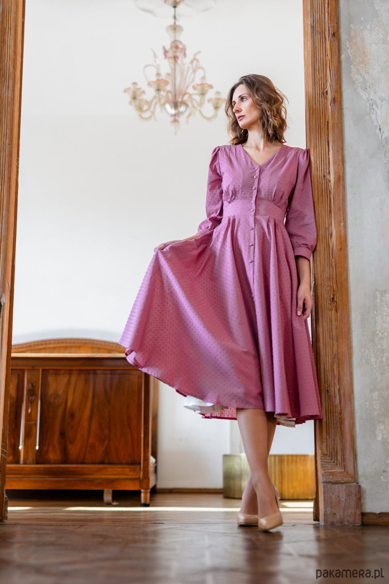 Retro sukienka Estera inspirowana latami 40., wykonana z lekkiej, przewiewnej bawełny plumeti. Mocno rozkloszowany dół, bufiaste rękawy i wiązanie w talii podkreślają sylwetkę, zapewniając swobodę i kobiecy wygląd. Praktyczne zapięcie na guziczki ułatwia karmienie, a miła w dotyku wiskozowa podszewka gwarantuje pełen komfort noszenia. Idealna na letnie dni, rodzinne uroczystości i romantyczne spacery.
