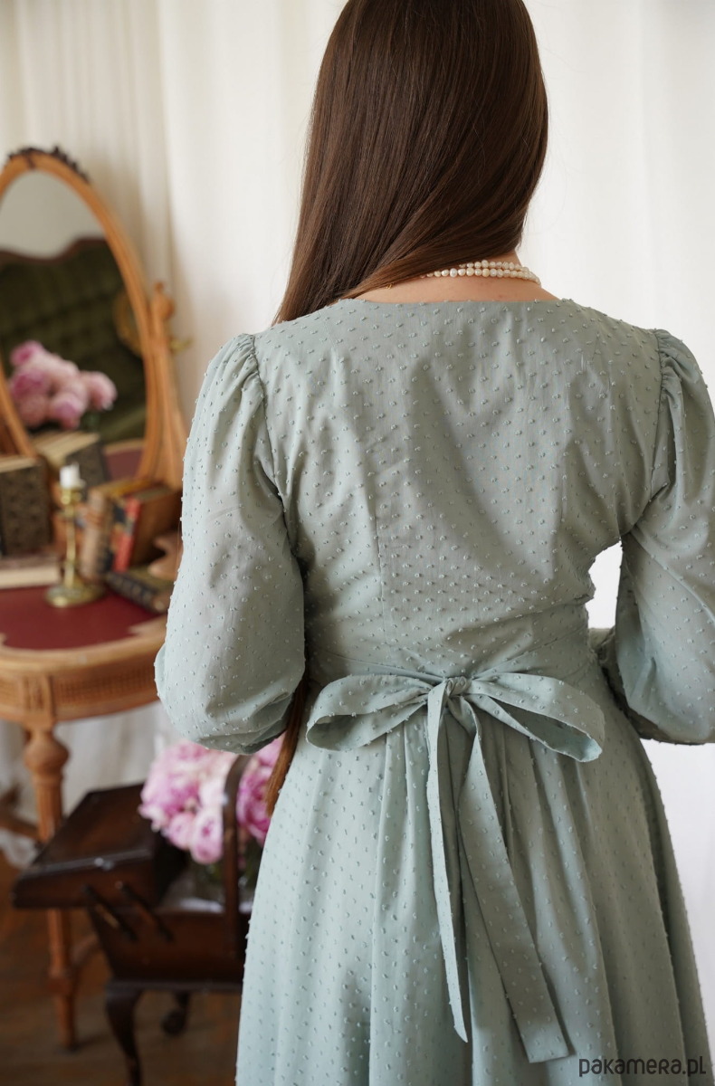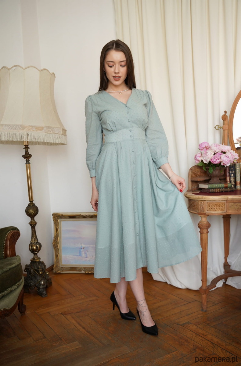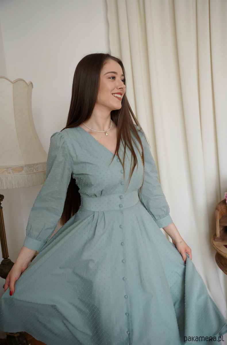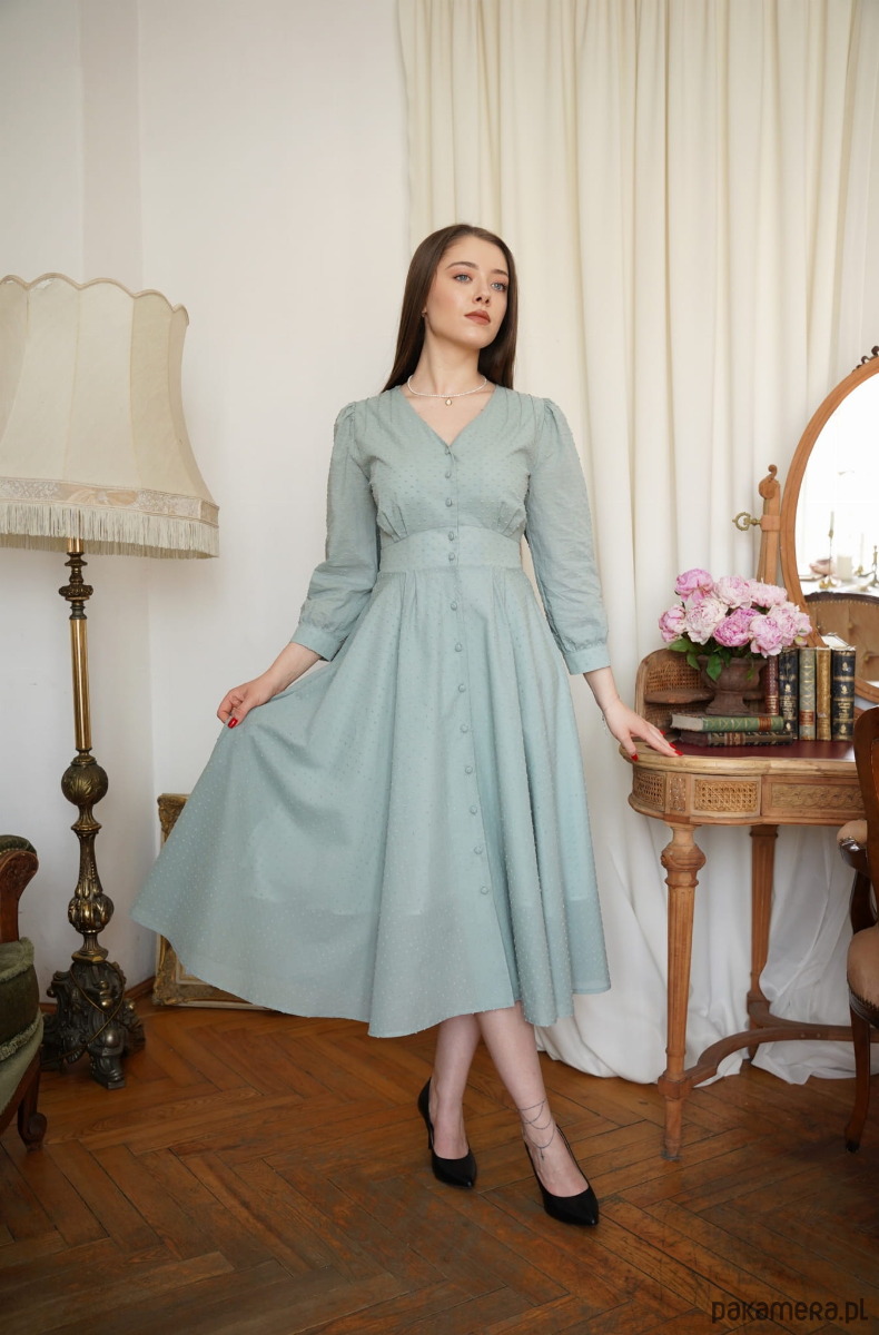 Retro sukienka Estera inspirowana latami 40., wykonana z lekkiej, przewiewnej bawełny plumeti. Mocno rozkloszowany dół, bufiaste rękawy i wiązanie w talii podkreślają sylwetkę, zapewniając swobodę i kobiecy wygląd. Praktyczne zapięcie na guziczki ułatwia karmienie, a miła w dotyku wiskozowa podszewka gwarantuje pełen komfort noszenia. Idealna na letnie dni, rodzinne uroczystości i romantyczne spacery.
