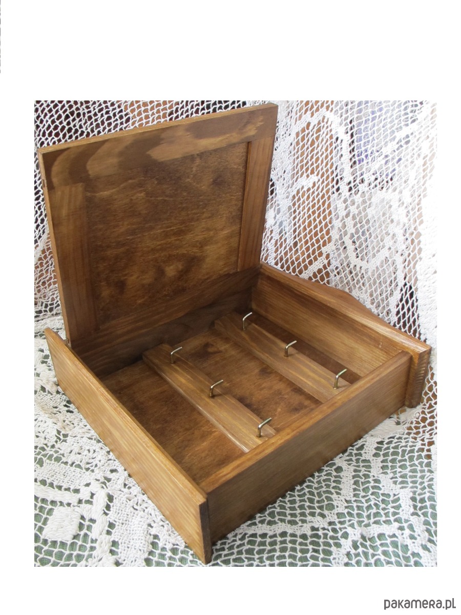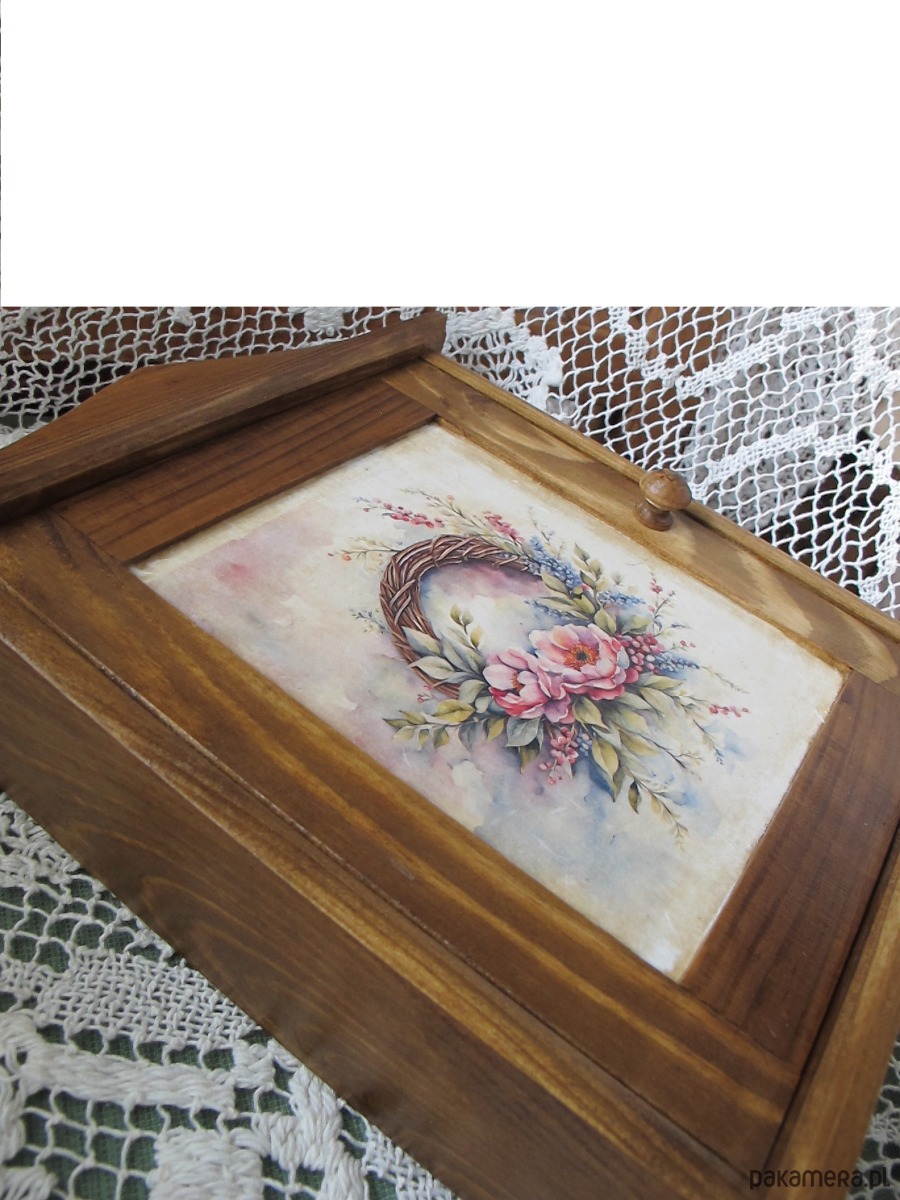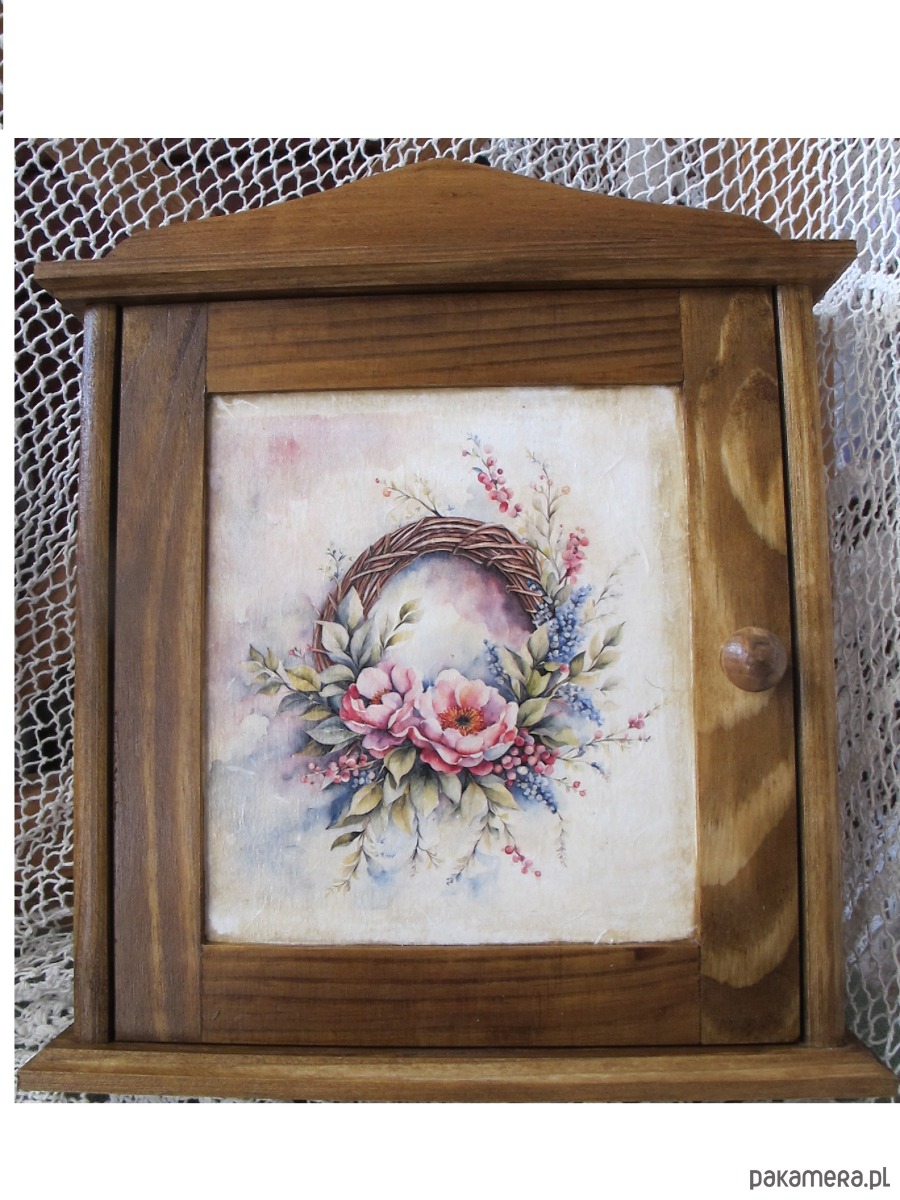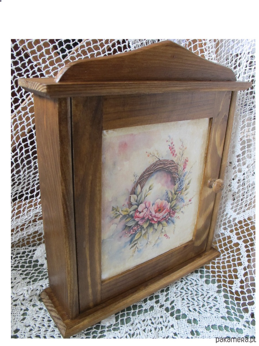 Szafka na klucze z litego, sosnowego drewna, dekorowana ręcznie w technice decoupage. Szafka jest woskowana na jedwabisty połysk, wysokiej jakości woskiem do drewna. W środku haczyki z metalu w ilości 6 sztuk. Wymiary szafki : 22 x 25 bok 6 cm. Mierzona w najszerszych miejscach. Drewno w odcieniu ciepłego brązu. Mocowana do ściany za pomocą dwóch wkrętów od środka.