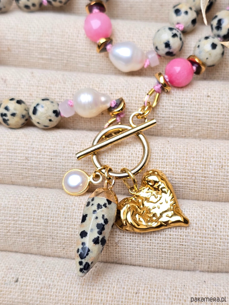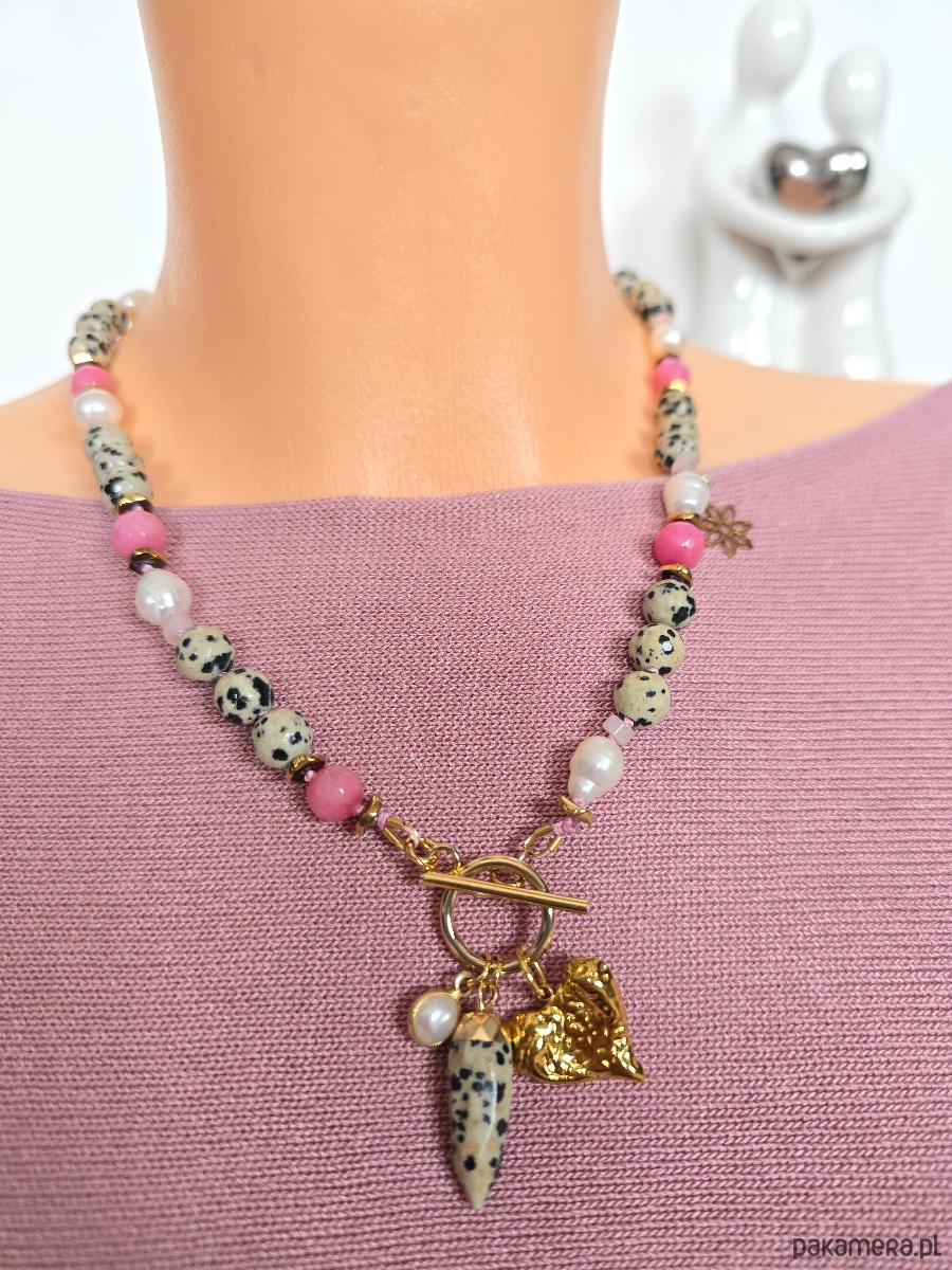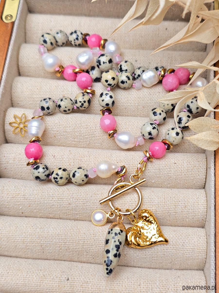 Piękny, supełkowany naszyjnik z jaspisu dalmatyńskiego, pereł naturalnych, różowego jadeitu i złoconego hematytu.