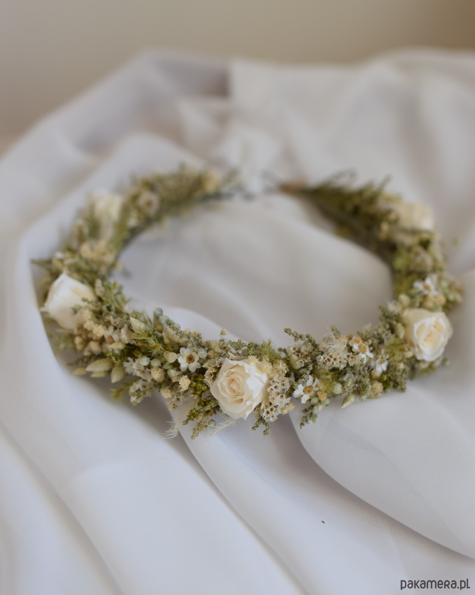 Wianek idealnie sprawdzi się na ślub, komunię lub sesję zdjęciową. Jest lekki, wygodny w noszeniu i regulowany dzięki wiązaniu na wstążkę.