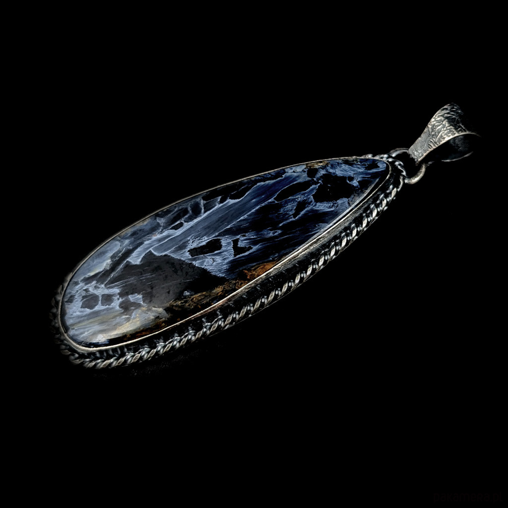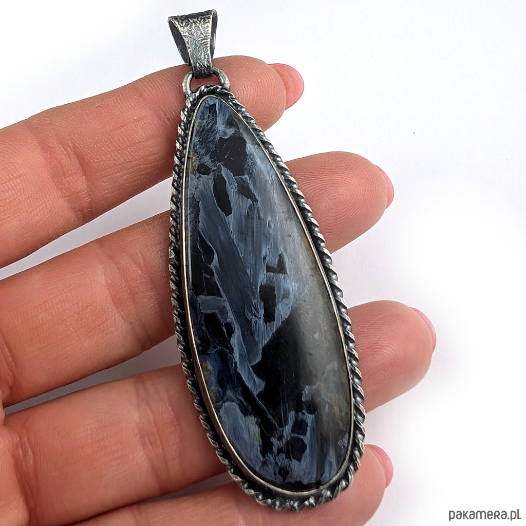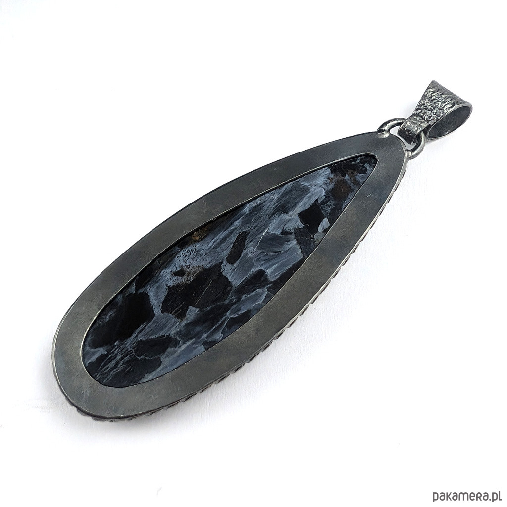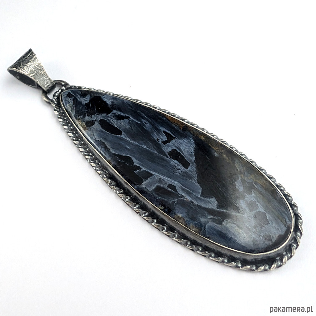 Wisior wykonany z oksydowanego srebra próby 925 oraz przepięknego okazu pietersitu (pietersite). Wyjątkowy okaz. Niezwykły minerał pochodzi z Afryki, Namibia. Wspaniały efekt włókien mieniących się podczas ruchu, niczym ruchome piaski czy wodospady. Petersit ukazuje efekt kociego oka, strukturą przypomina nieco czaroit. Rzadki bardzo jakościowy minerał. Wymiary oprawy 65 x 25 mm. Z krawatką długość 78 mm. Waga wisiora 21 g. Wysłany w ozdobnym pudełeczku.