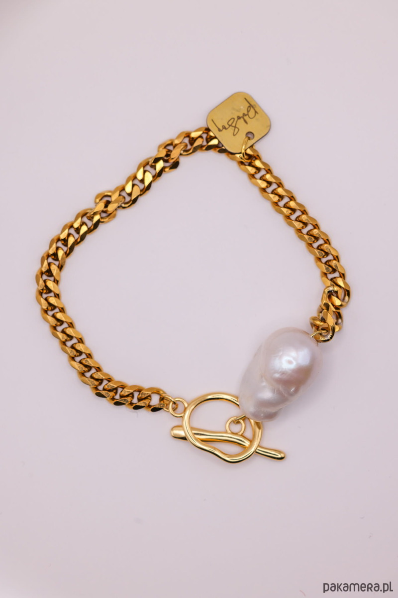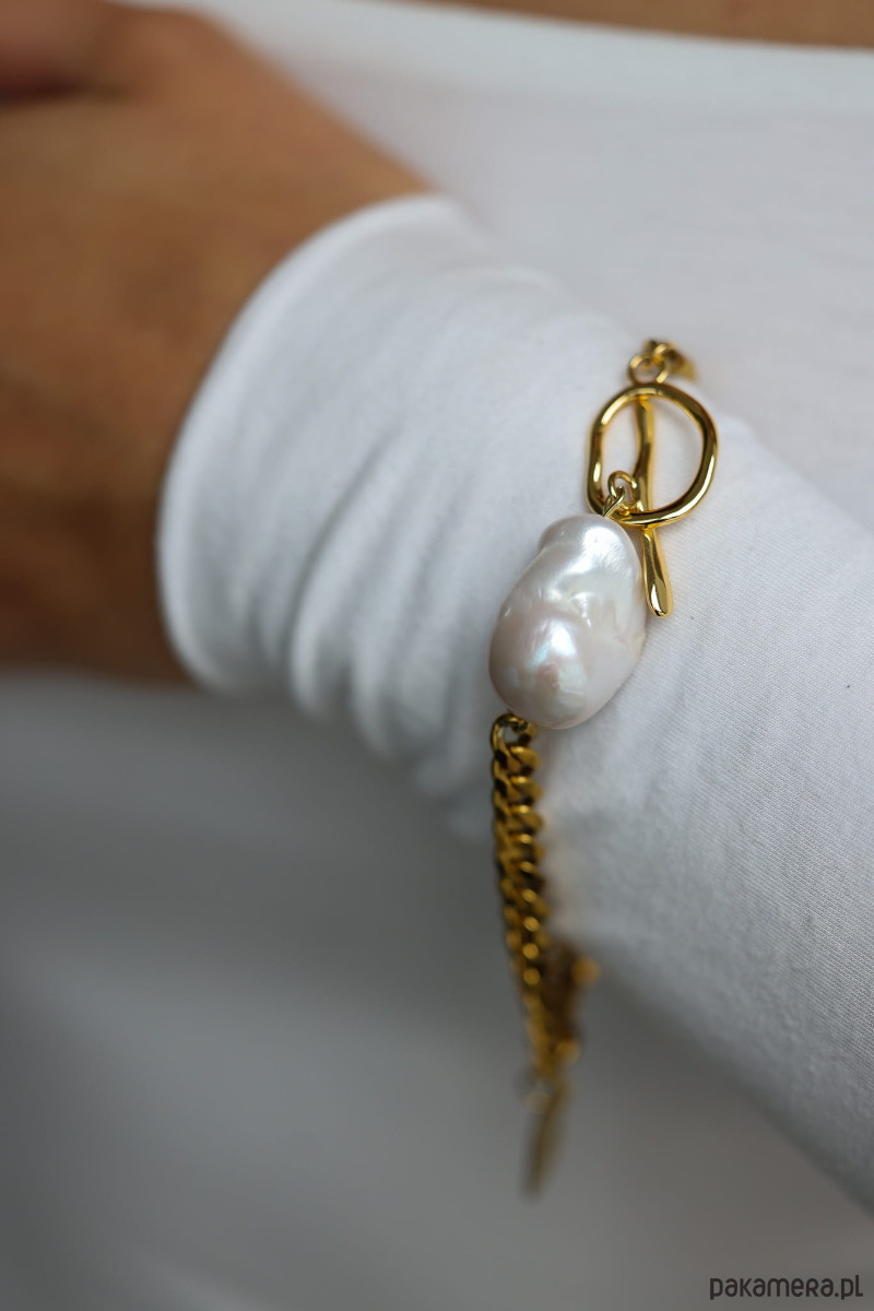 Ręcznie wykonana bransoleta z mosiądzu i perły naturalnej typu baroque.