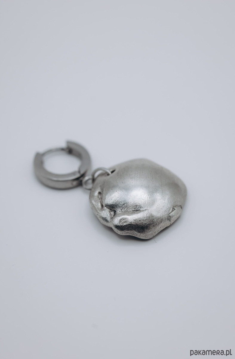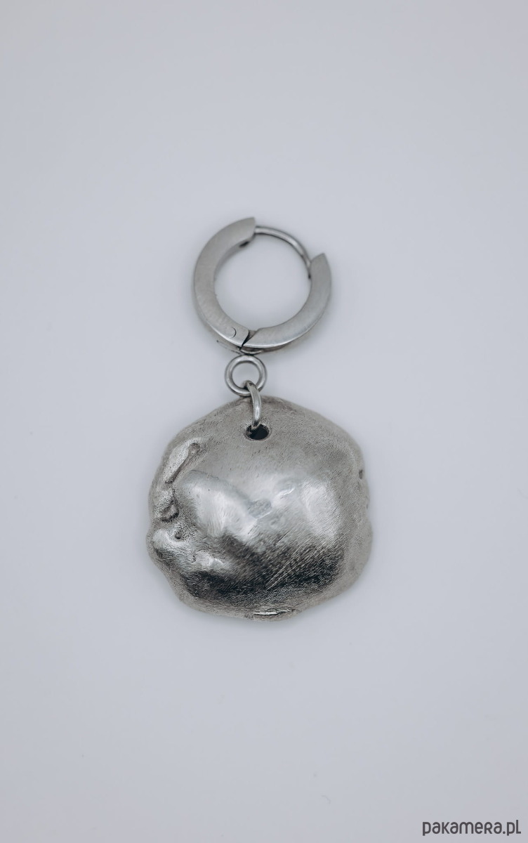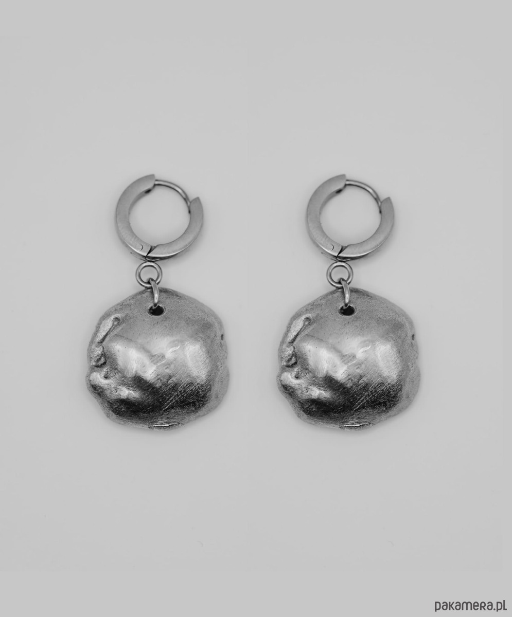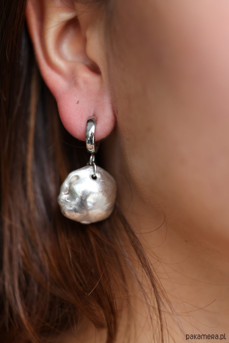 Ręcznie wykonane metodą traconego wosku kolczyki w kształcie nieregularnej półkuli zawieszonej na biglu.