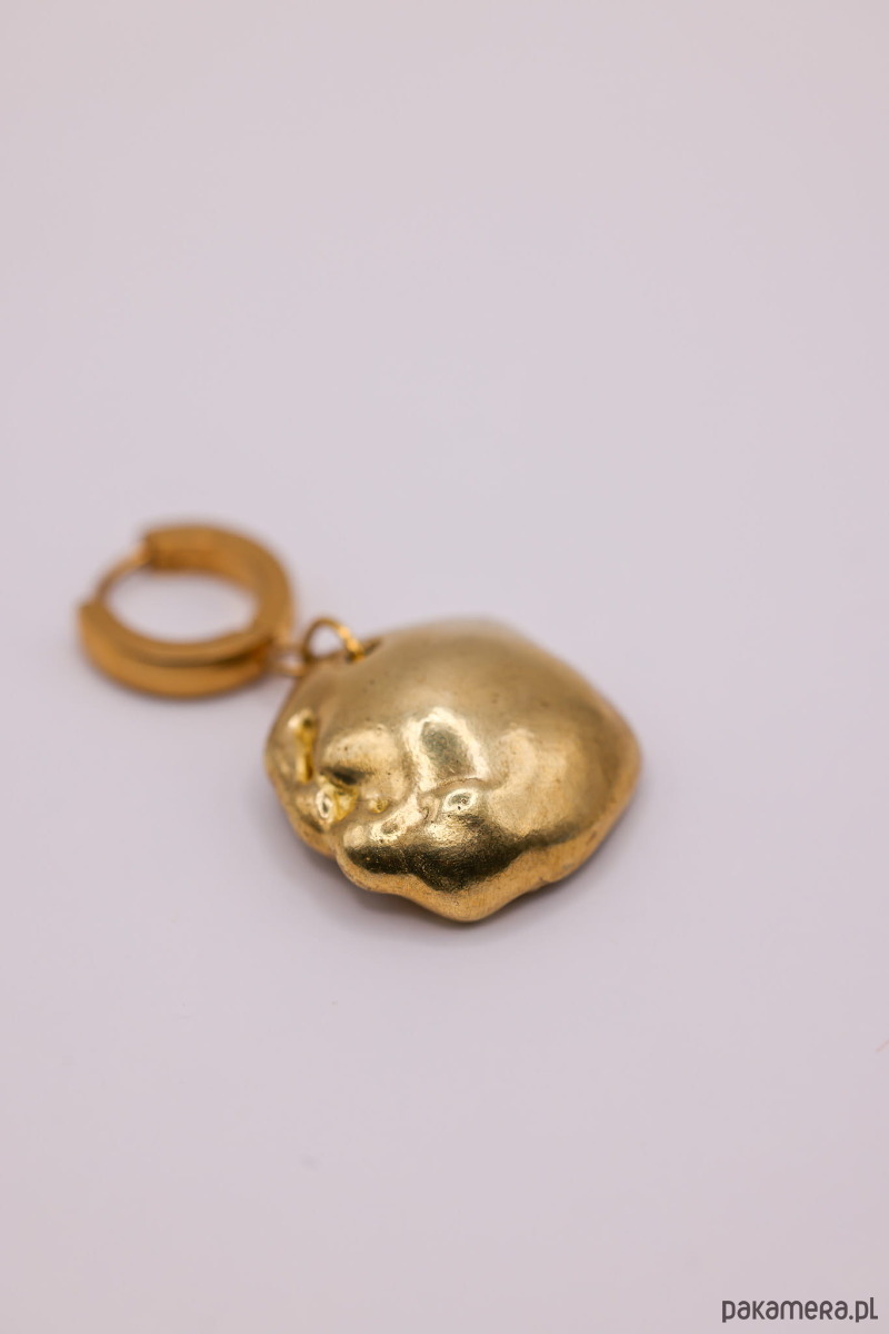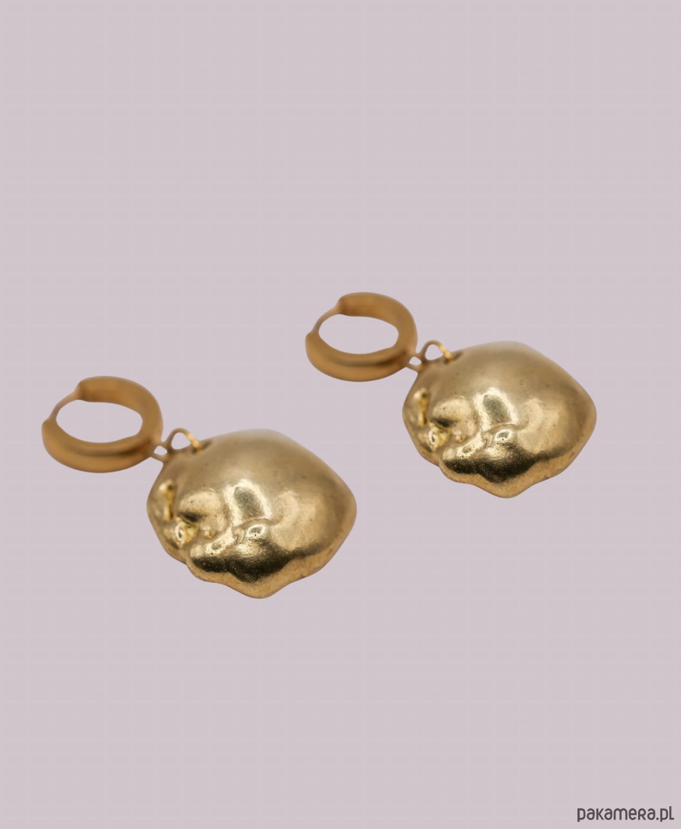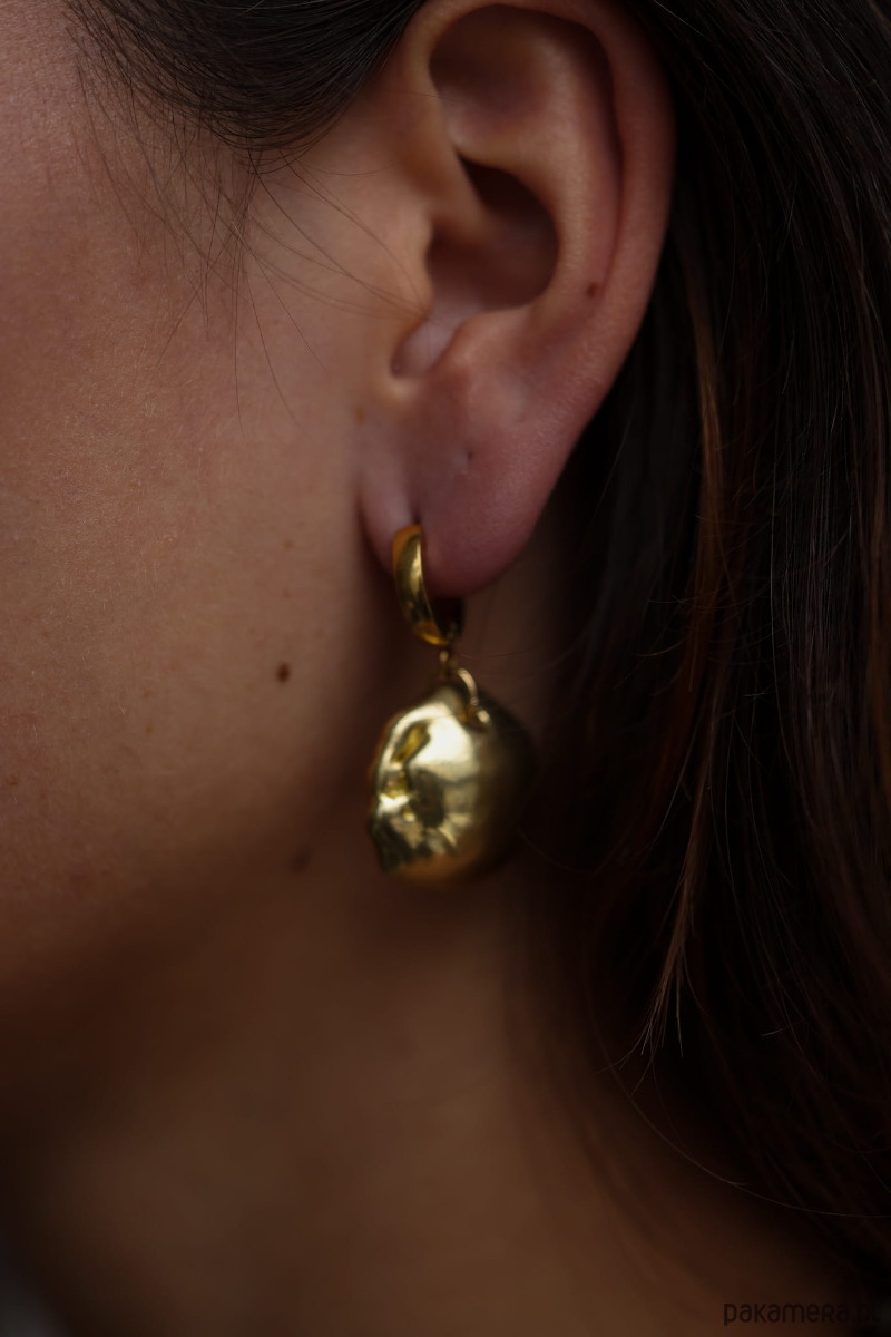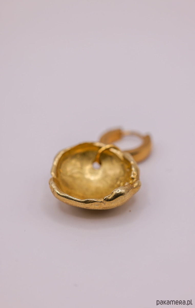 Ręcznie wykonane metodą traconego wosku kolczyki w kształcie nieregularnej półkuli zawieszonej na biglu.