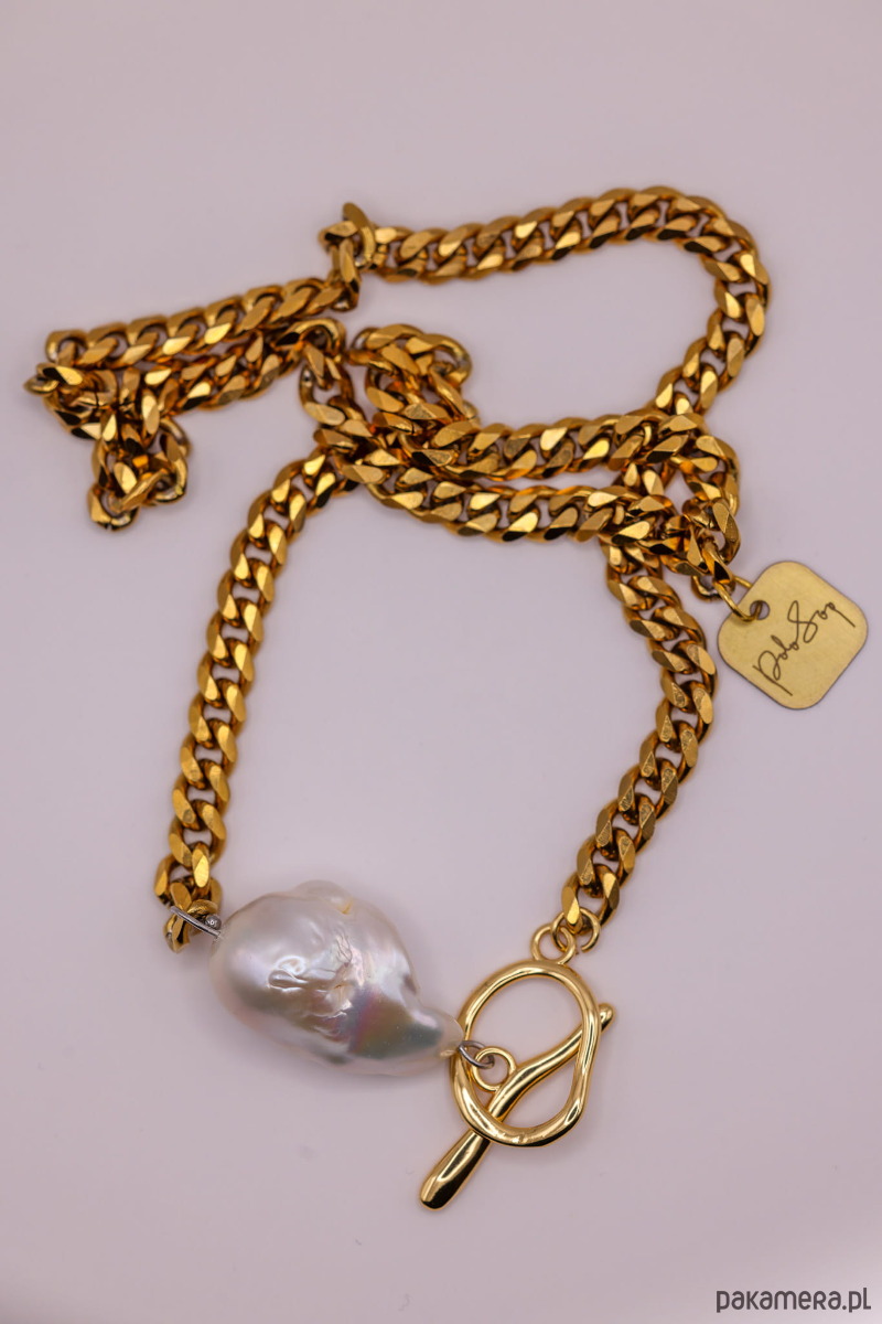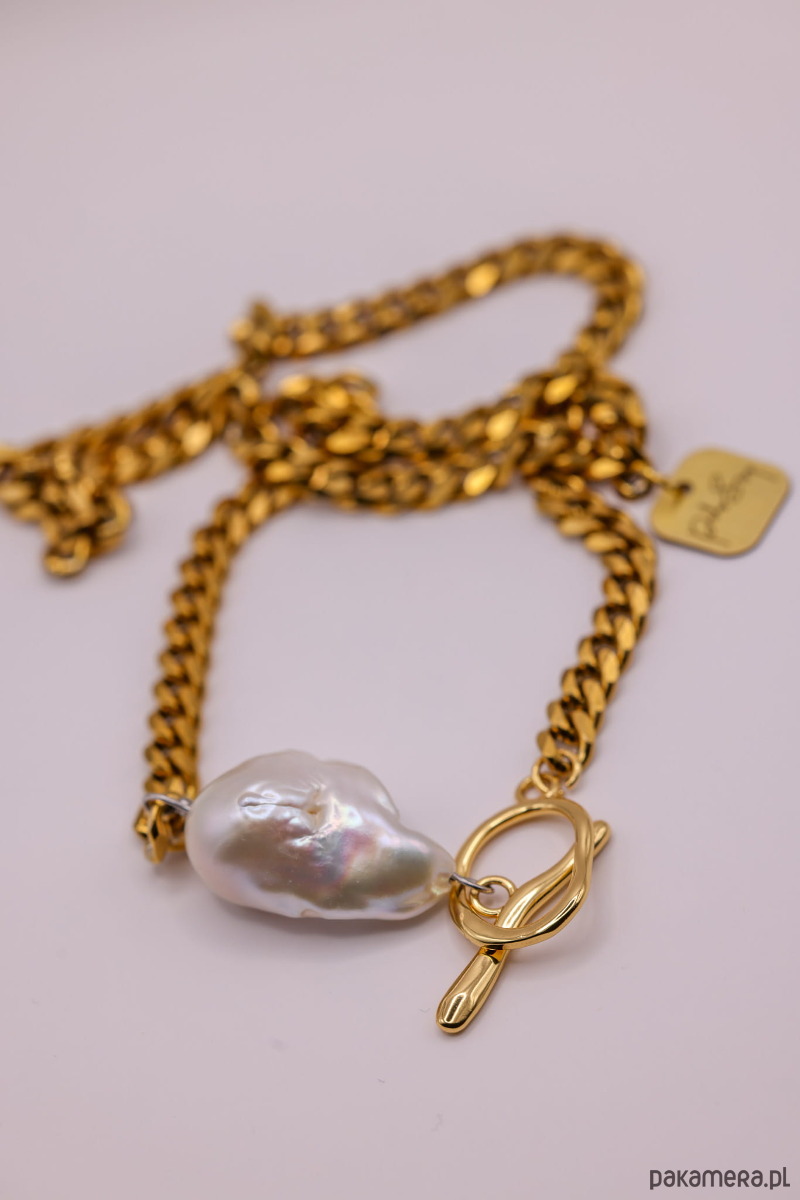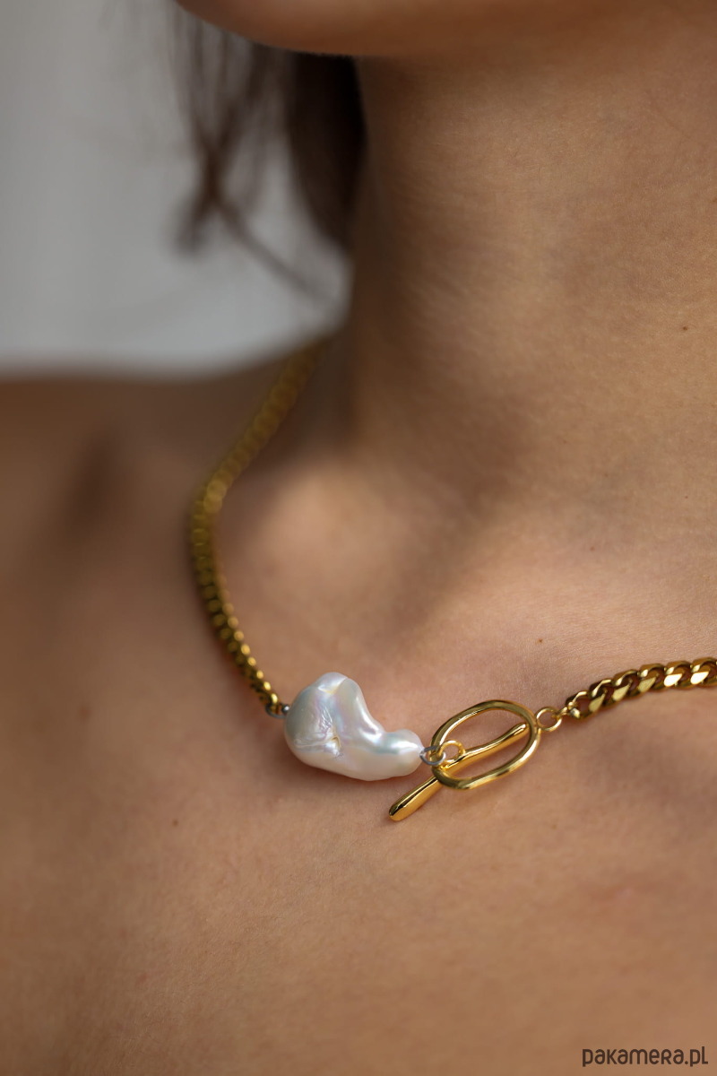 Ręcznie wykonany naszyjnik z mosiądzu i perły naturalnej typu baroque.