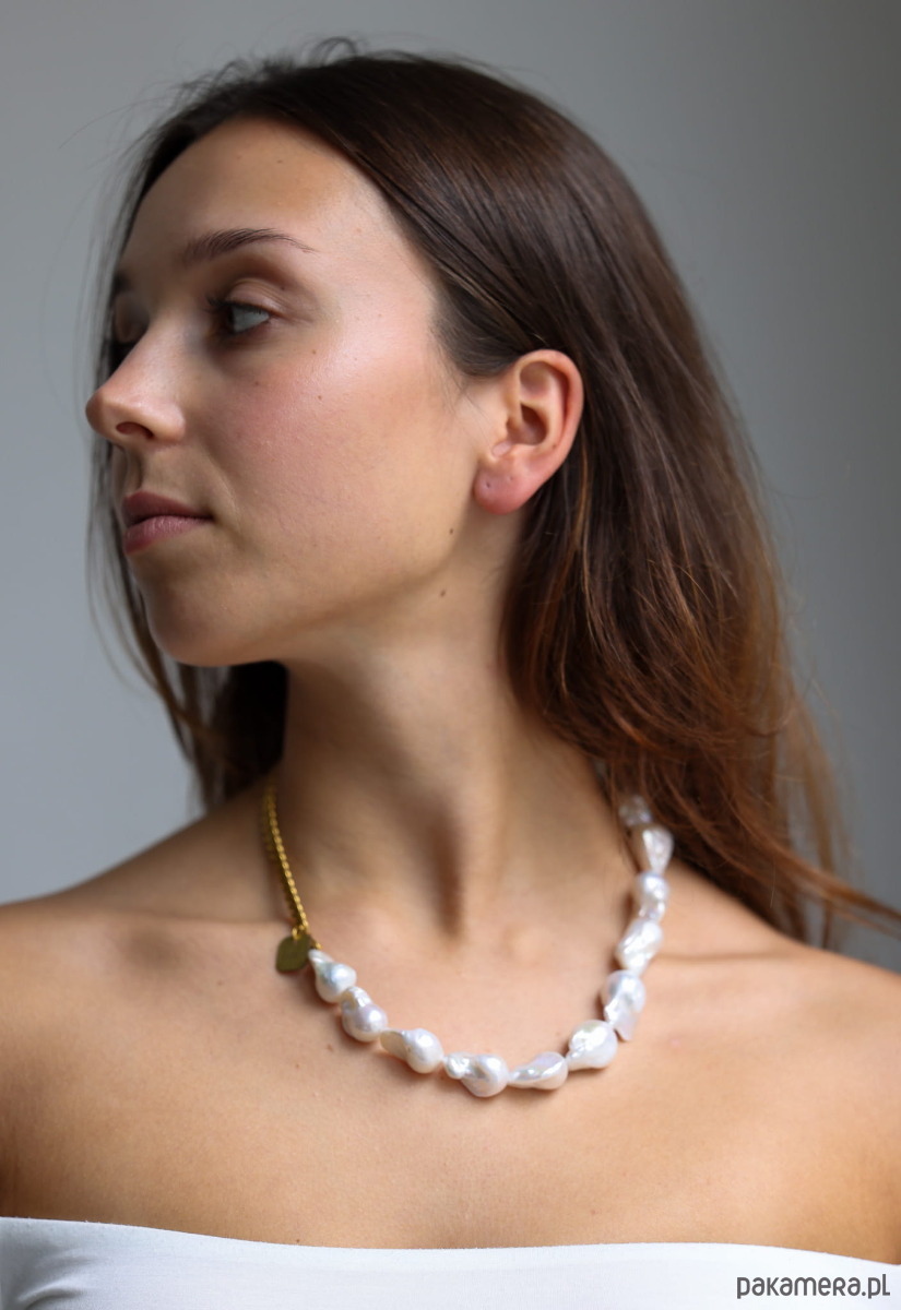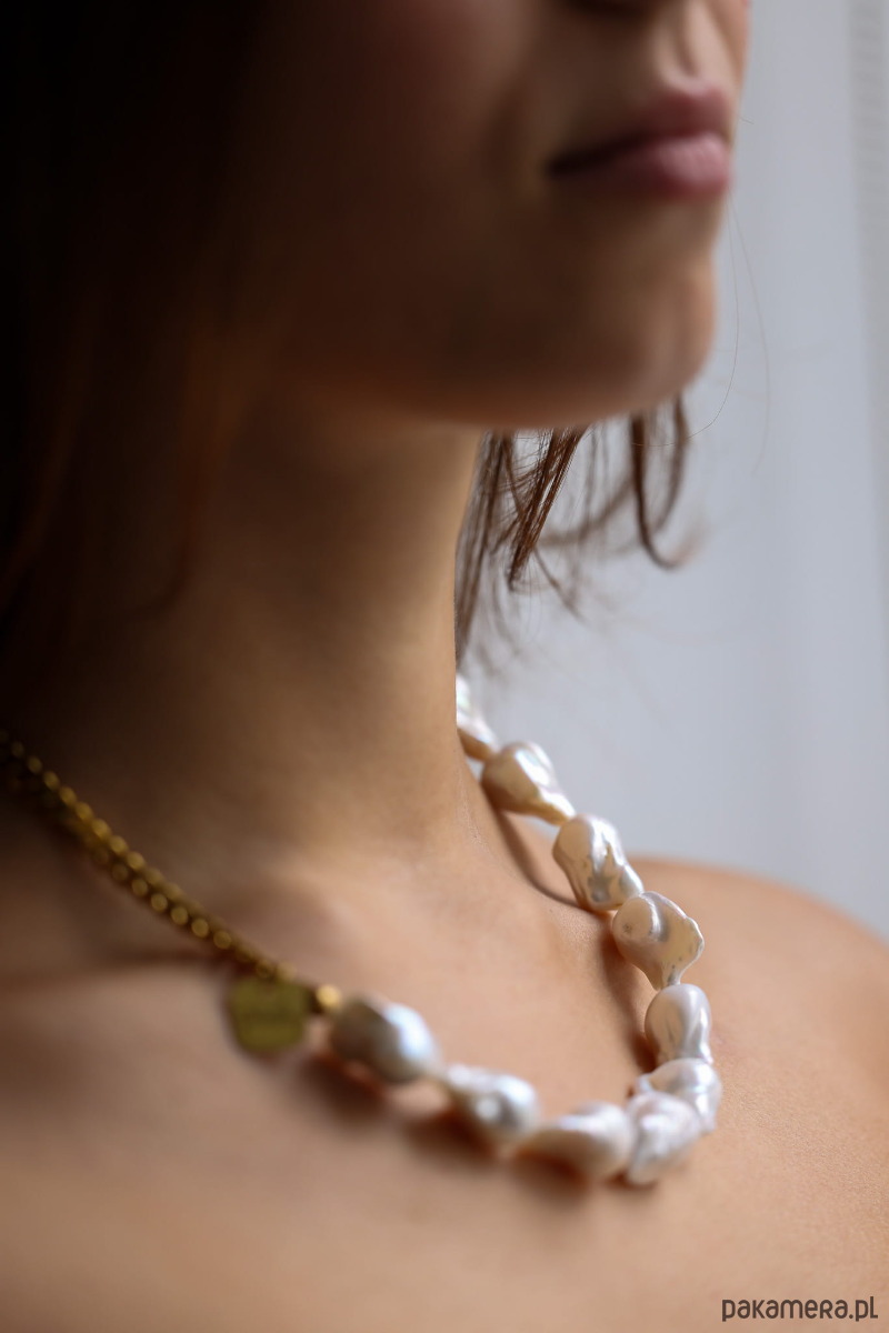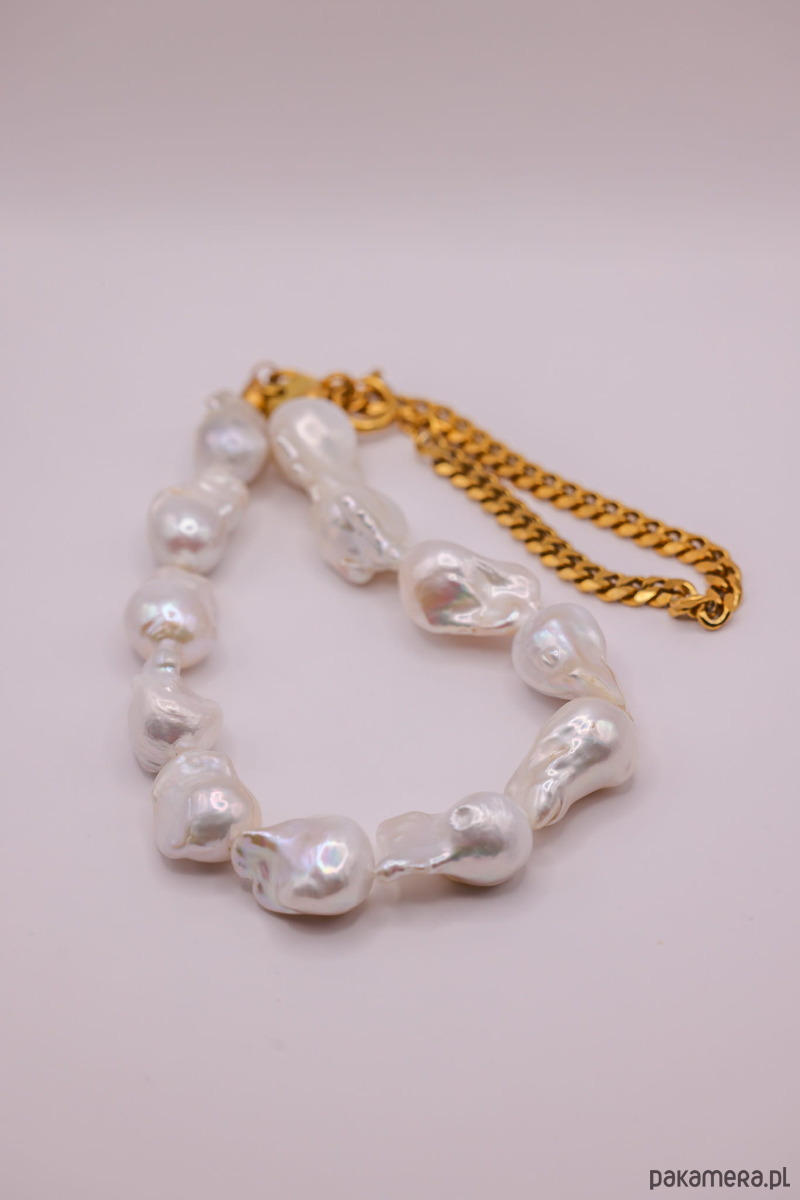 Ręcznie wykonany naszyjnik z pereł naturalnych baroque oraz łańcuszka ze stali chirurgicznej oraz ozdobnego zapięcia.