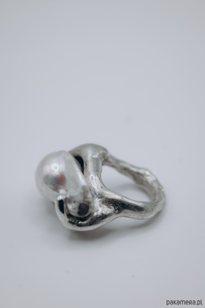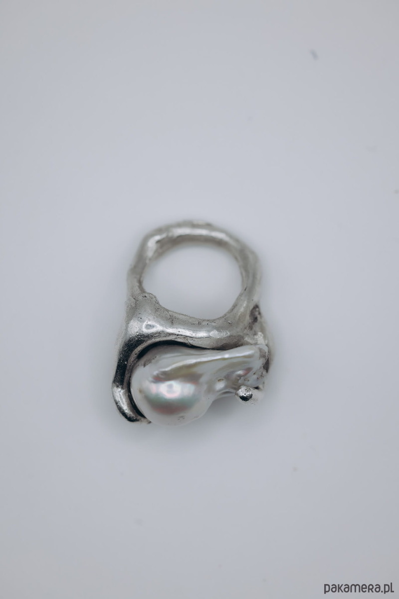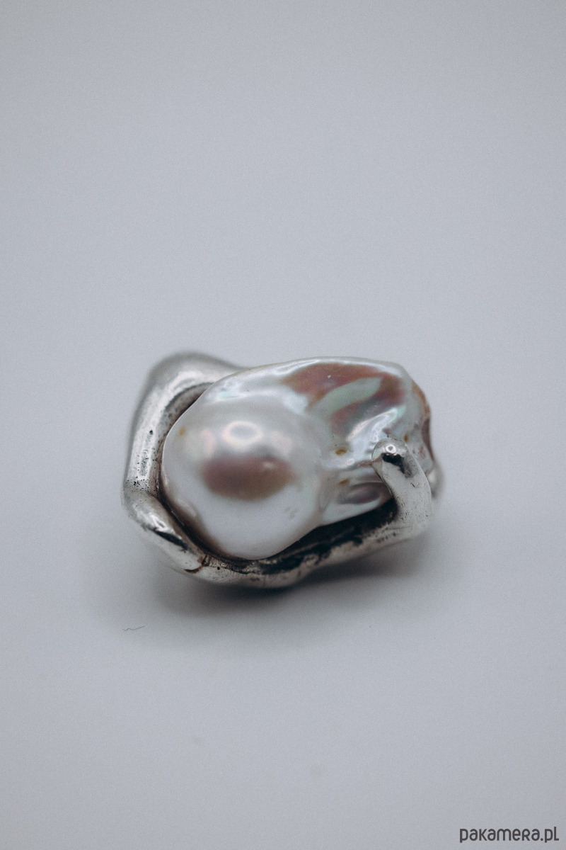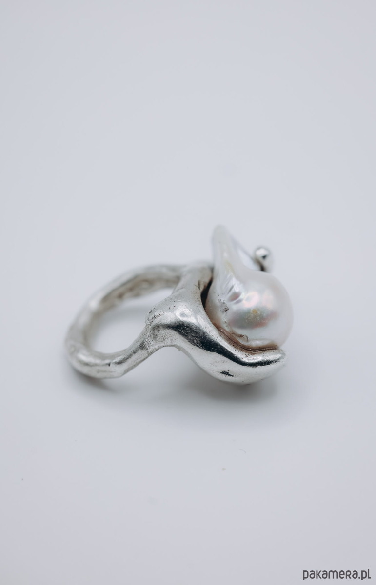 Ręcznie wykonany sygnet metodą wosku traconego. Materiał: n.srebro + perła naturalna baroque.