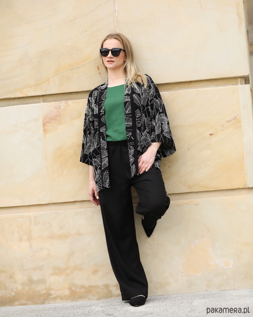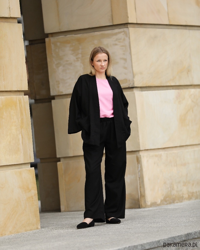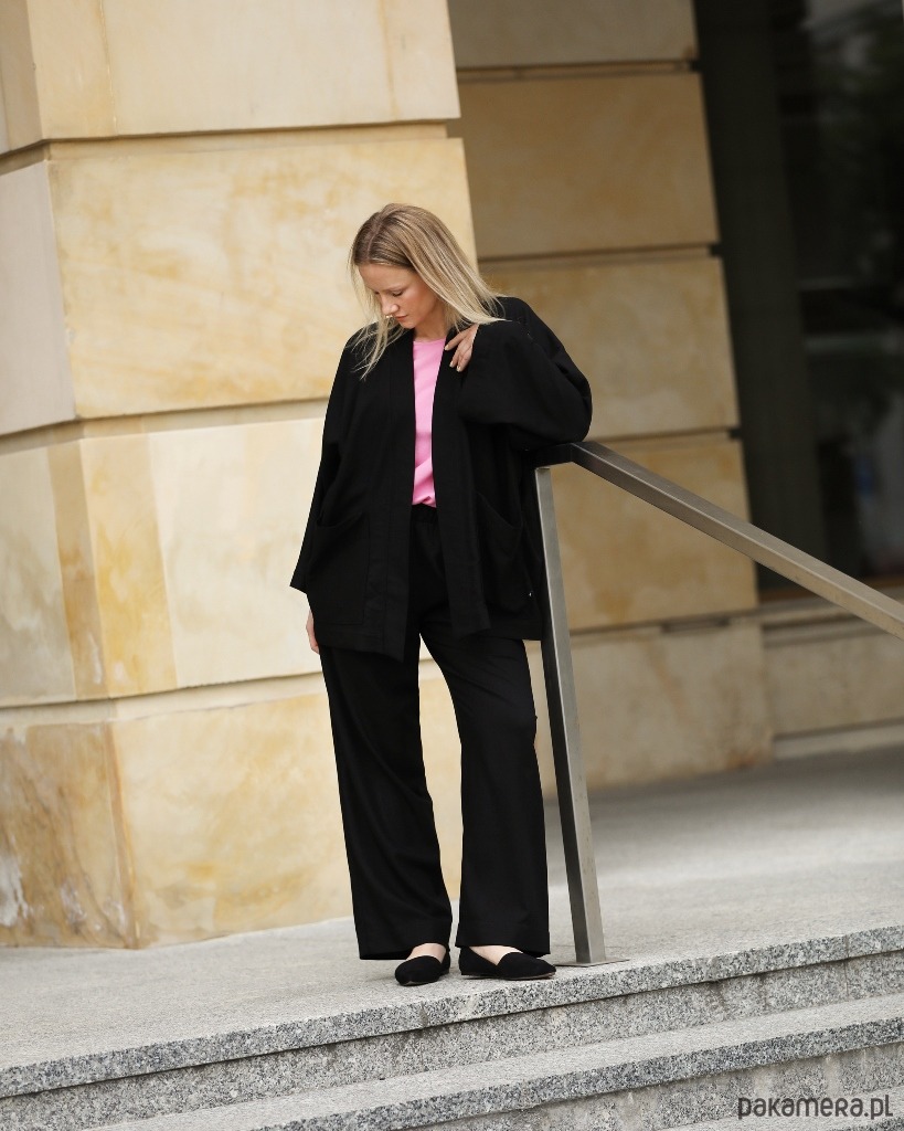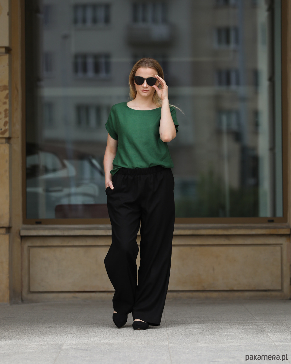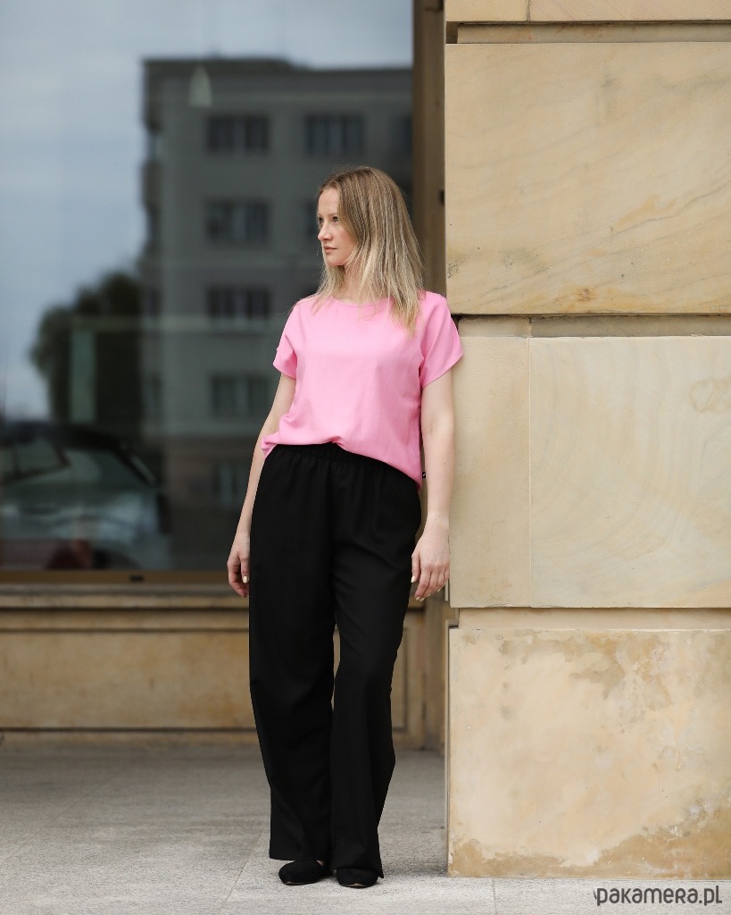 Spodnie można nosić na co dzień, ale z powodzeniem sprawdzą się też w eleganckich stylizacjach na większe wyjścia. Góra spodni wykończona szerokim pasem z wszytą wewnątrz gumą. Po bokach dwie cięte kieszenie.