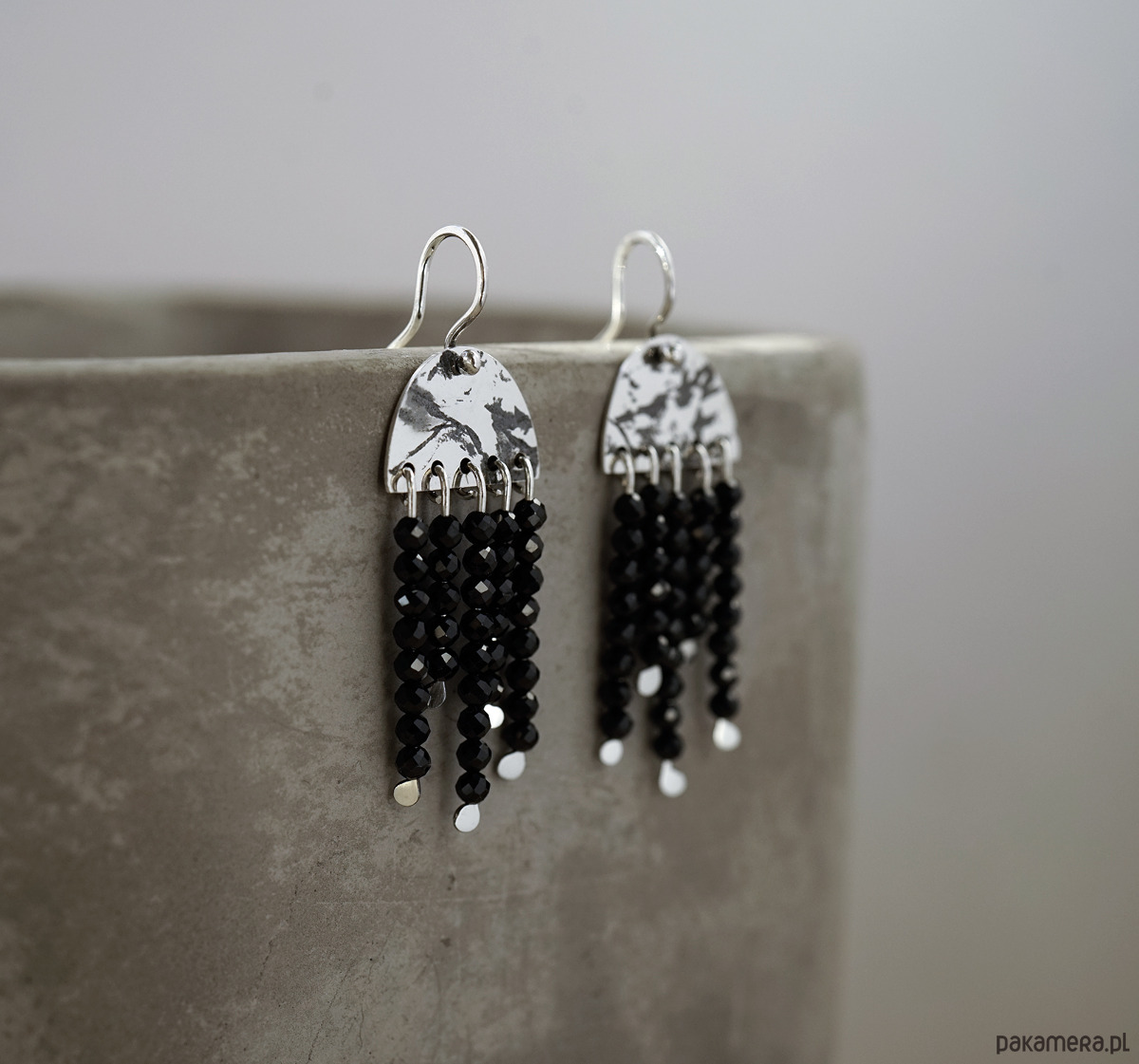 Kolczyki wykonane z fakturowanego, oksydowanego, polerowanego srebra i fasetowanych spineli.