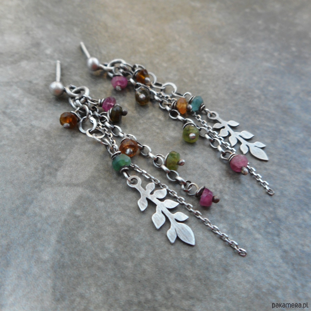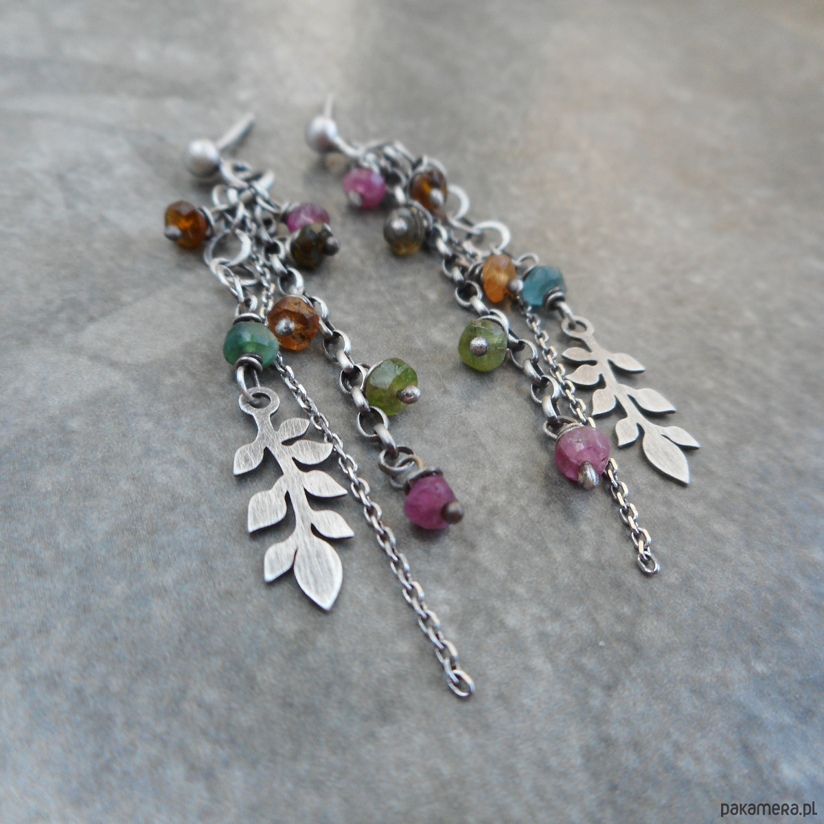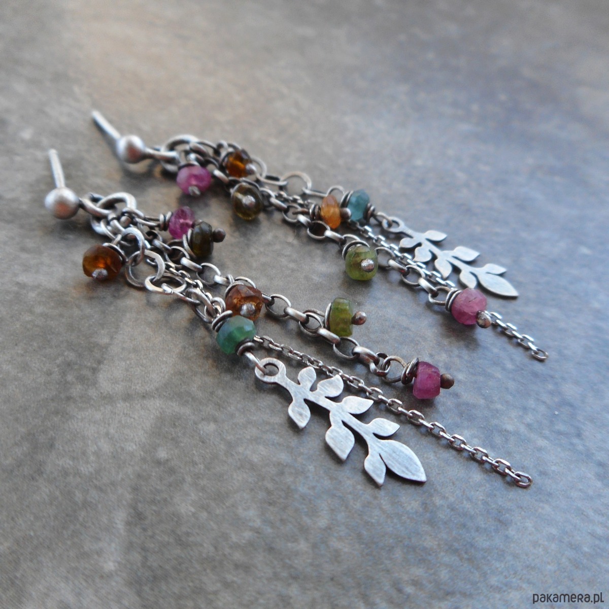 Wyjątkowe, zwiewne kolczyki z kamieni naturalnych i szlachetnego srebra; delikatne i lekkie, w formie roślinnych  gronek zawieszonych na subtelnych sztyftach.
