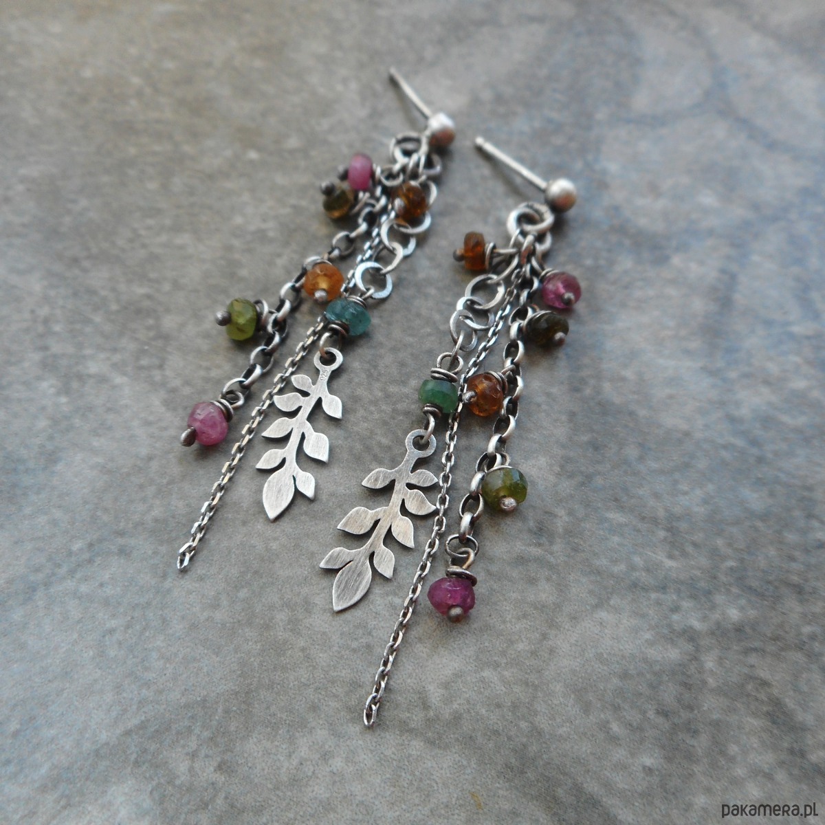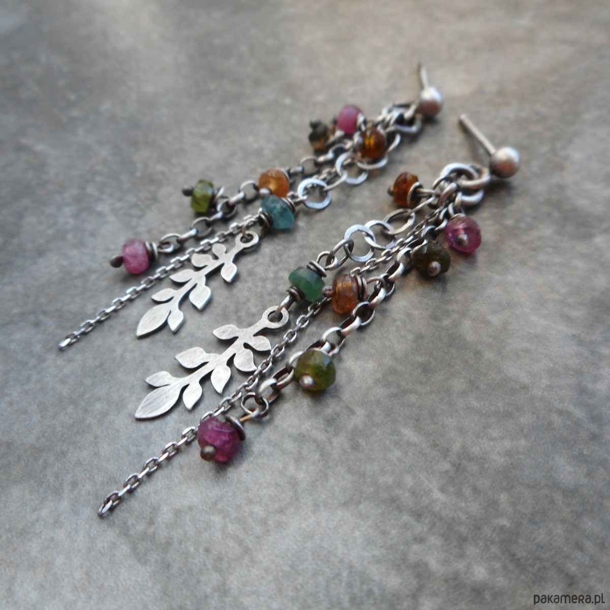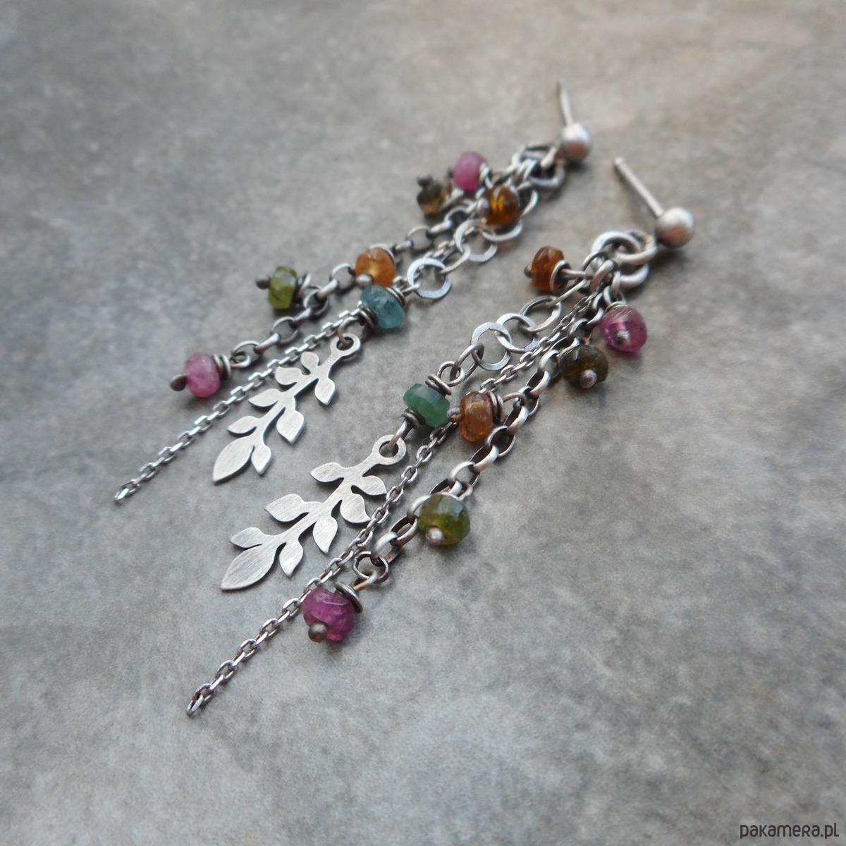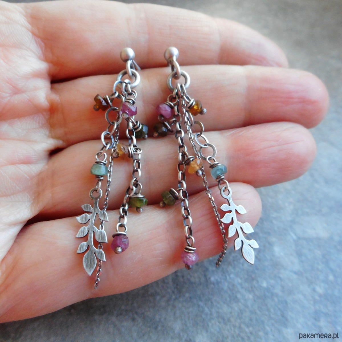 Wyjątkowe, zwiewne kolczyki z kamieni naturalnych i szlachetnego srebra; delikatne i lekkie, w formie roślinnych  gronek zawieszonych na subtelnych sztyftach.