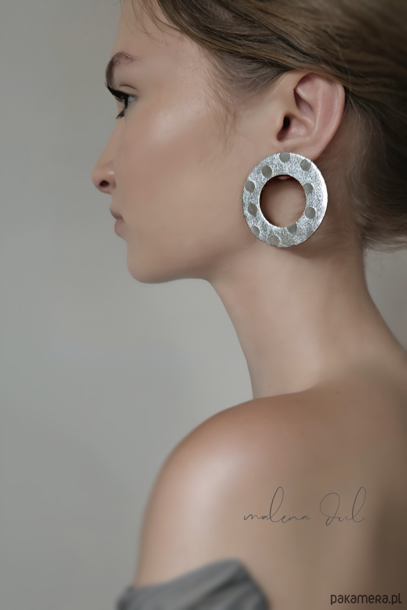 Awangardowe kolczyki, koła, wykonane ze srebrnej skóry naturalnej w kropki, również se srebrnej skory ale z efektem lustra.