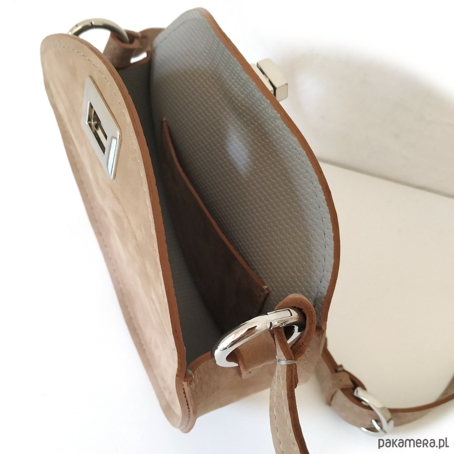 -wierzch torebki beżowa skóra z nubukowym - miękkim w odczuciu wykończeniem lica