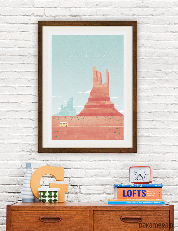 Plakat w stylu vintage przedstawiający panoramę Monument Valley w Arizonie. Na pierwszym planie żółty kamper VW sunie to ikonicznej drodze międzystanowej Route 66. W tle widnieją majestatyczne formacje skalne Monument Valley. Inspirowany plakatami podróżniczymi z lat 20-tych XX wieku.