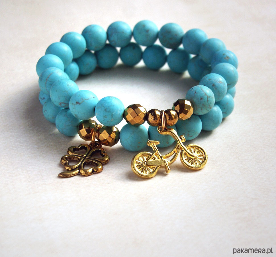 ZJAWISKOWA bransoletka na solidnej lince elastycznej, wykonana z pięknego, MATOWEGO howlitu turkusowego (kule 10mm), dodatkowo kuleczka złotego hematytu ; zawieszka - rowerek
