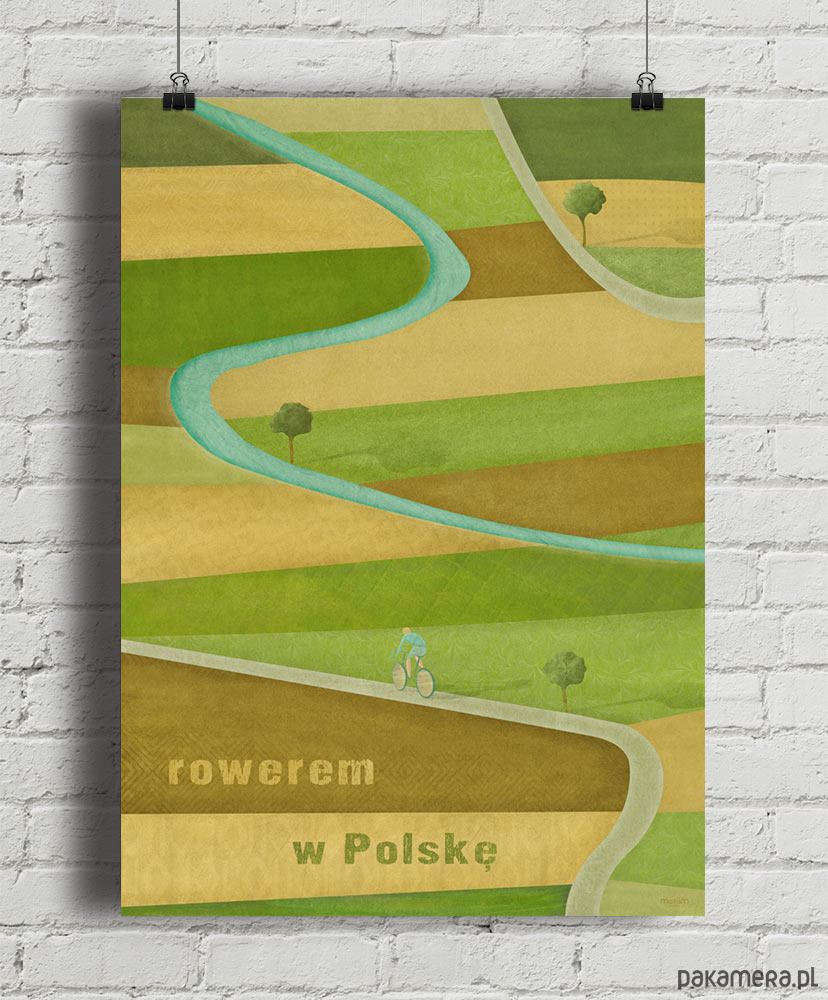 Plakat z niepowtarzalnym polskim krajobrazem - patchworkowymi polami przeciętymi niebieską wstążką rzeki.