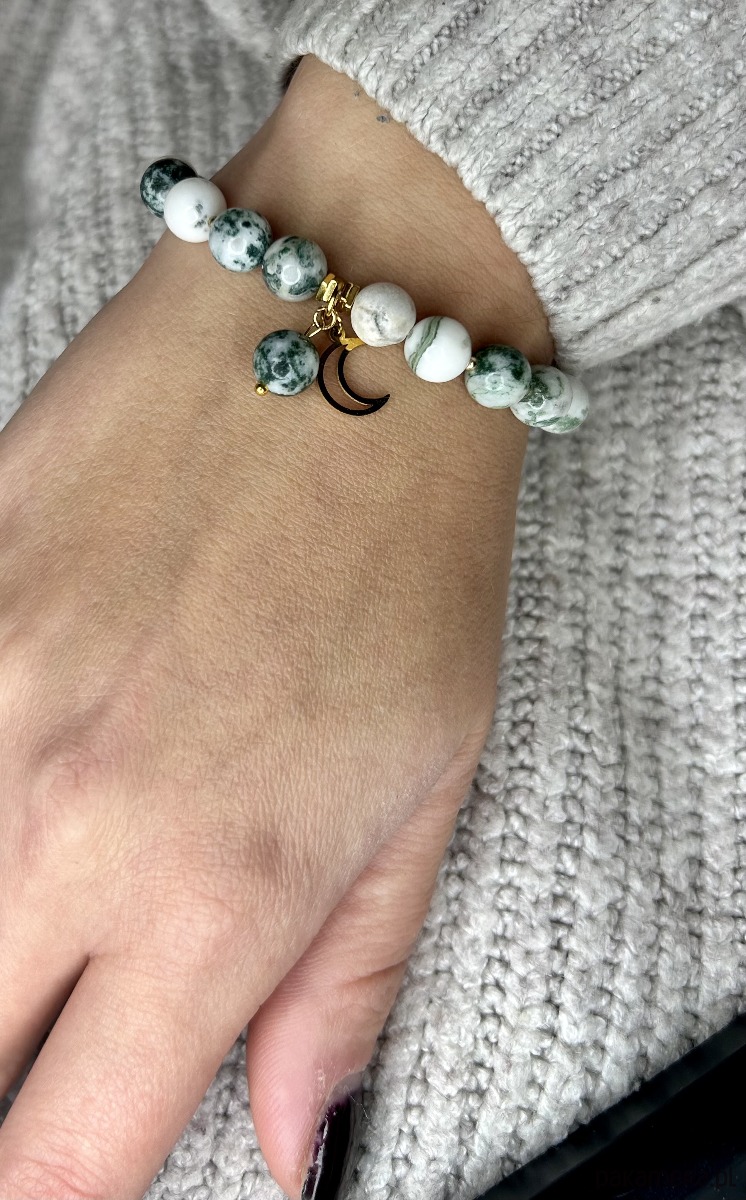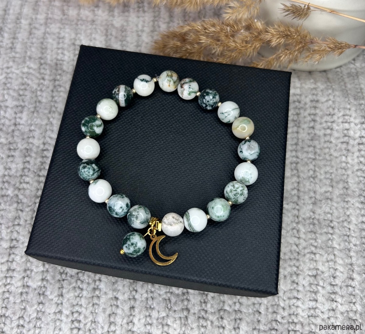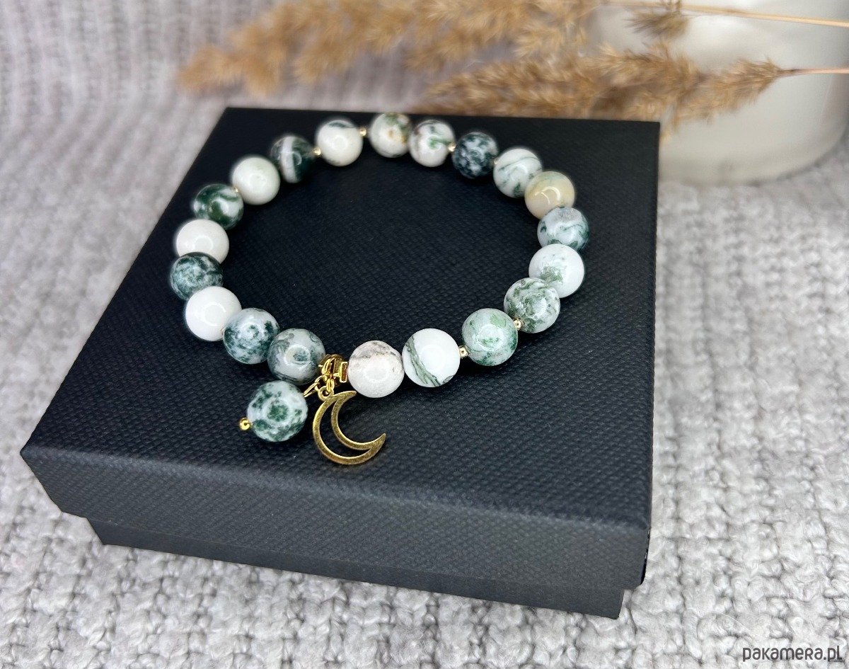 Ta wyjątkowa bransoletka została wykonana z agatu mszystego – kamienia natury, równowagi i wewnętrznego spokoju. Jego delikatna, zielono-biała barwa przypomina leśną mgłę i symbolizuje odrodzenie oraz połączenie z Ziemią.