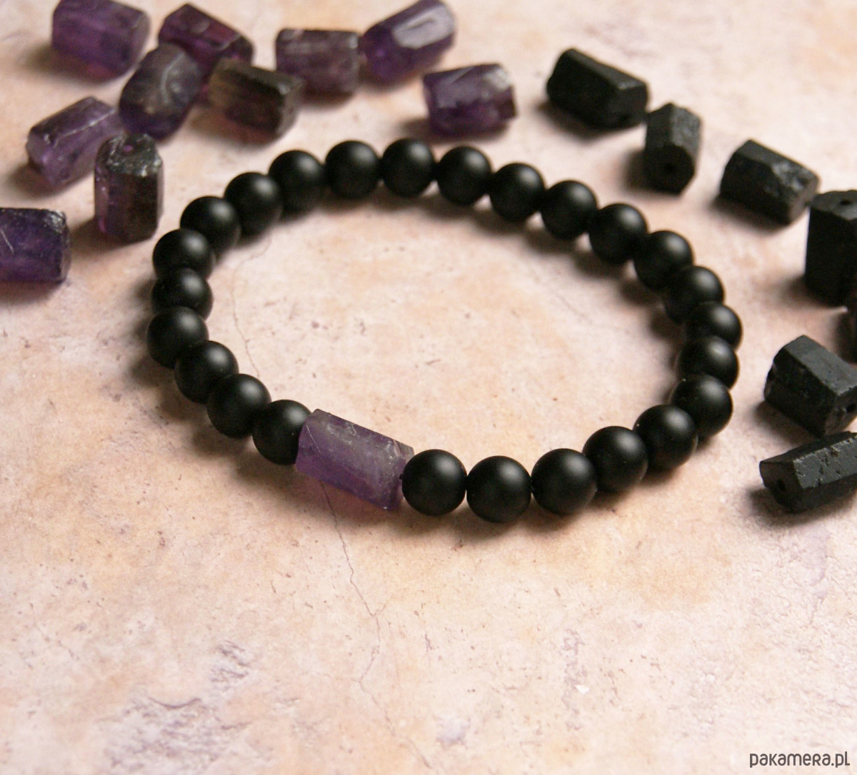 prosta, lecz ciekawa bransoletka na solidnej gumce jubilerskiej wykonana z ametystu (bryłka surowa, ciosana) oraz matowego onyksu (8mm)