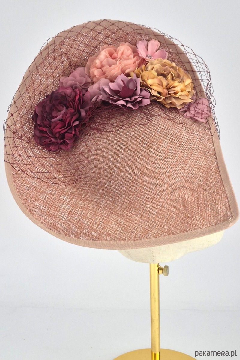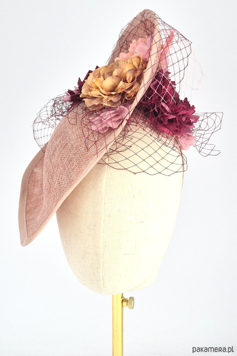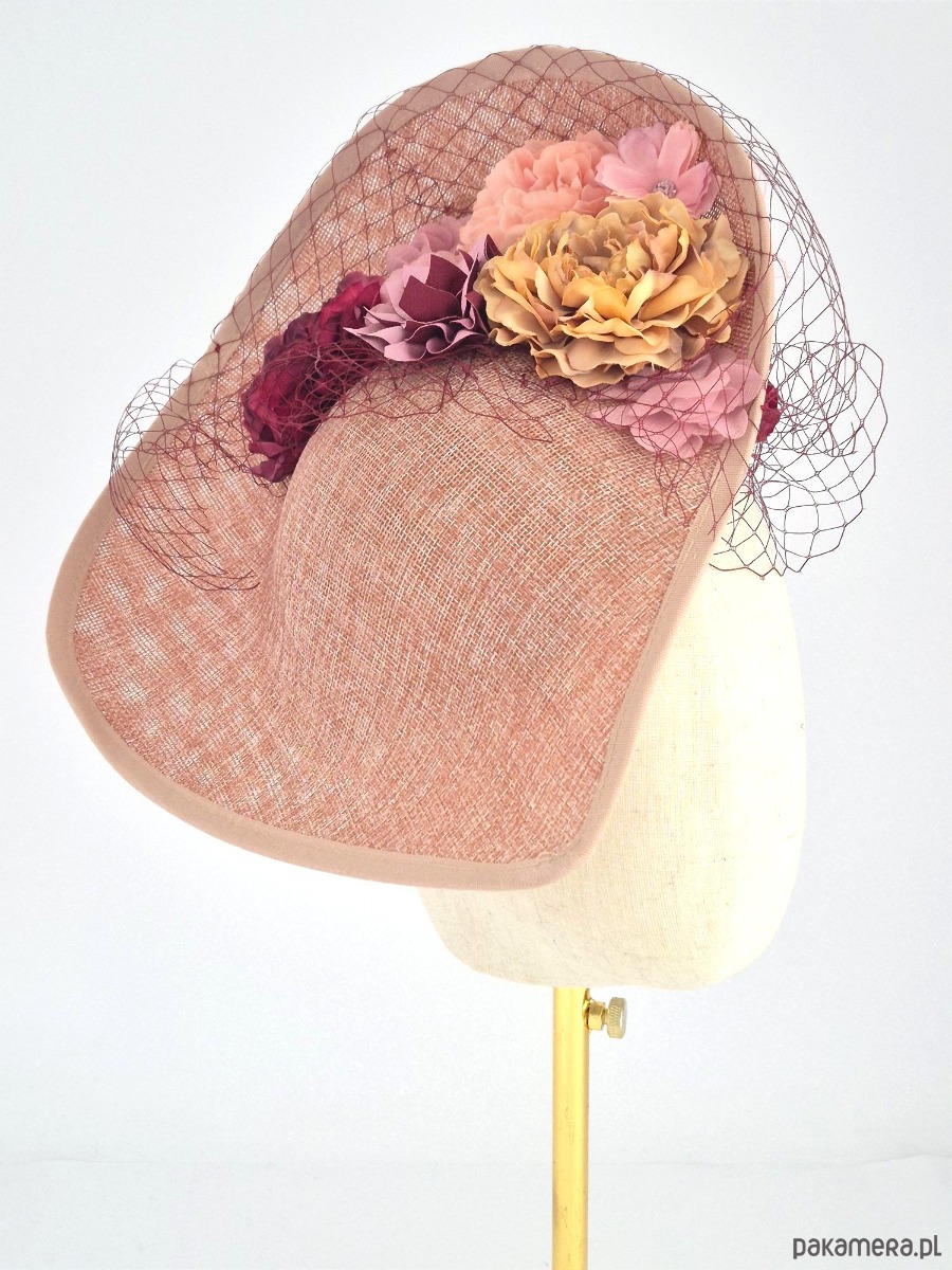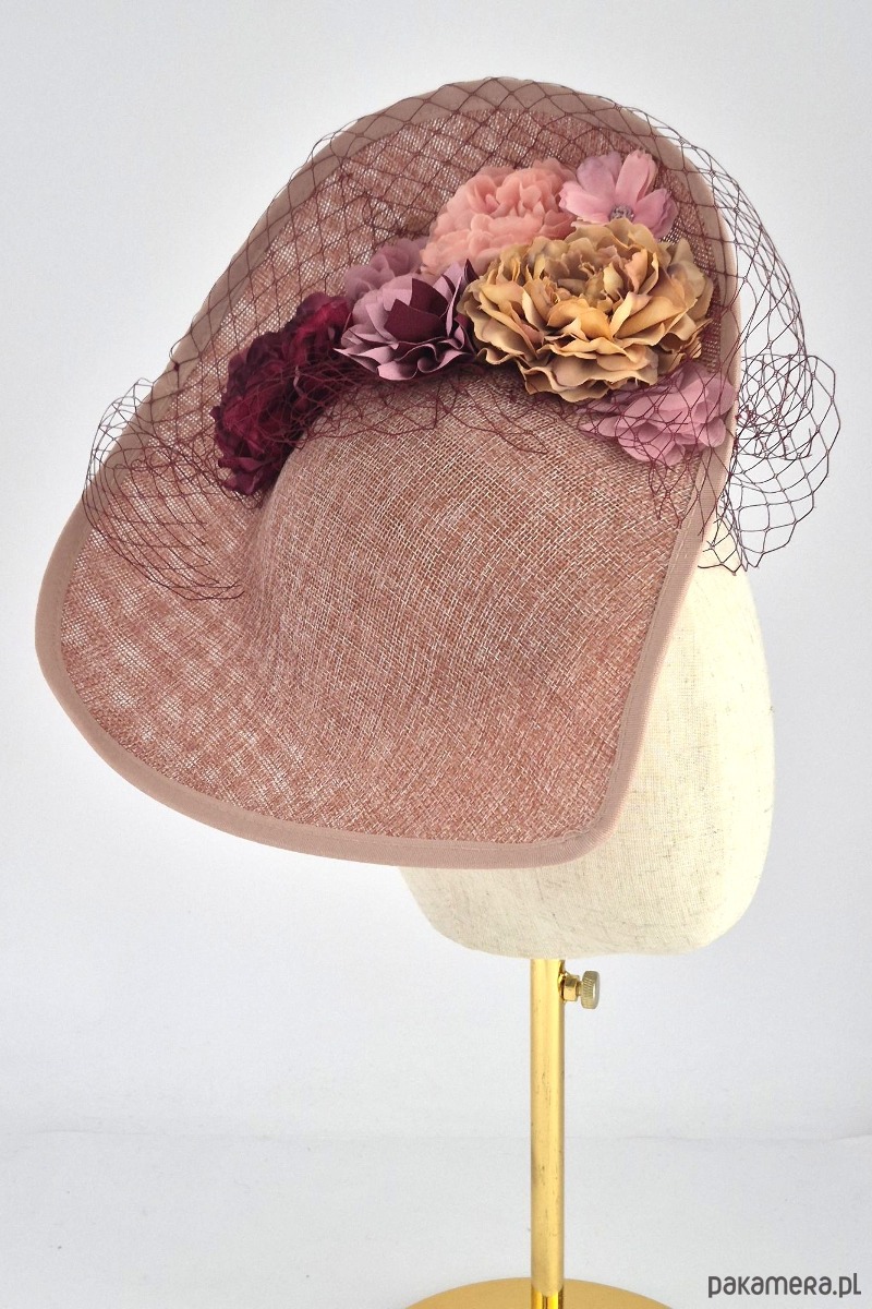 Baza: Asymetryczna, rzeźbiarska forma o nietypowym kształcie (kojarzącym się z wywiniętym rondem lub misterną fałdą), wykonana z wysokiej jakości tkaniny z naturalnych włókien o wyraźnym splotcie. Kolor bazy to ciepły, melanżowy odcień brudnego różu wpadającego w terakotę.