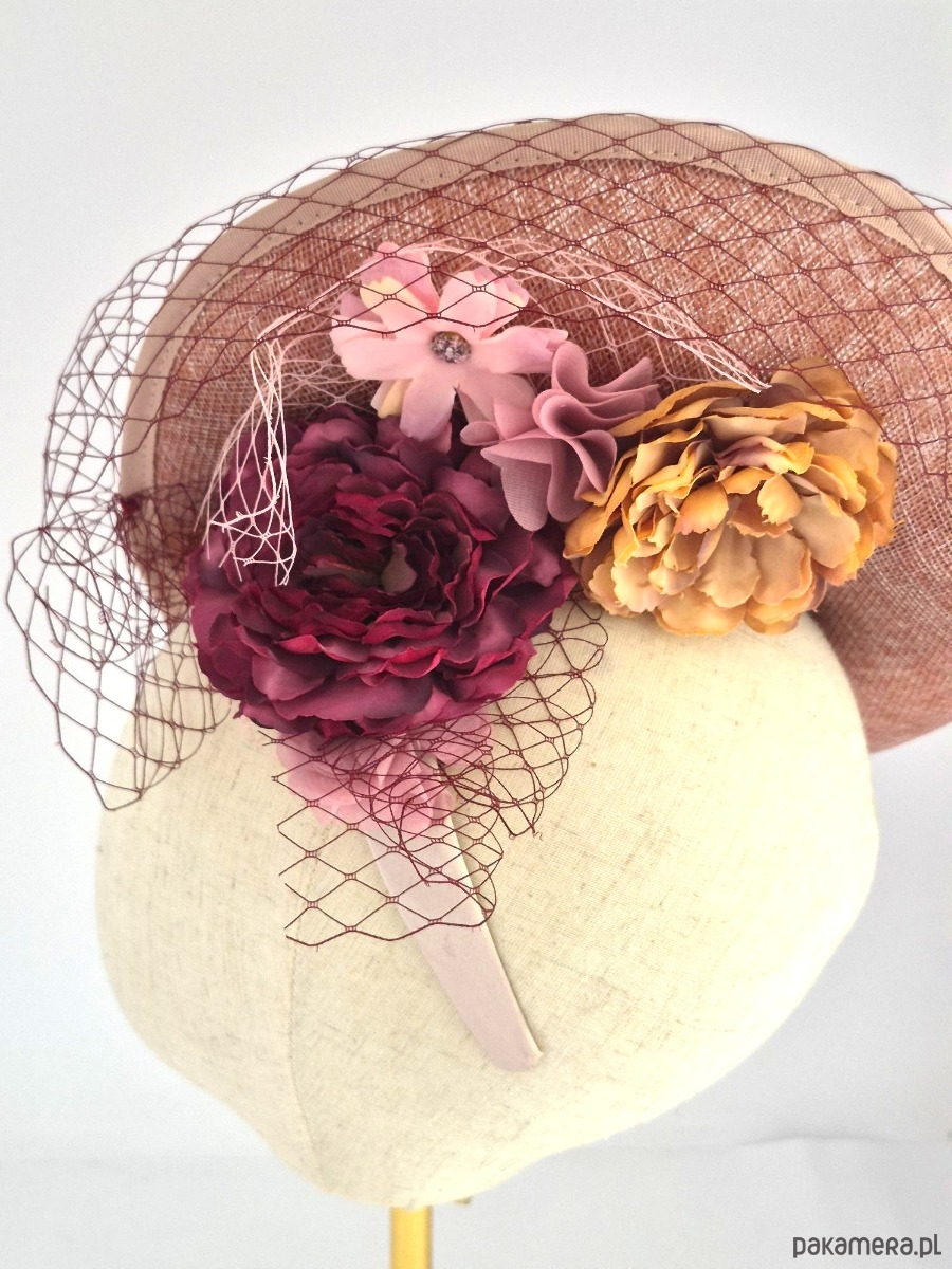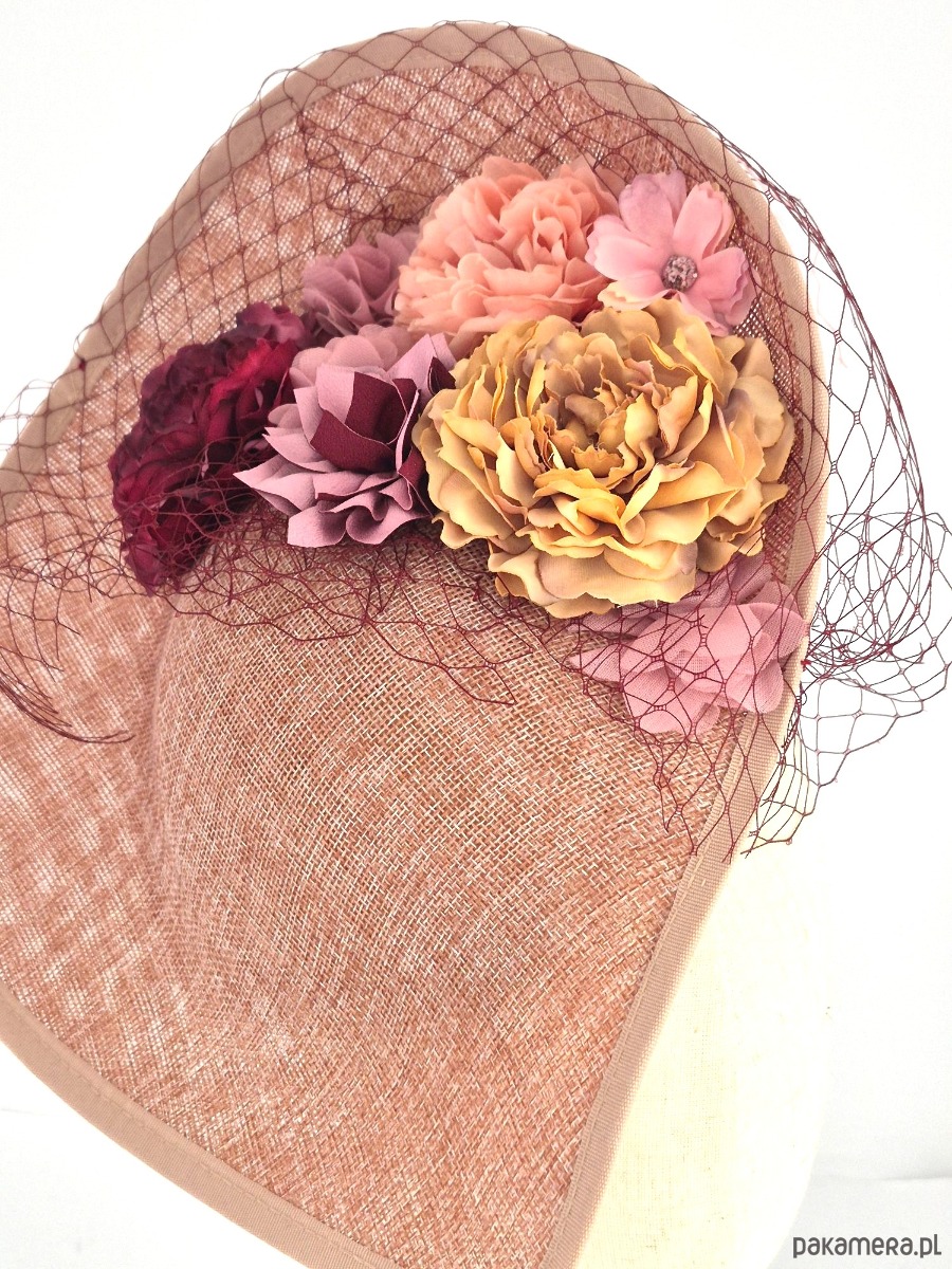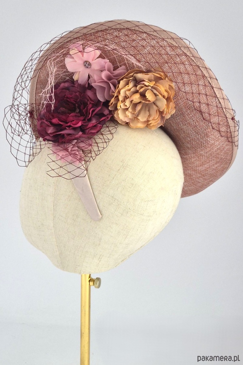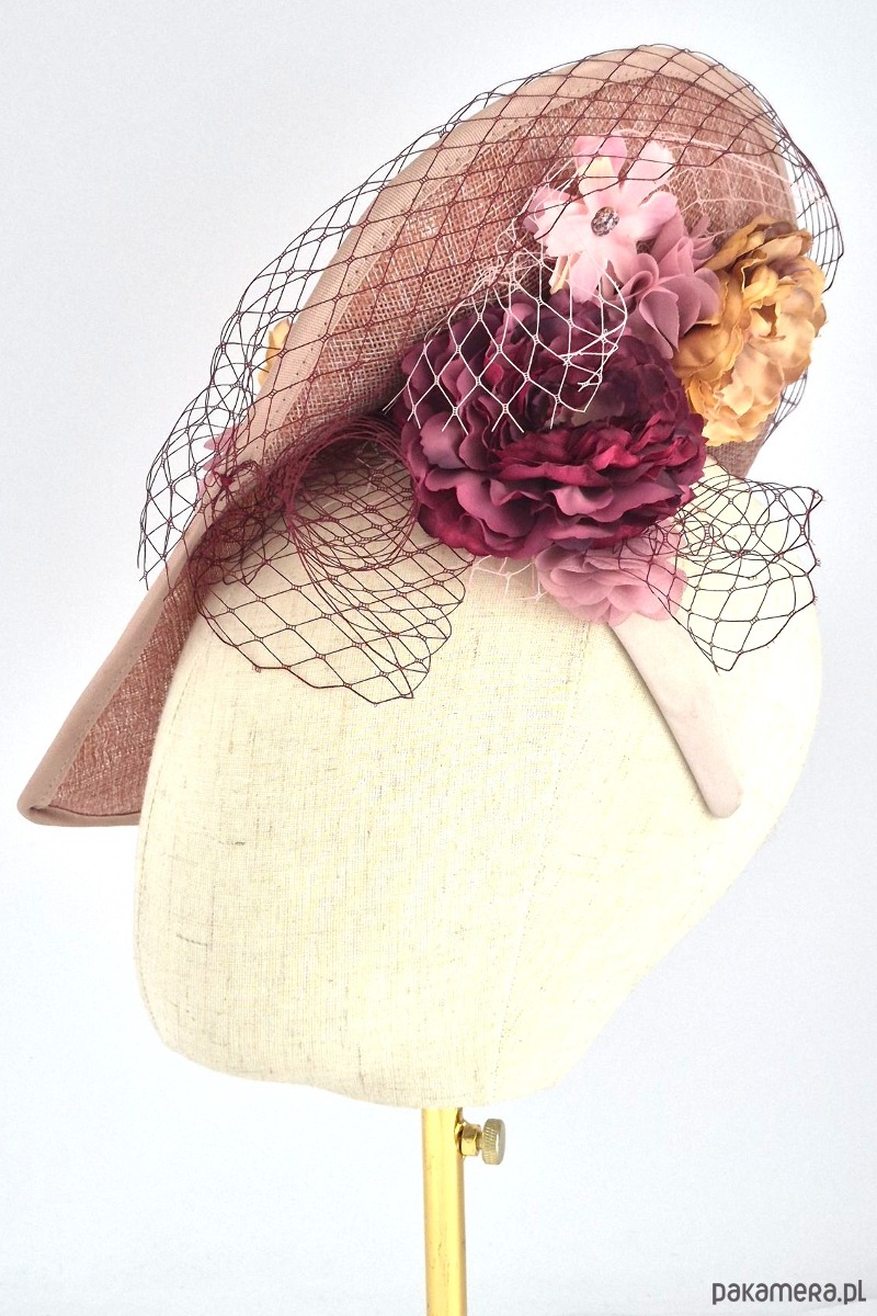 Baza: Asymetryczna, rzeźbiarska forma o nietypowym kształcie (kojarzącym się z wywiniętym rondem lub misterną fałdą), wykonana z wysokiej jakości tkaniny z naturalnych włókien o wyraźnym splotcie. Kolor bazy to ciepły, melanżowy odcień brudnego różu wpadającego w terakotę.