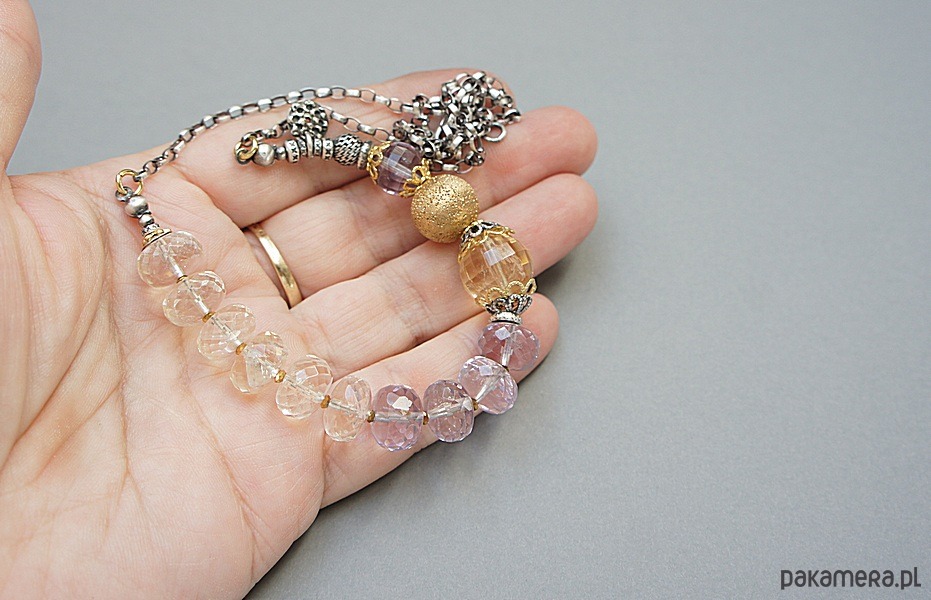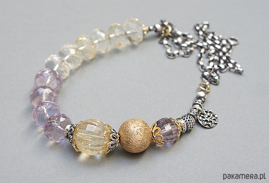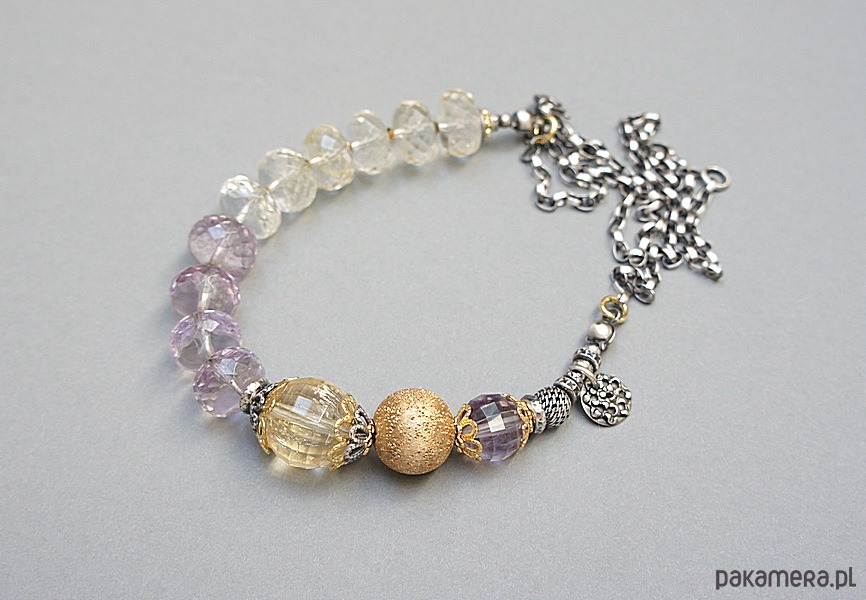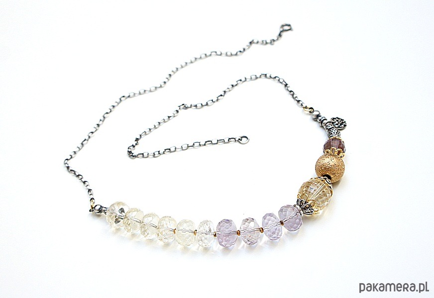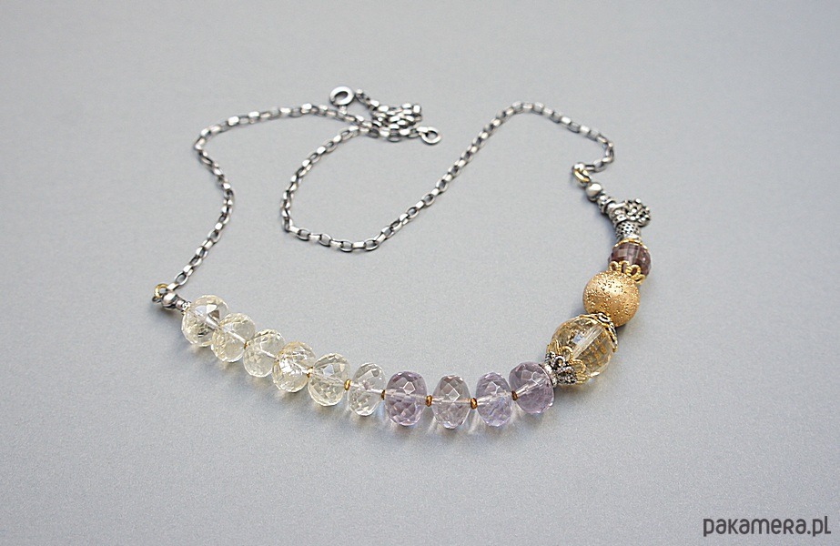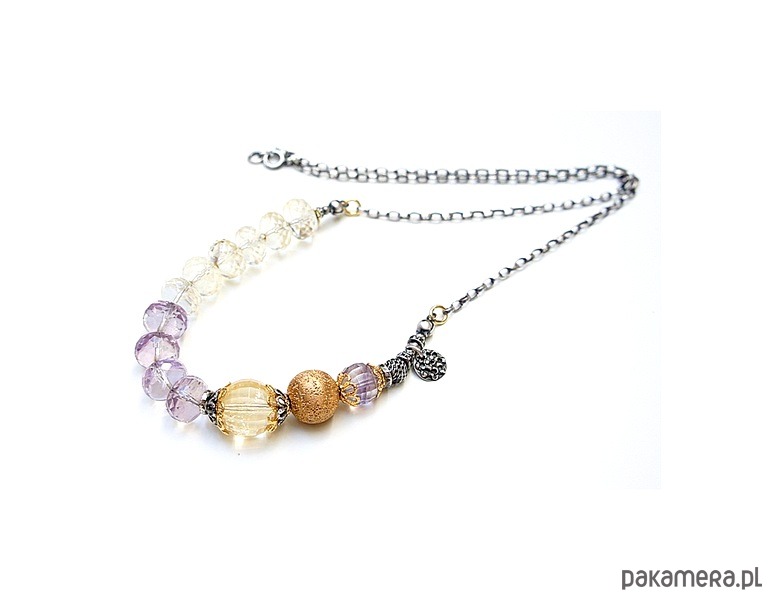 Naszyjnik wykonany ze srebra i srebra pokrytego 24k złotem [pr. 925] w połączeniu z wysokiej jakości fasetowanymi minerałami: oponkami ametrynów [12mm ], fasetowaną kuleczką cytrynu [14mm - kamień posiada wewnątrz naturalne inkluzje i spękania], fasetowaną kuleczką ametrynu [10mm] oraz złoconą, masywną brokatową kulą [12mm]. Srebro częściowo oksydowane i przetarte. Całkowita długość naszyjnika 43,5cm. Biżuteria ozdobnie zapakowana.