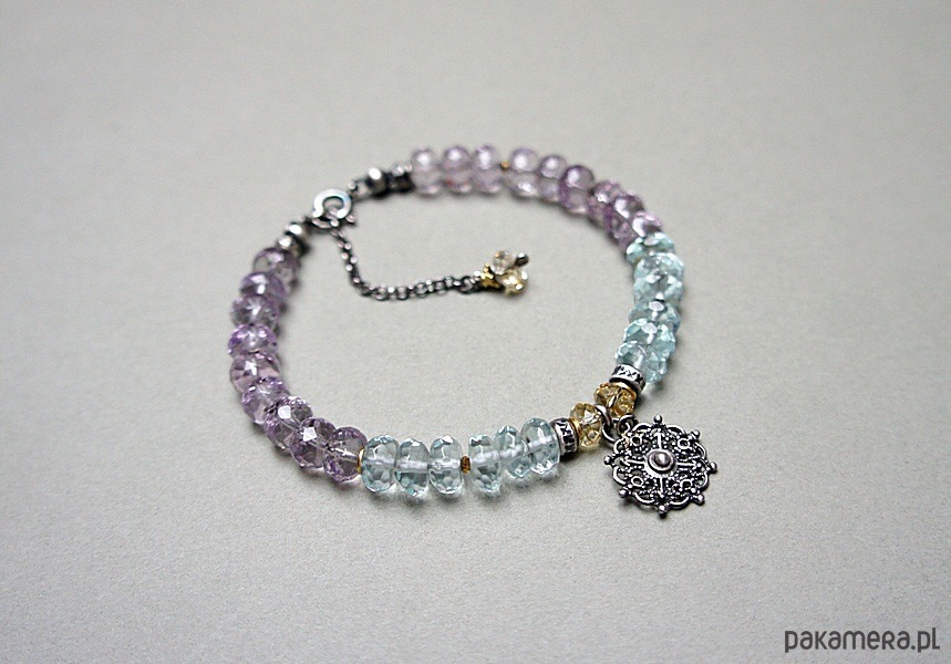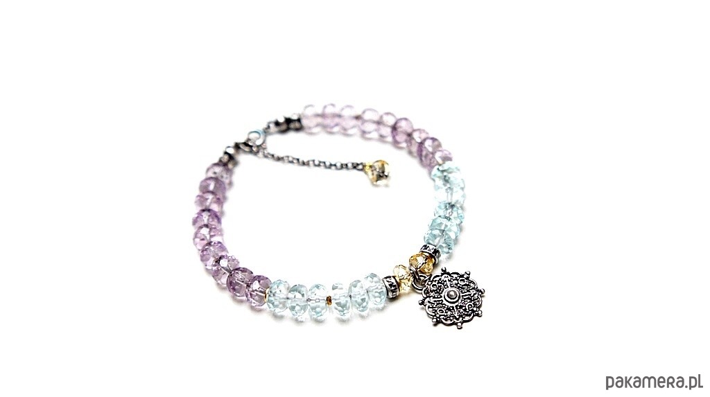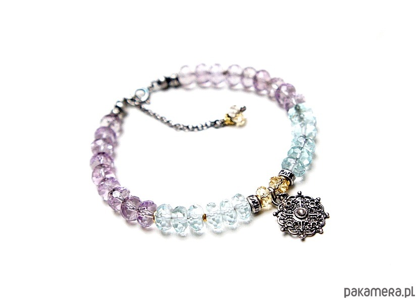 Bransoletka wykonana ze srebrai srebra pokrytego 24k złotem [pr. 925] w połączeniu z wysokiej jakości fasetowanymi oponkami kwarców aqua [8mm] ,ametystów [8mm] ,cytrynów [6mm] .Srebro częściowo oksydowane i przetarte . Całkowita długość bransoletki 19,5cm plus ozdobna przedłużka . Biżuteria ozdobnie zapakowana.