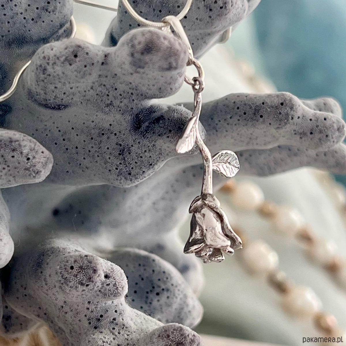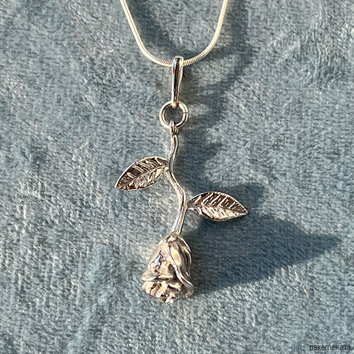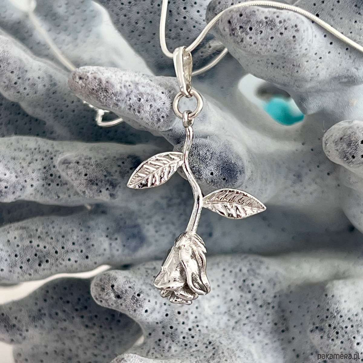 Ta srebrna różyczka, wykonana ze srebra próby 925, opada lekko na łańcuszku niczym świeżo zerwany kwiat. Smukła łodyga i subtelnie rzeźbione listki nadają jej elegancji i romantycznego charakteru. To biżuteria, która nie krzyczy — ona opowiada historię.