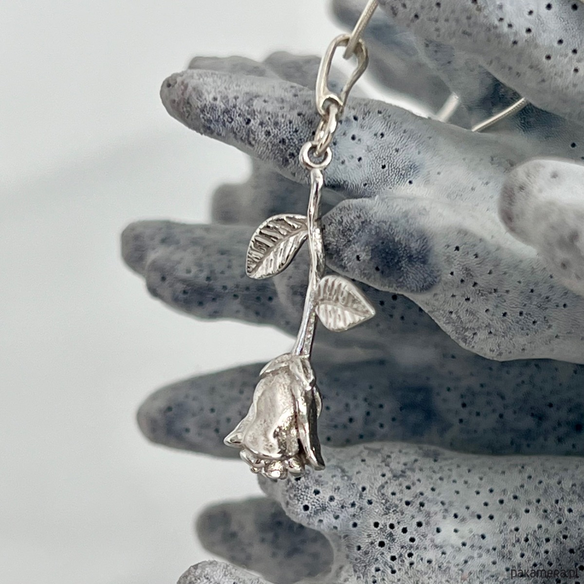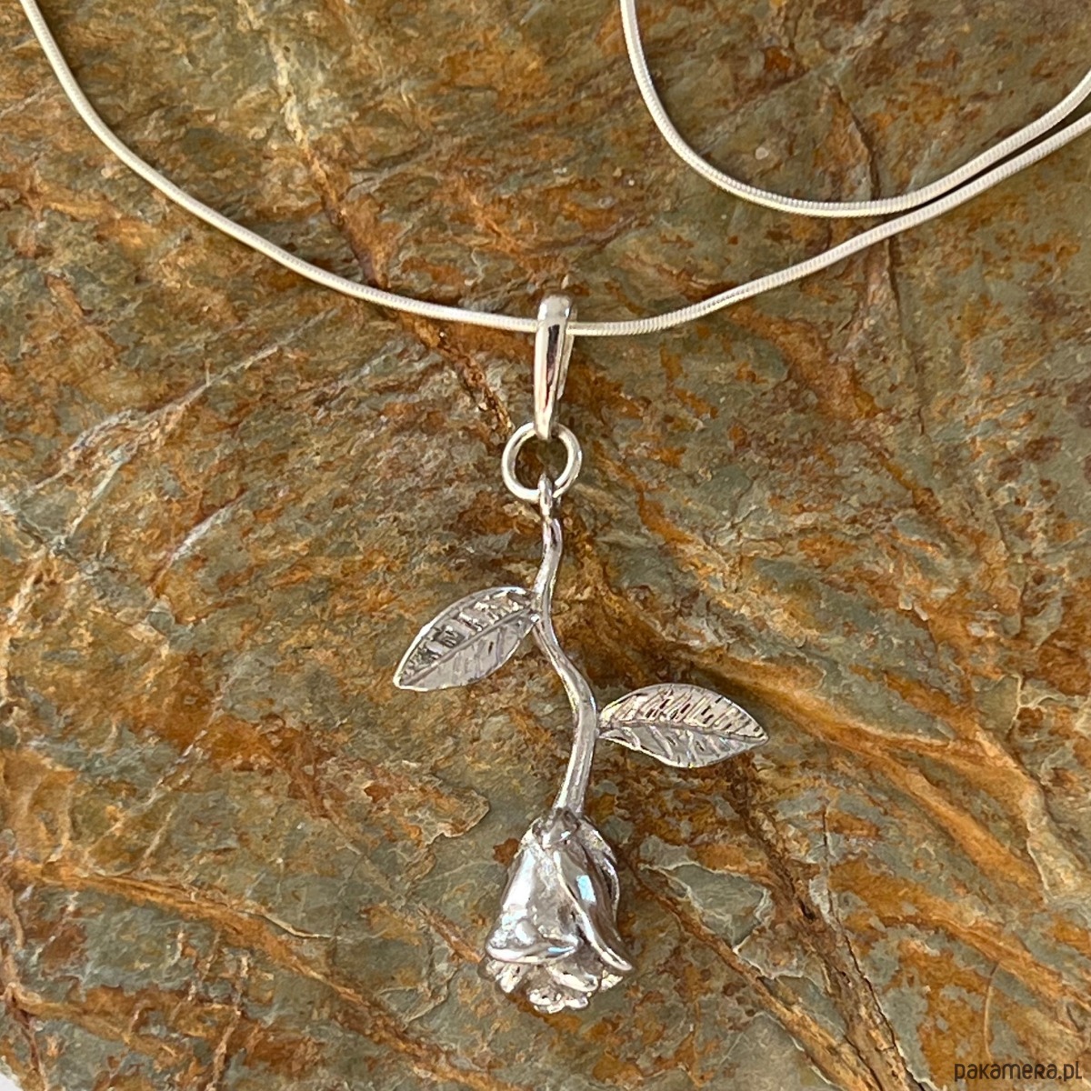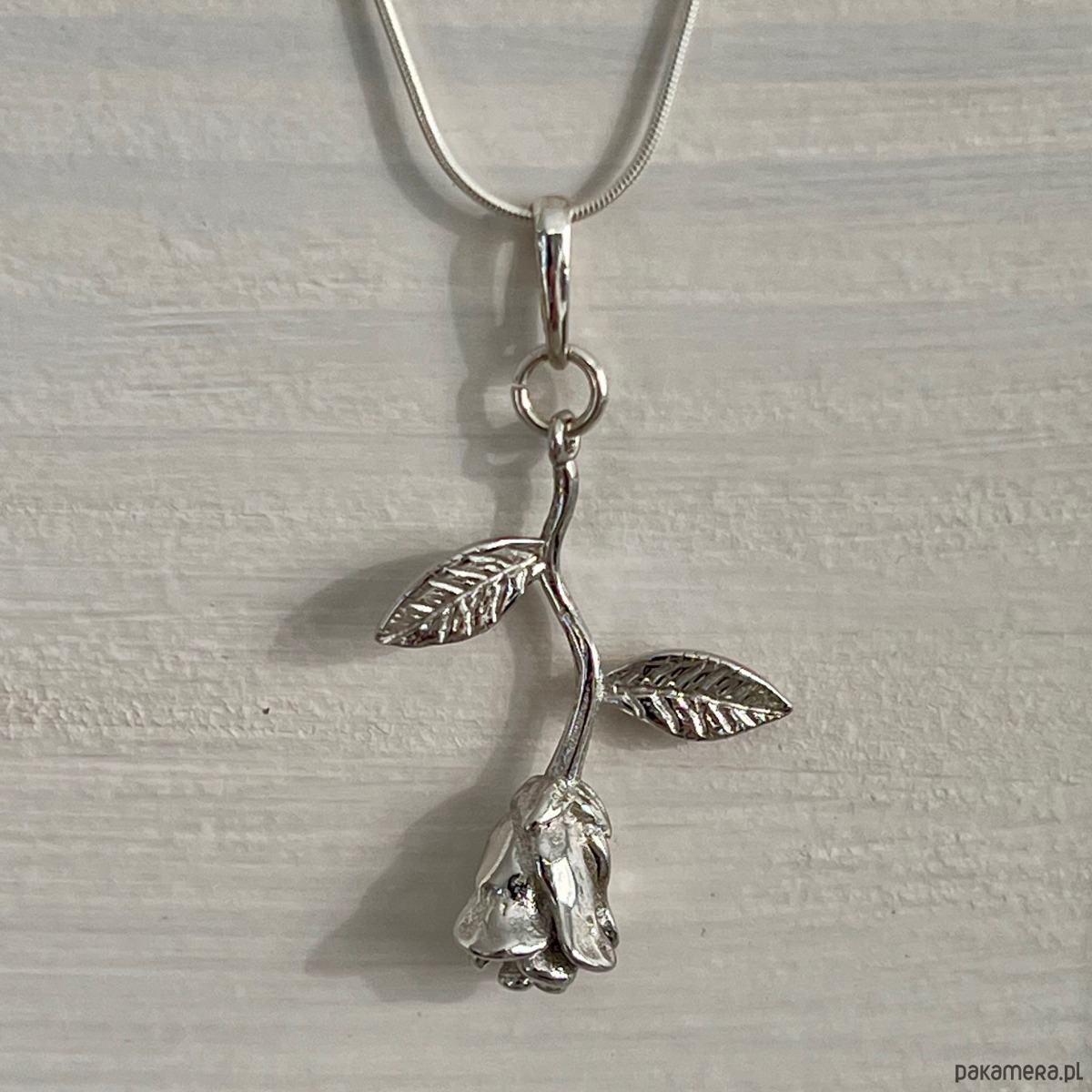 Ta srebrna różyczka, wykonana ze srebra próby 925, opada lekko na łańcuszku niczym świeżo zerwany kwiat. Smukła łodyga i subtelnie rzeźbione listki nadają jej elegancji i romantycznego charakteru. To biżuteria, która nie krzyczy — ona opowiada historię.