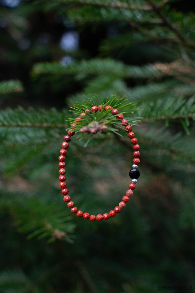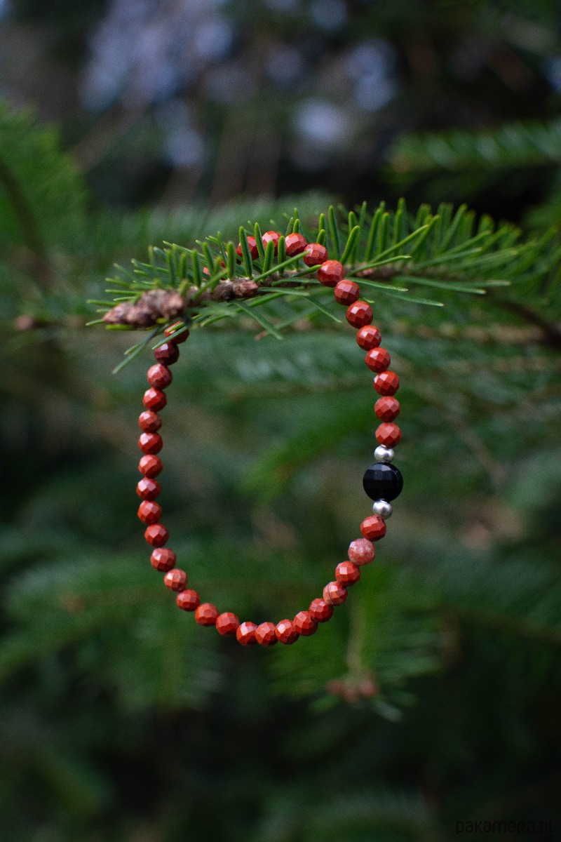 Materiały ~ elastyczna gumka jubilerska, jaspis czerwony fasetowany, onyks, srebrne elementy ze stali szlachetnej.
