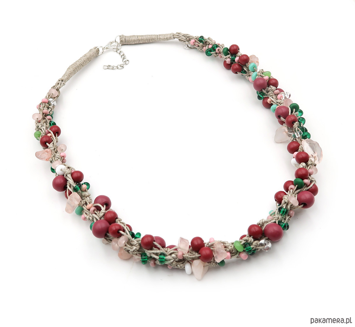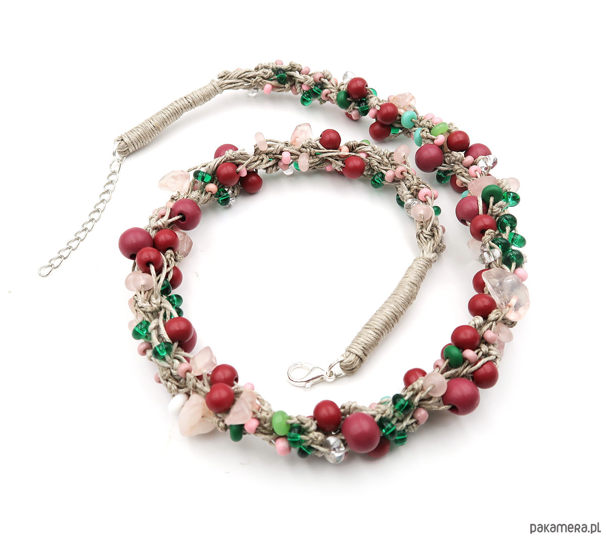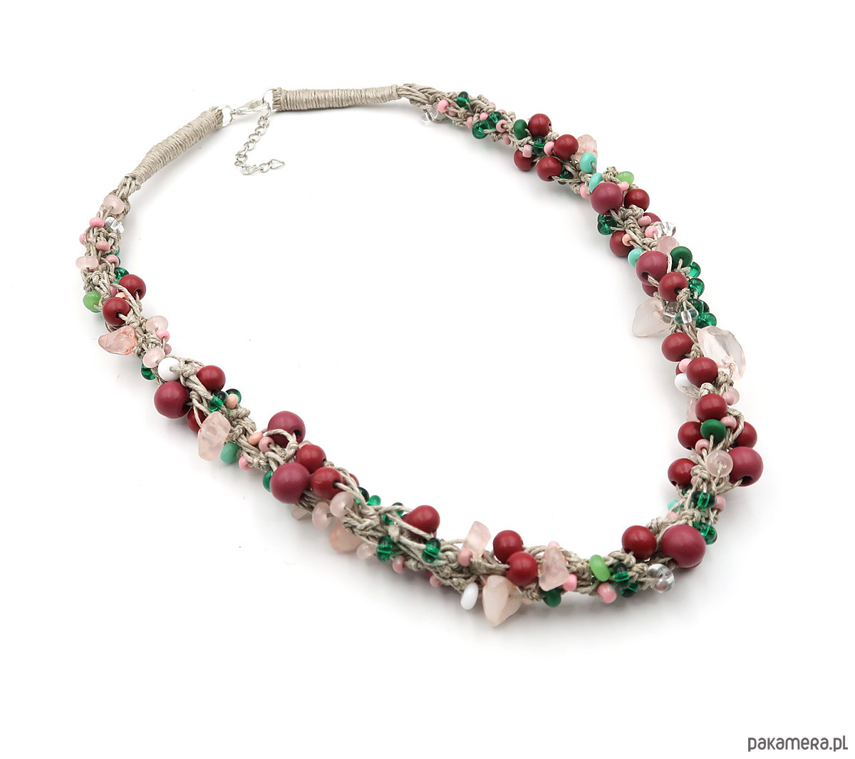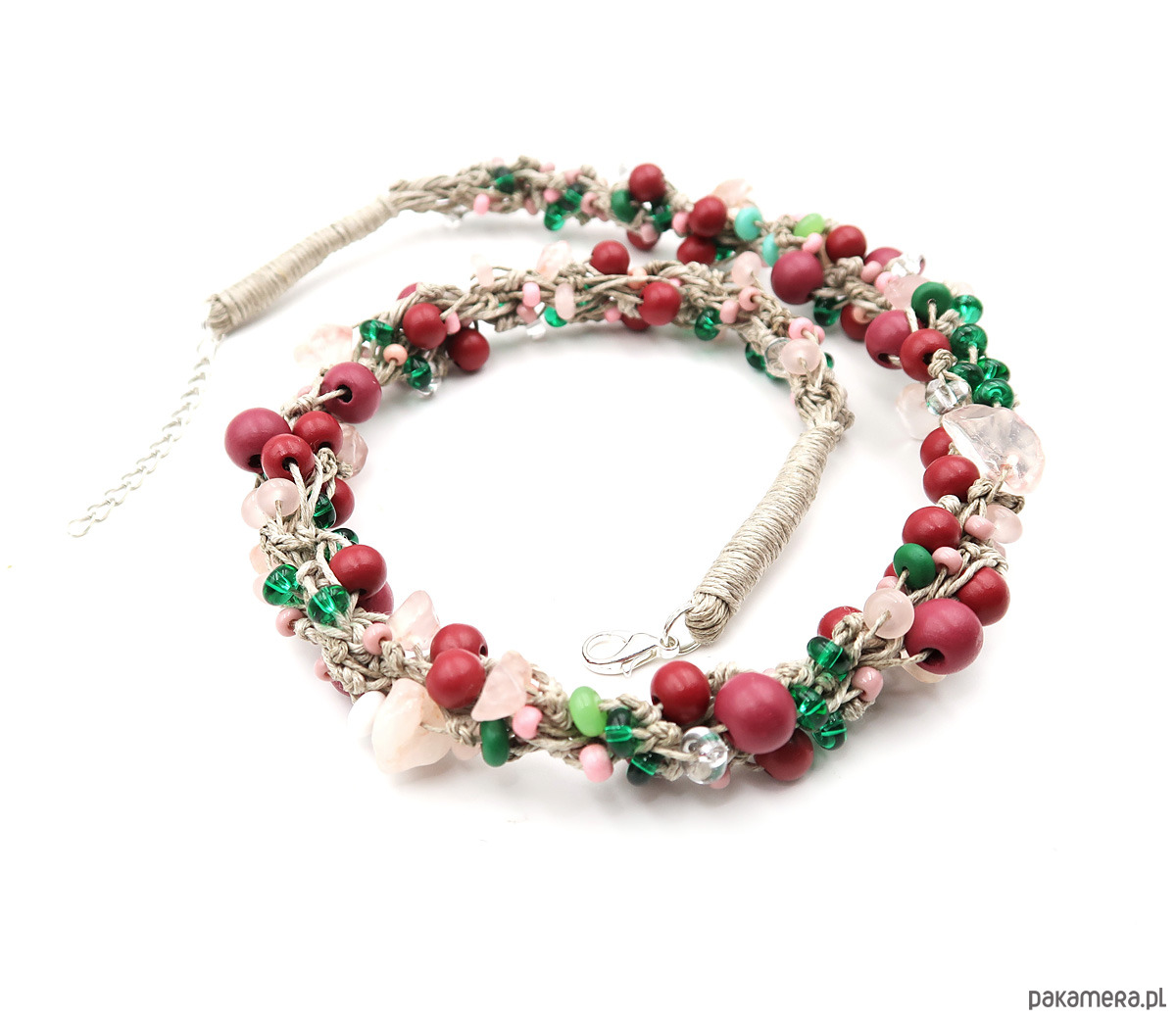Lekki, naturalny naszyjnik w odcieniach subtelnego różu, malinowych tonów i delikatnej zieleni, inspirowany miękkością letnich barw. To autorska biżuteria wykonana na naturalnej, polskiej przędzy lnianej, łącząca lekkość formy z harmonią naturalnych kolorów.