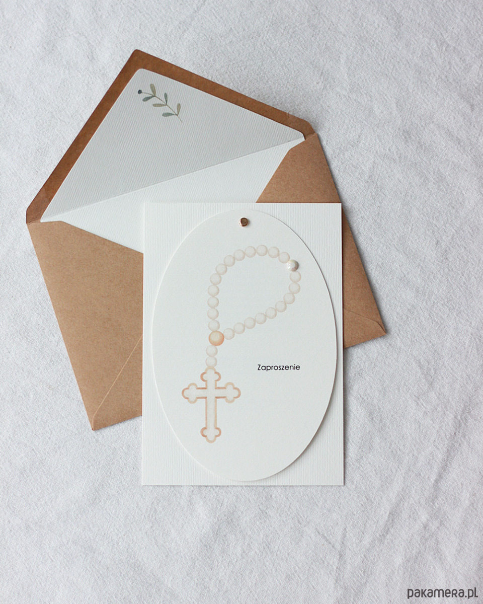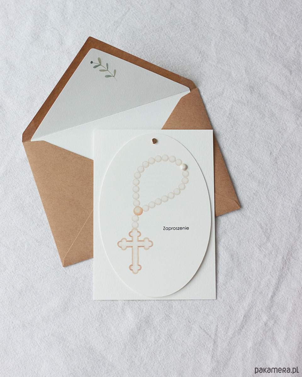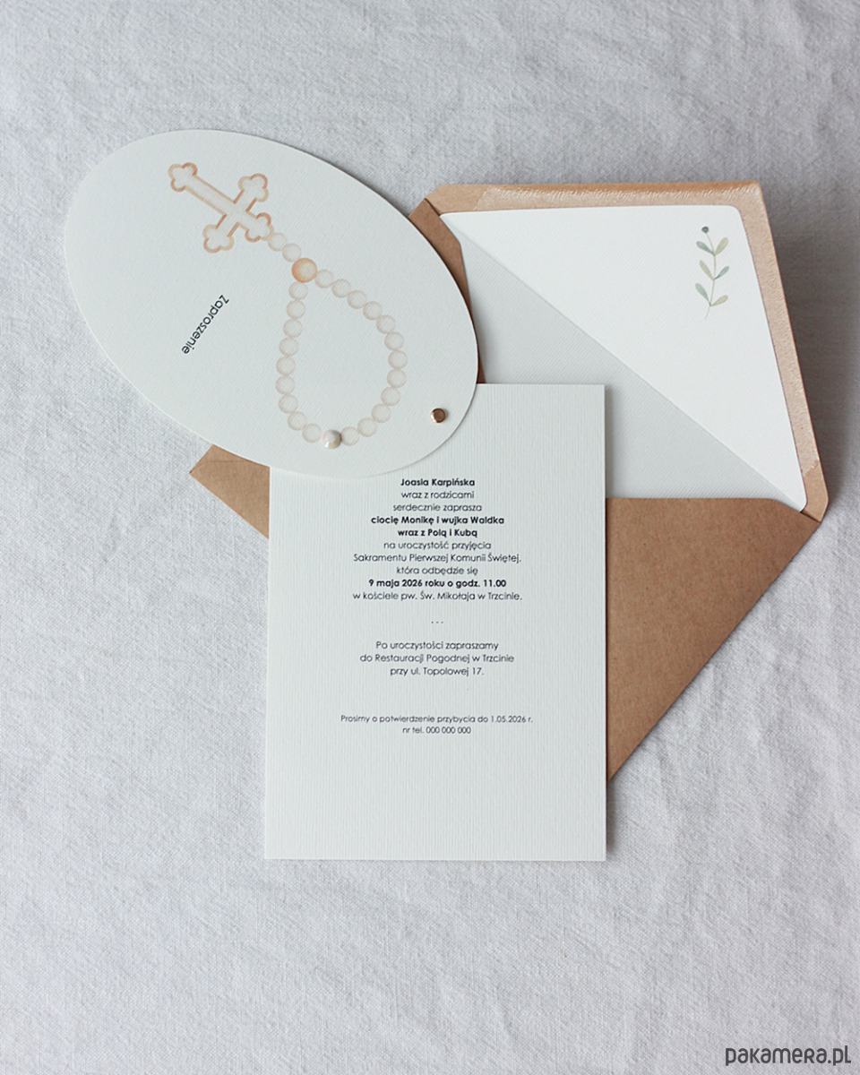 Delikatne zaproszenia komunijne z różańcem.