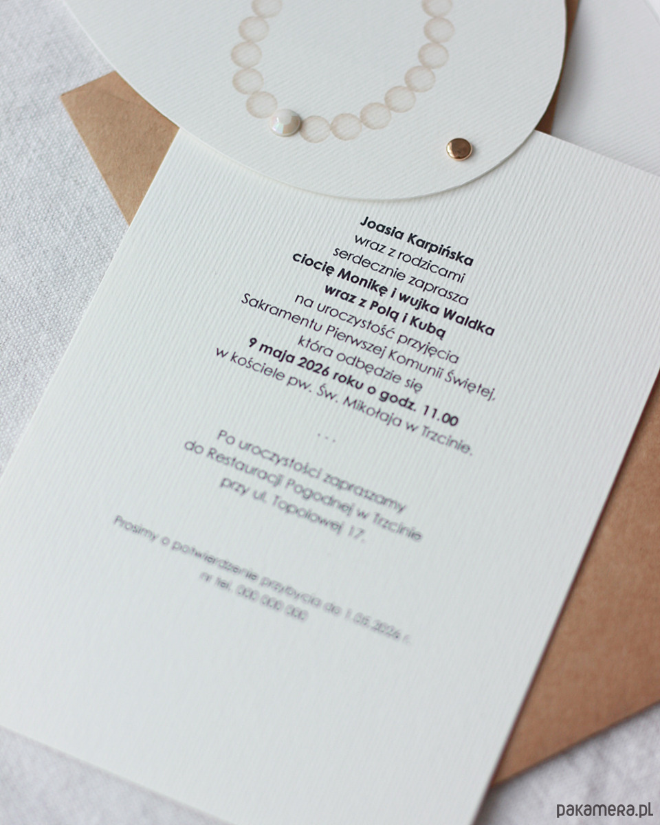Zaproszenie składa się z dwóch kart połączonych ze sobą złotym nitem. Różaniec dodatkowo ozdobiony jest kryształkiem.