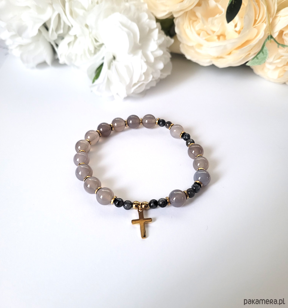 Bransoletka- różaniec na rękę z kamieni naturalnych: Agatu, Labradorytu oraz Hematytu.